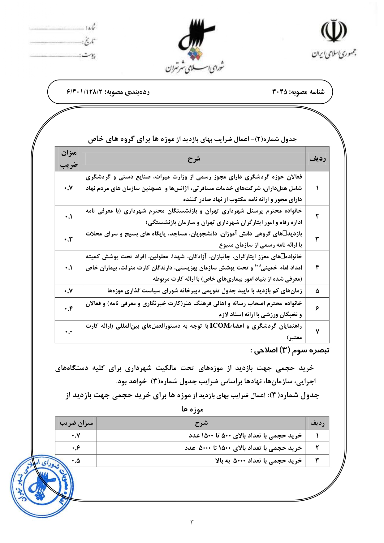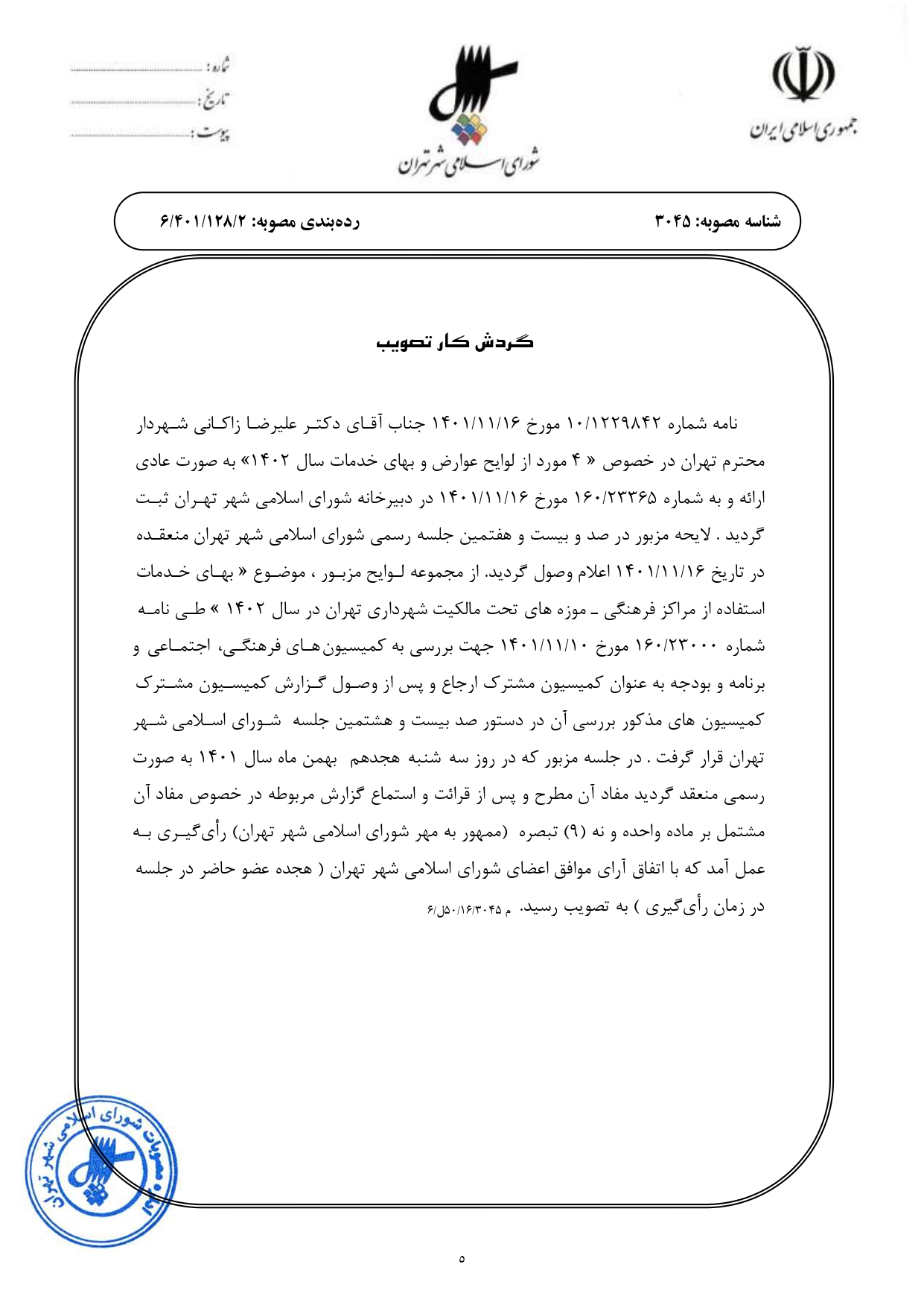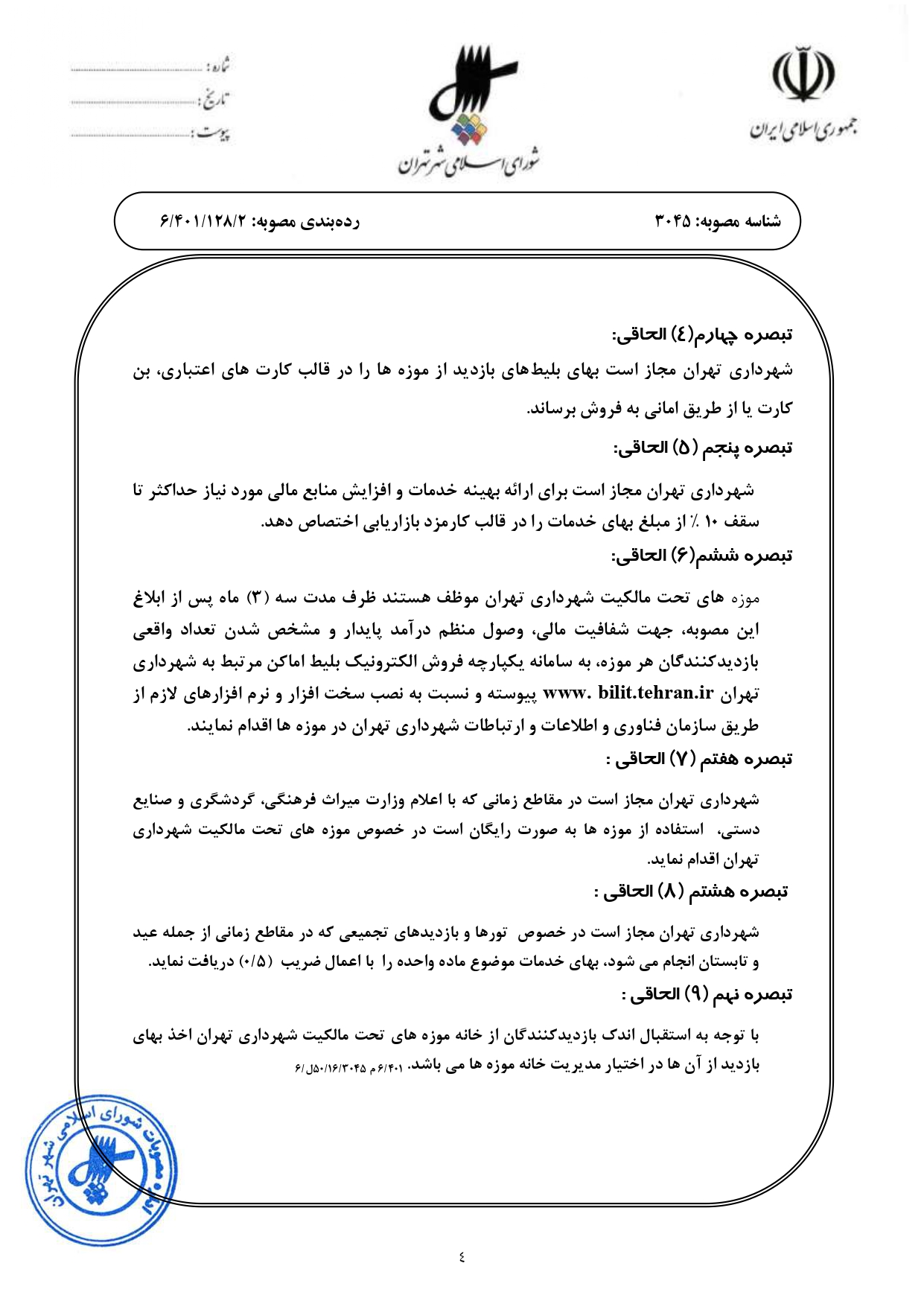 بهاي خدمات استفاده از مراكز فرهنگي - موزههاي تحت مالكيت شهرداري تهران در سال 1402