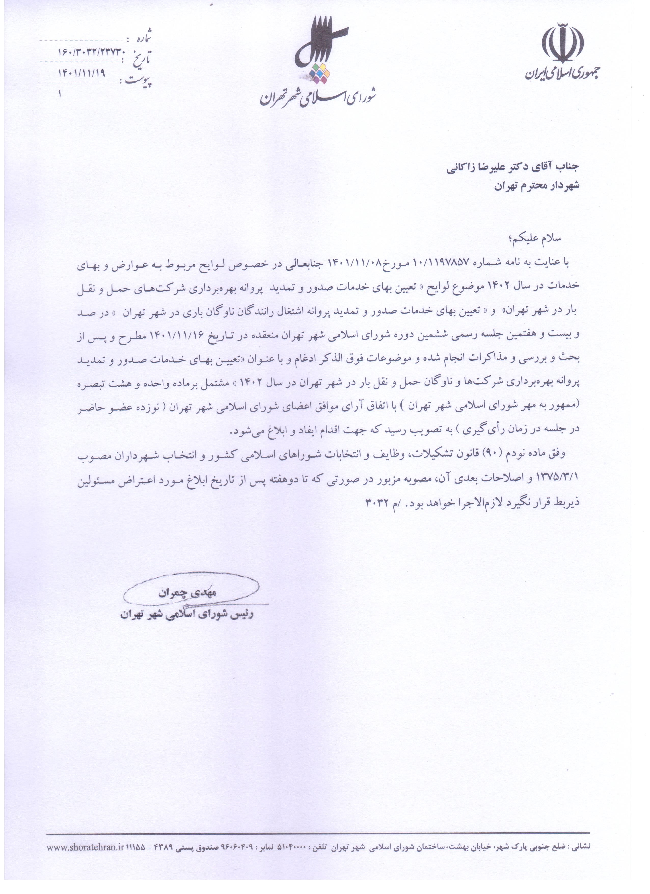 تعيين بهاي خدمات صدور و تمديد پروانه بهرهبرداري شركتها و ناوگان حمل و نقل بار در شهر تهران در سال 1402