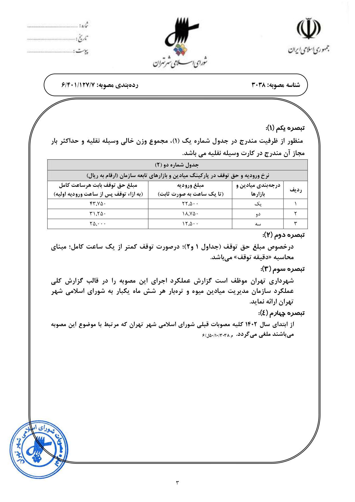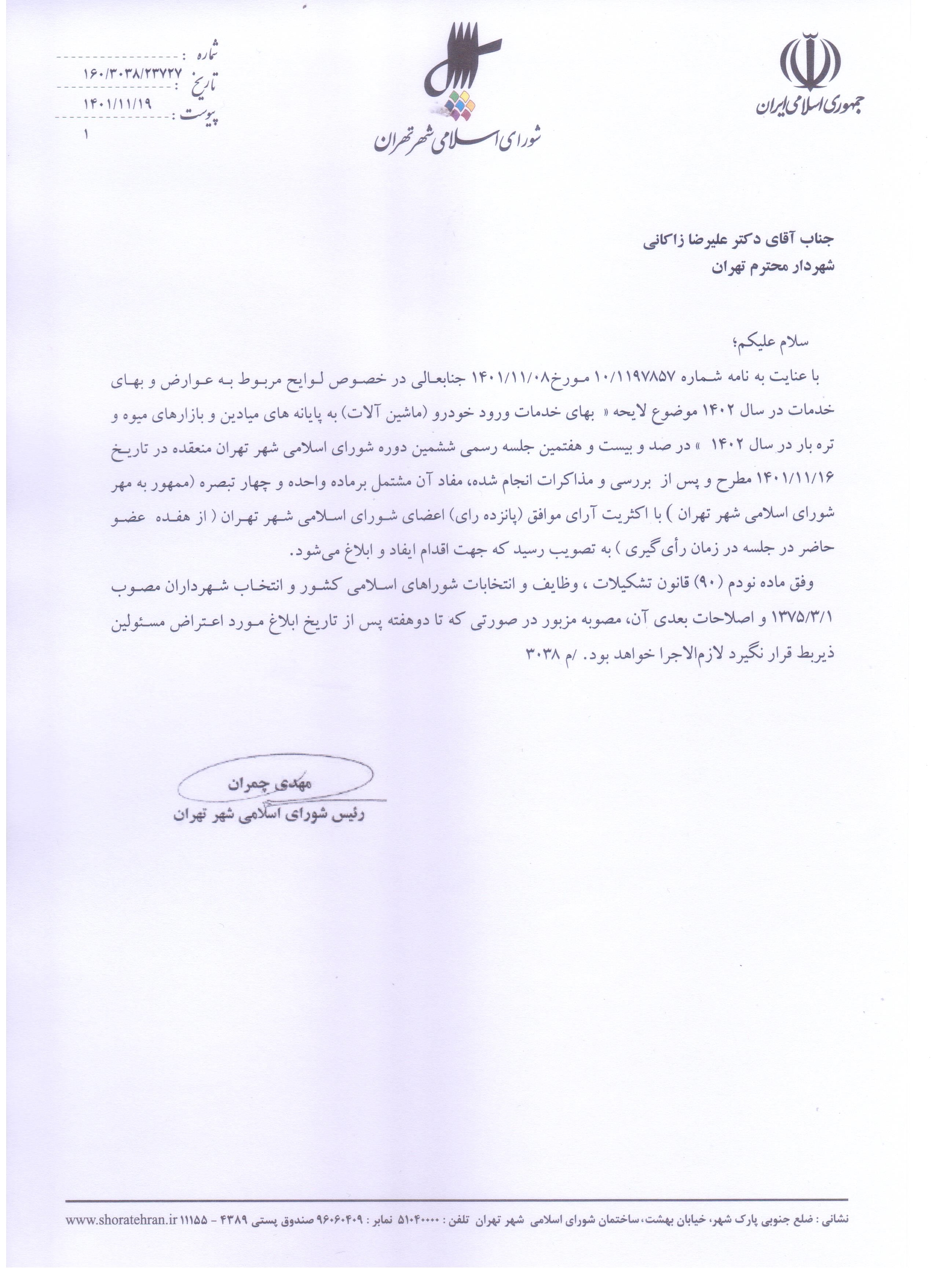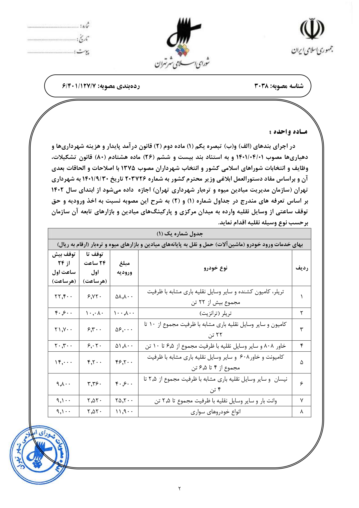بهاي خدمات ورود خودرو (ماشينآلات) به پايانههاي ميادين و بازارهاي ميوه و ترهبار در سال 1402