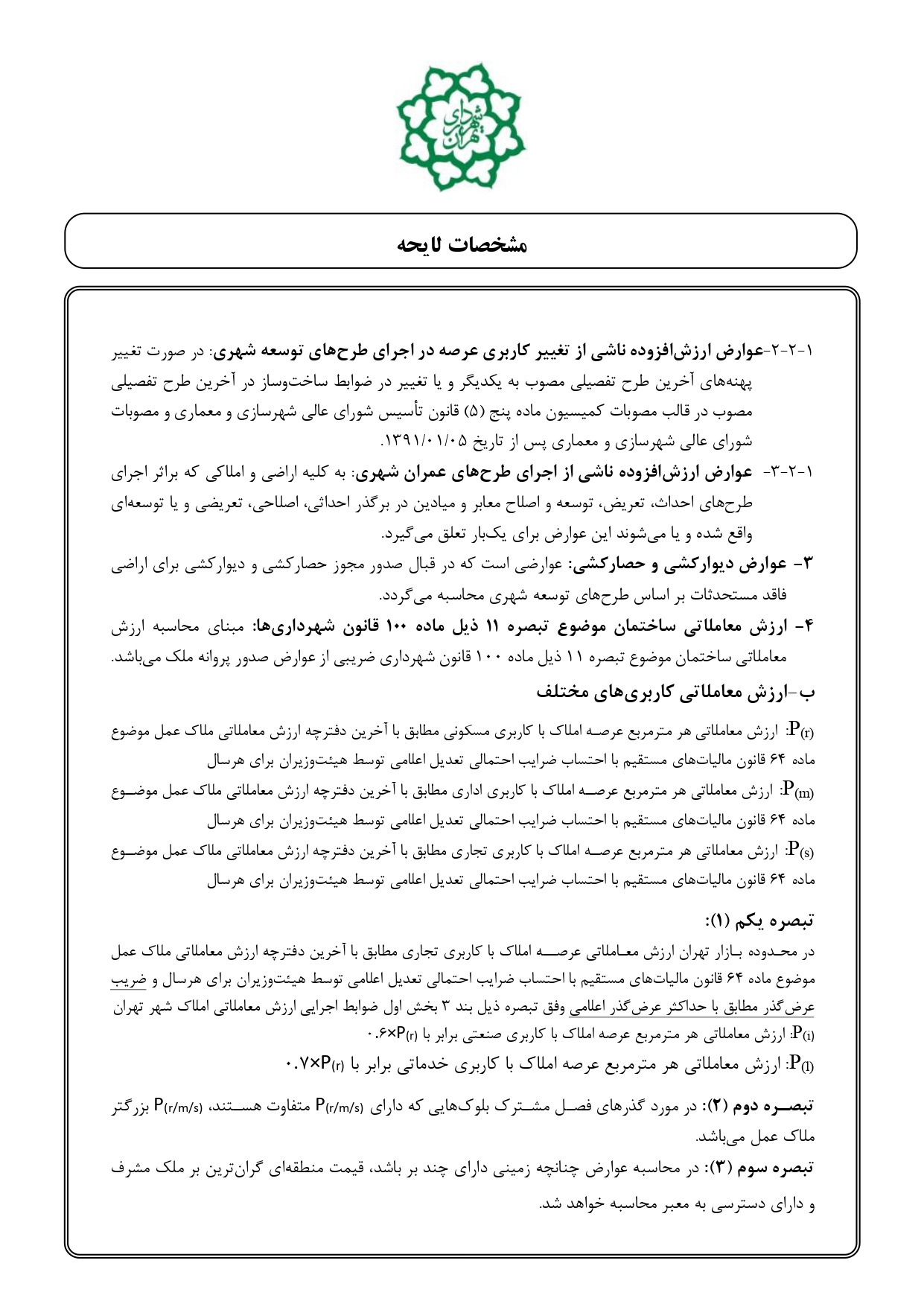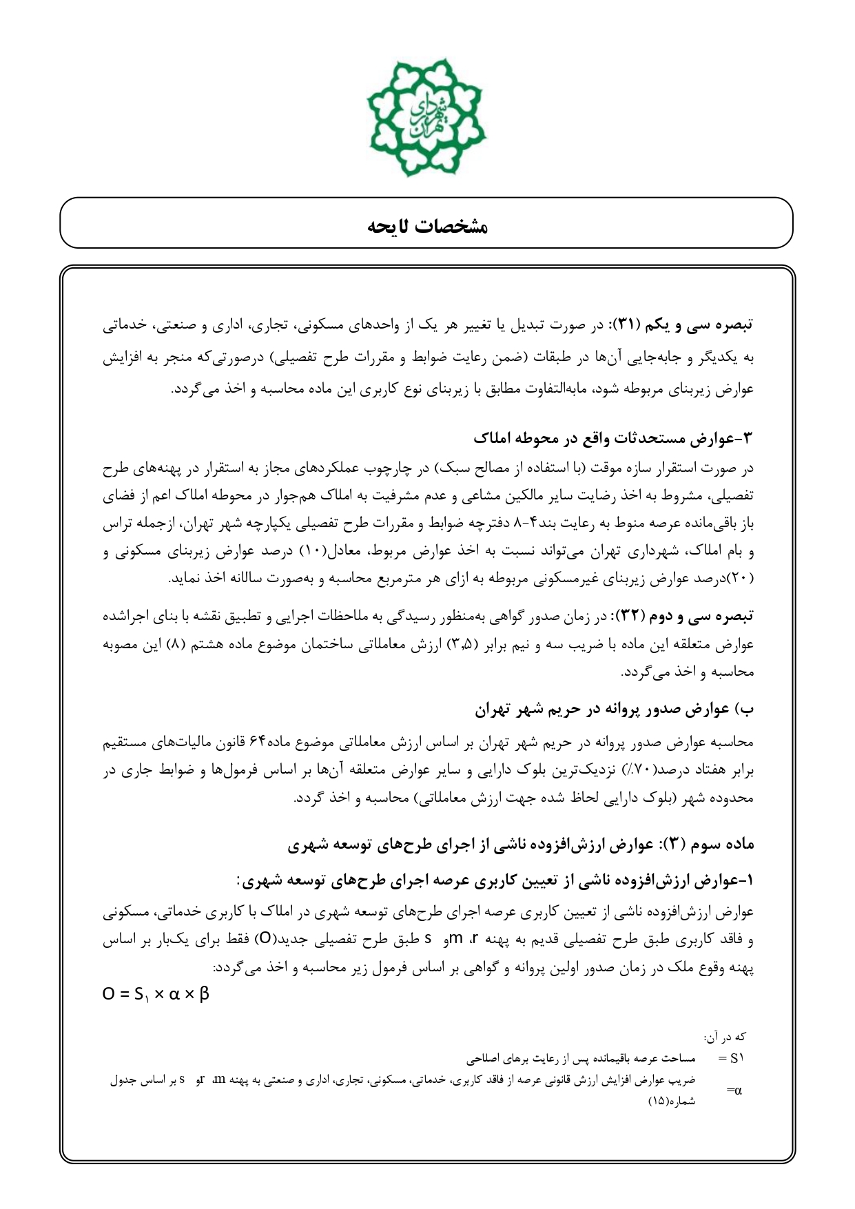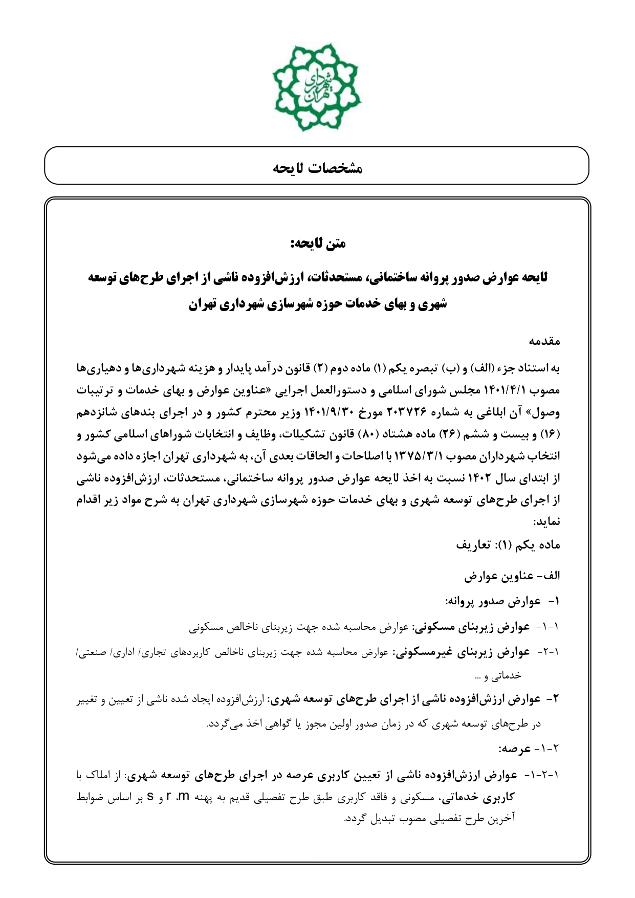 عوارض صدور پروانه ساختماني، مستحدثات، ارزش افزوده ناشي از اجراي طرحهاي توسعه شهري و بهاي خدمات حوزه شهرسازي شهرداري تهران
