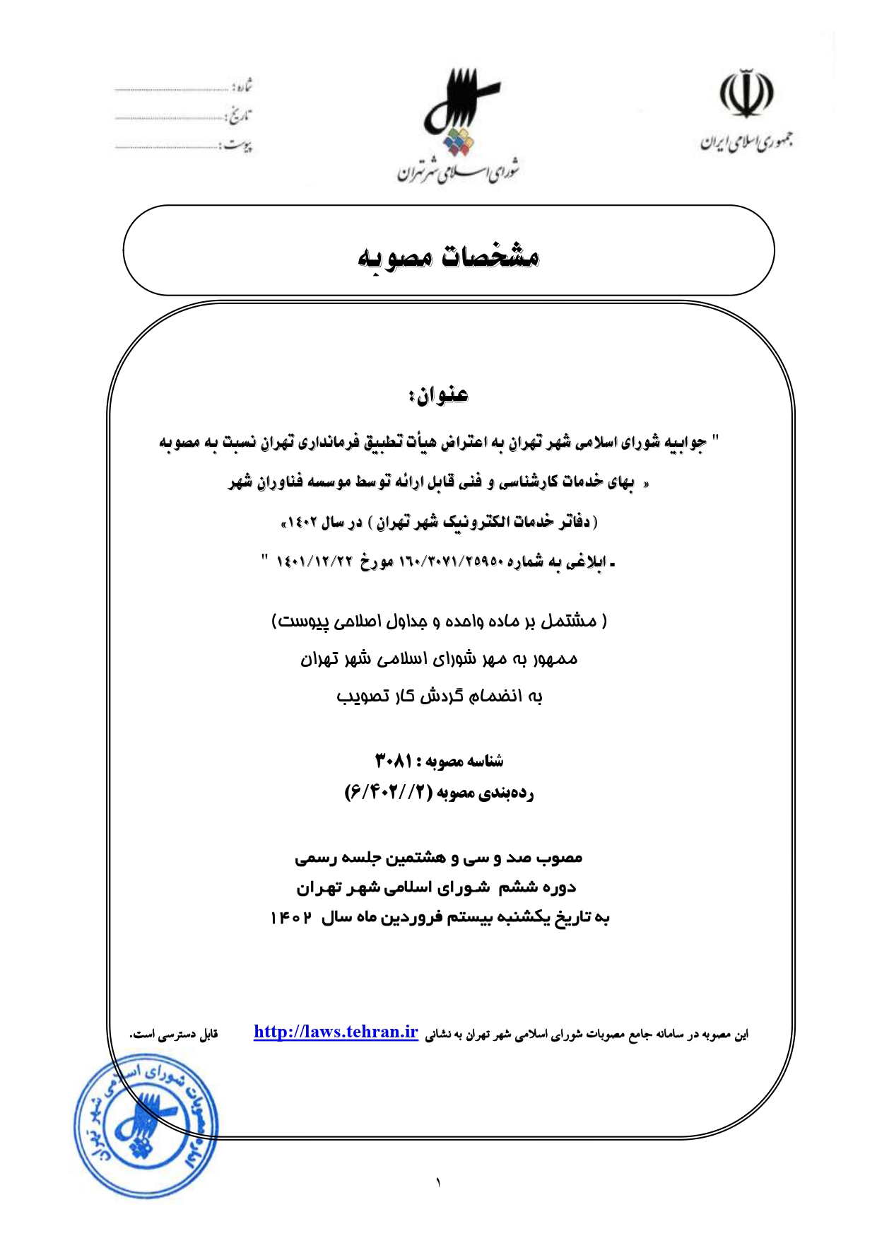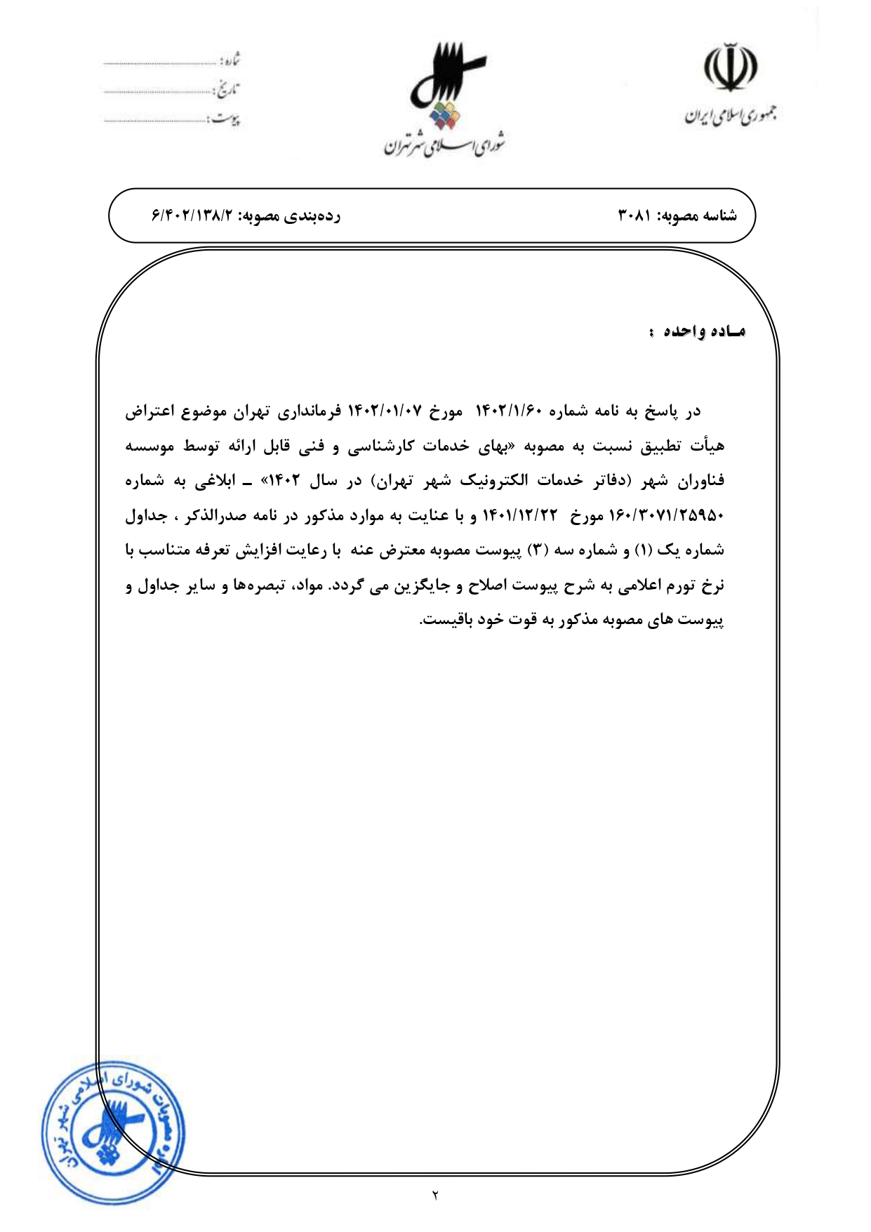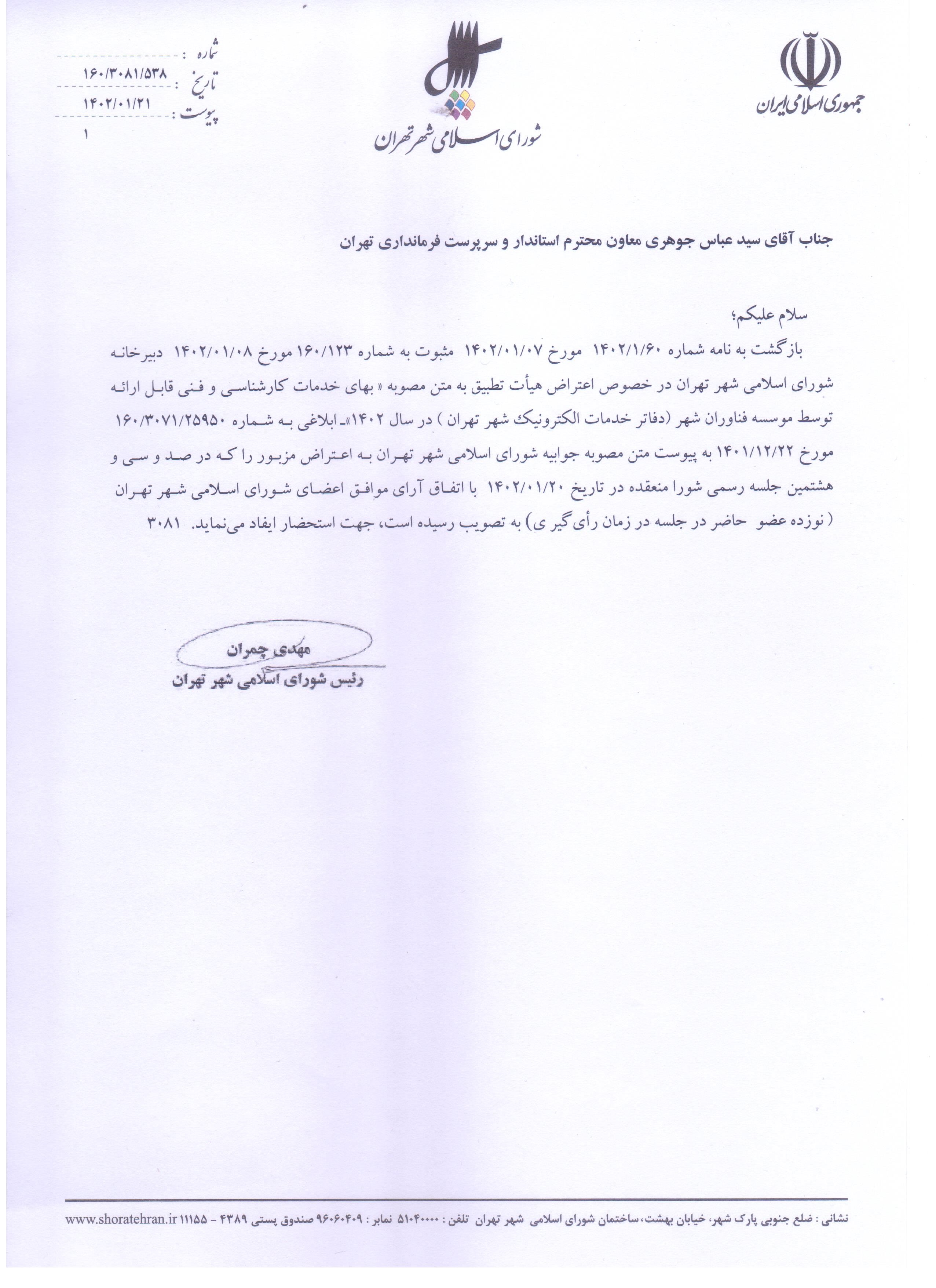 جوابيه شوراي اسلامي شهر تهران به اعتراض هيأت تطبيق فرمانداري تهران نسبت به مصوبه «بهاي خدمات كارشناسي و فني قابل ارائه توسط مؤسسه فناوران شهر (دفاتر خدمات الكترونيك شهر تهران) در سال 1402» ـ ابلاغي به شماره 160/3071/25950 مورخ 1401/12/22 مصوب 1402/01/20
