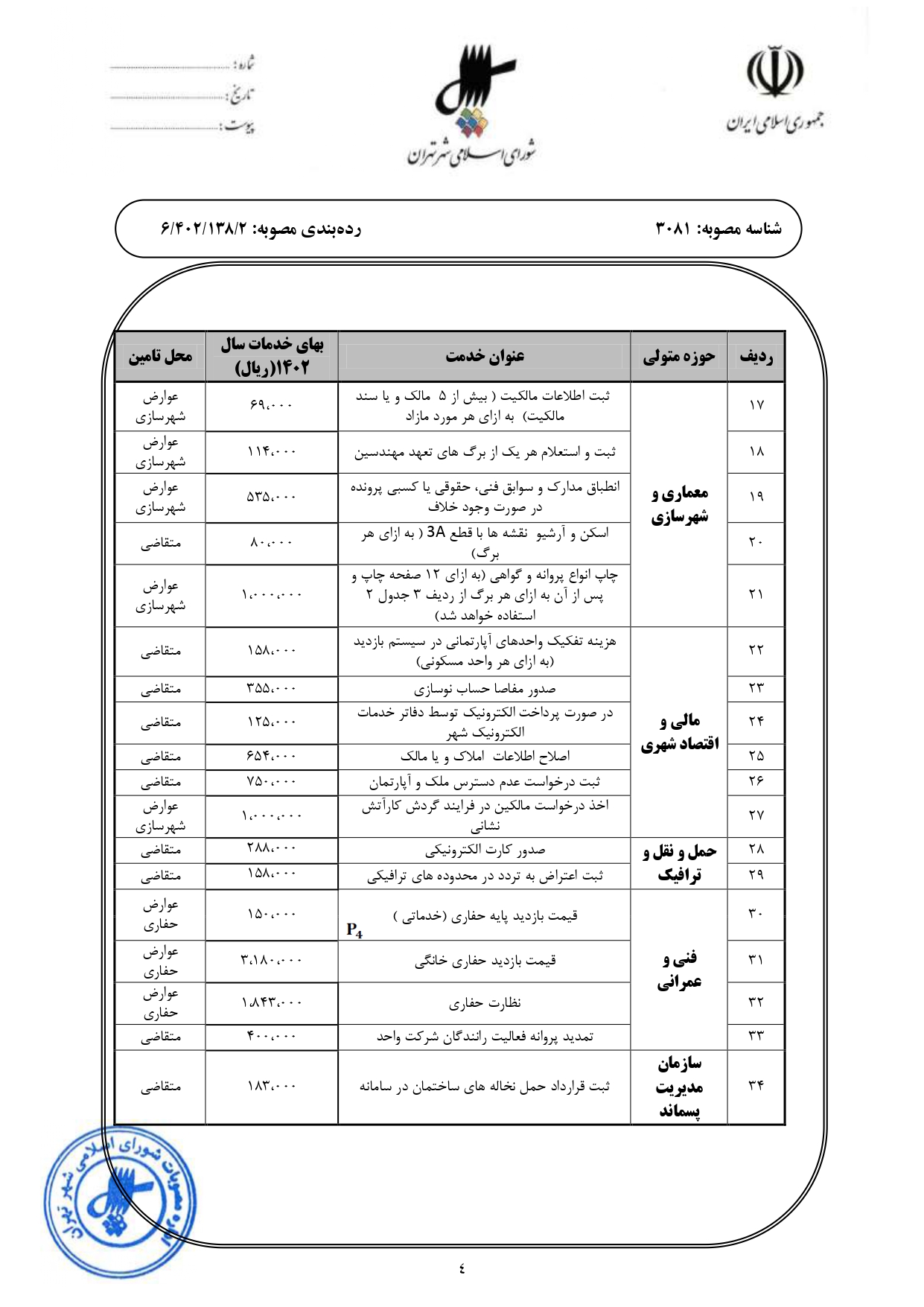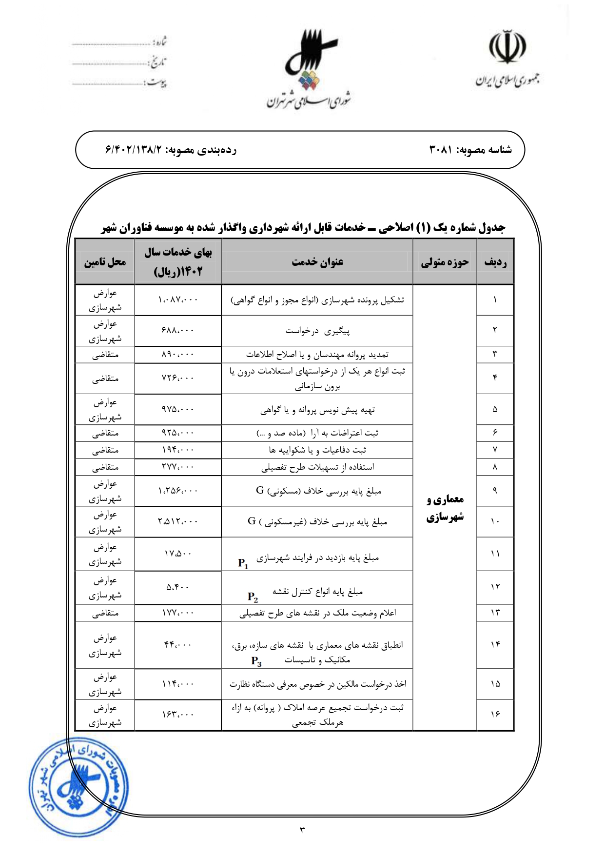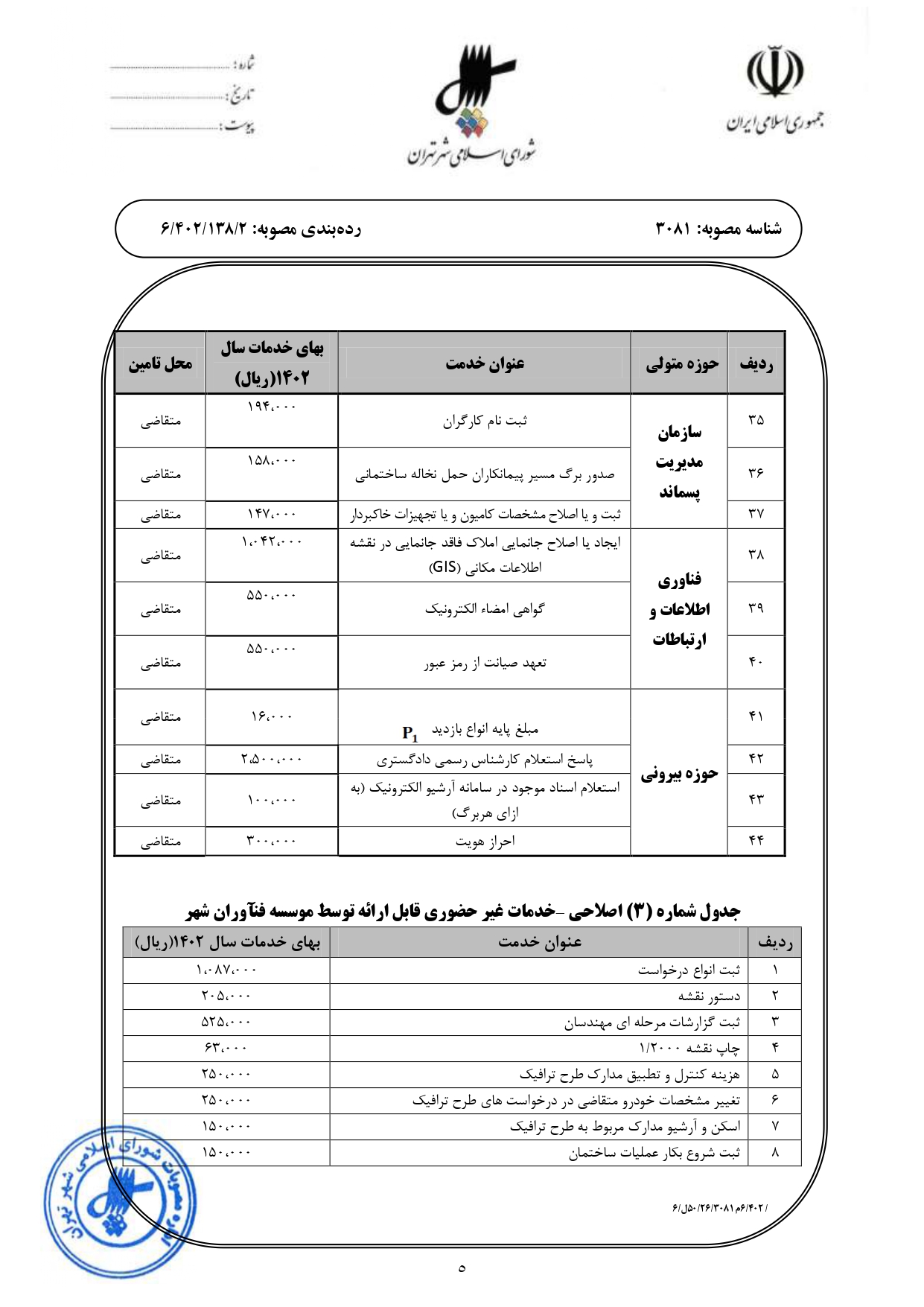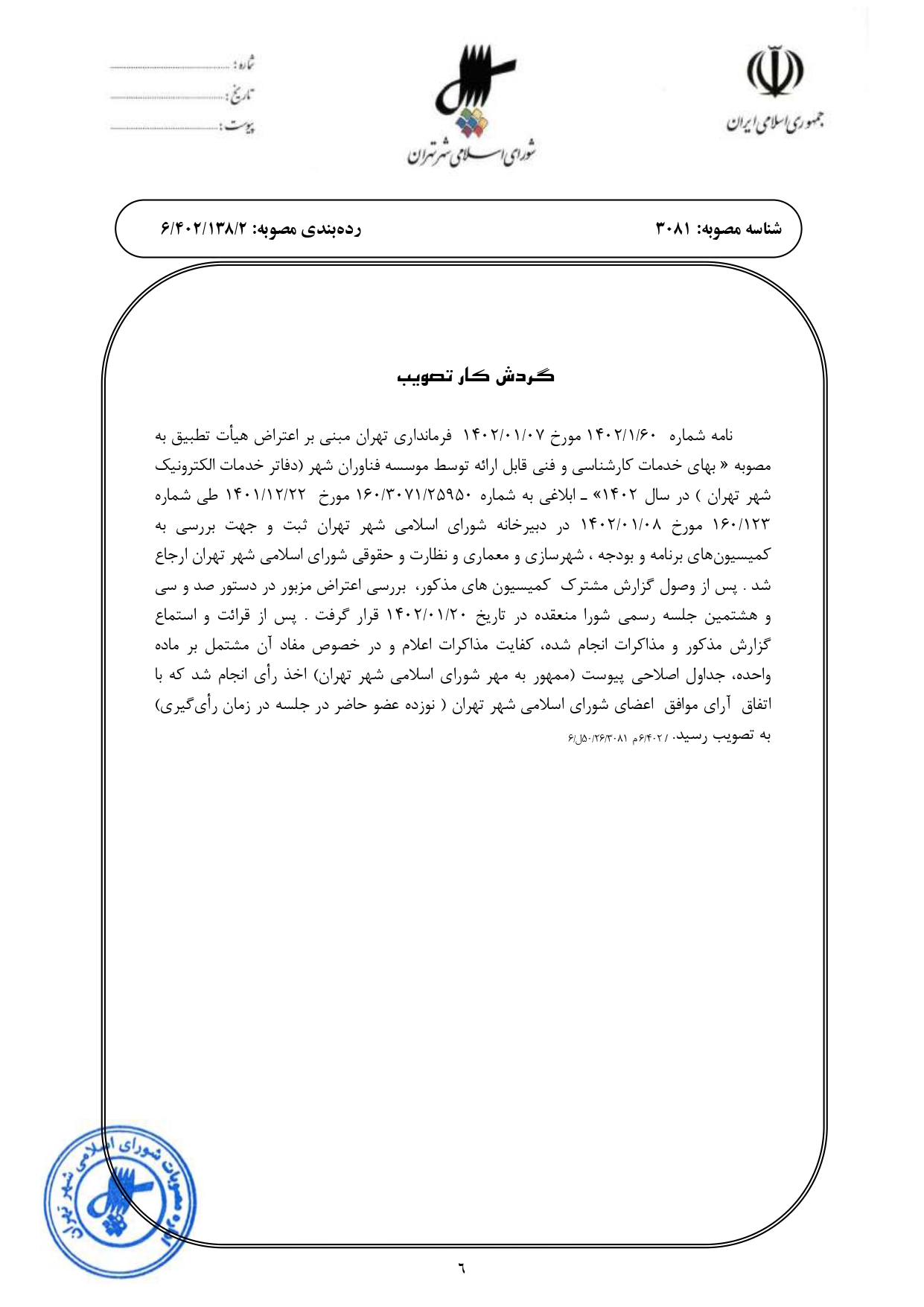 جوابيه شوراي اسلامي شهر تهران به اعتراض هيأت تطبيق فرمانداري تهران نسبت به مصوبه «بهاي خدمات كارشناسي و فني قابل ارائه توسط مؤسسه فناوران شهر (دفاتر خدمات الكترونيك شهر تهران) در سال 1402» ـ ابلاغي به شماره 160/3071/25950 مورخ 1401/12/22 مصوب 1402/01/20