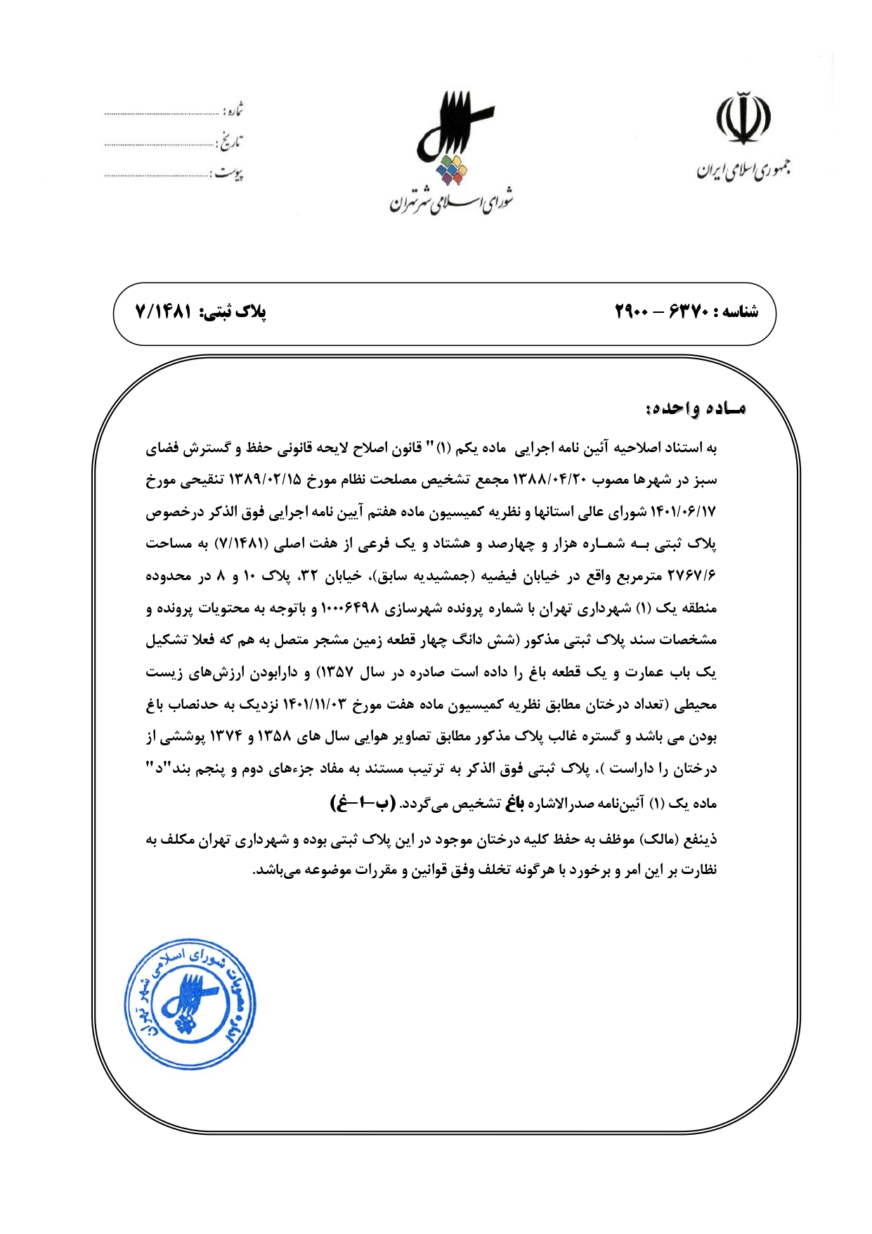 مصوبه شوراي اسلامي شهر تهران در خصوص پلاك ثبتي به شماره هزار و چهارصد و هشتاد و يك فرعي از هفت اصلي (7/1481) واقع در محدوده منطقه يك (1) شهرداري تهران