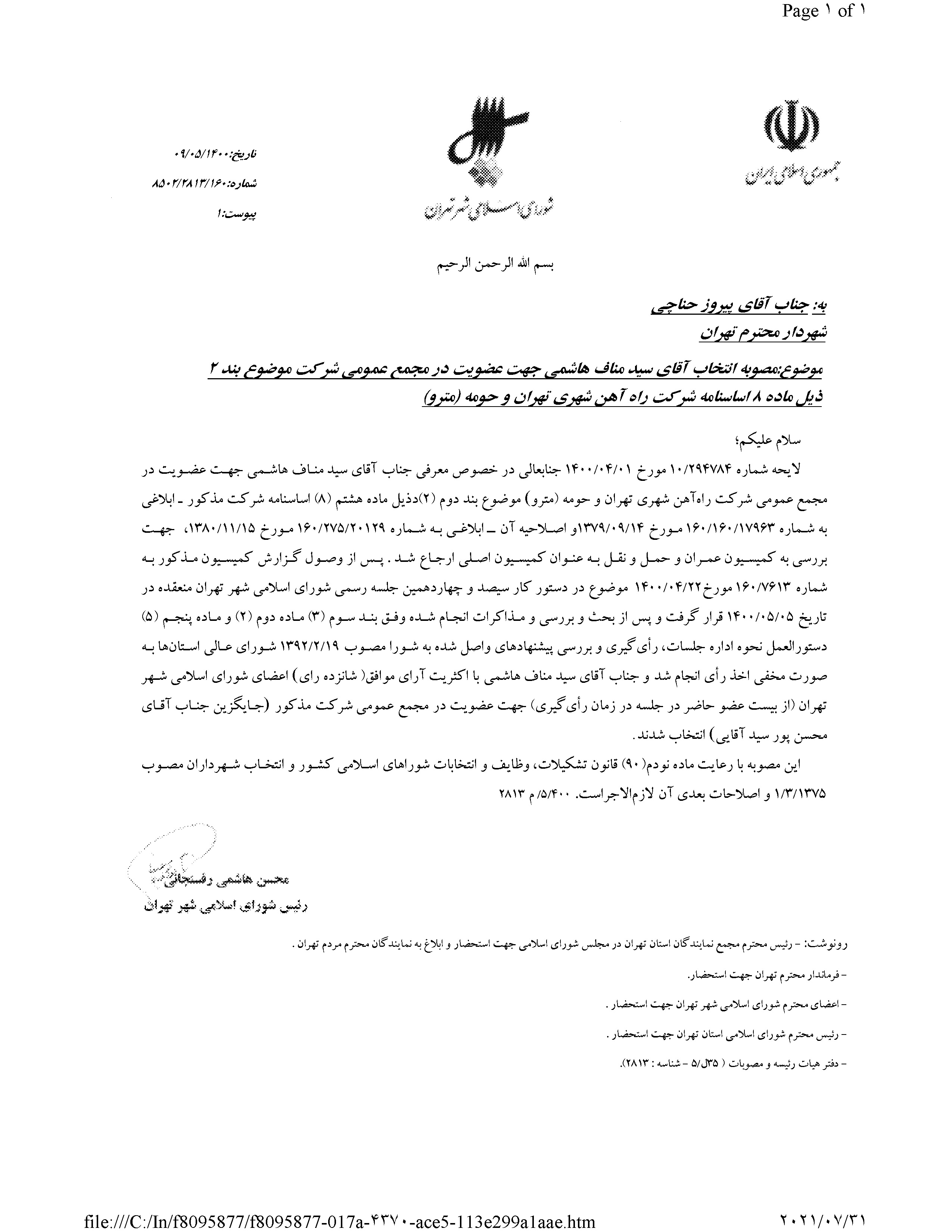 انتخاب آقاي سيد مناف هاشمي جهت عضويت در مجمع عمومي شركت موضوع بند 2 ذيل ماده 8 اساسنامه شركت راهآهن شهري تهران و حومه (مترو)