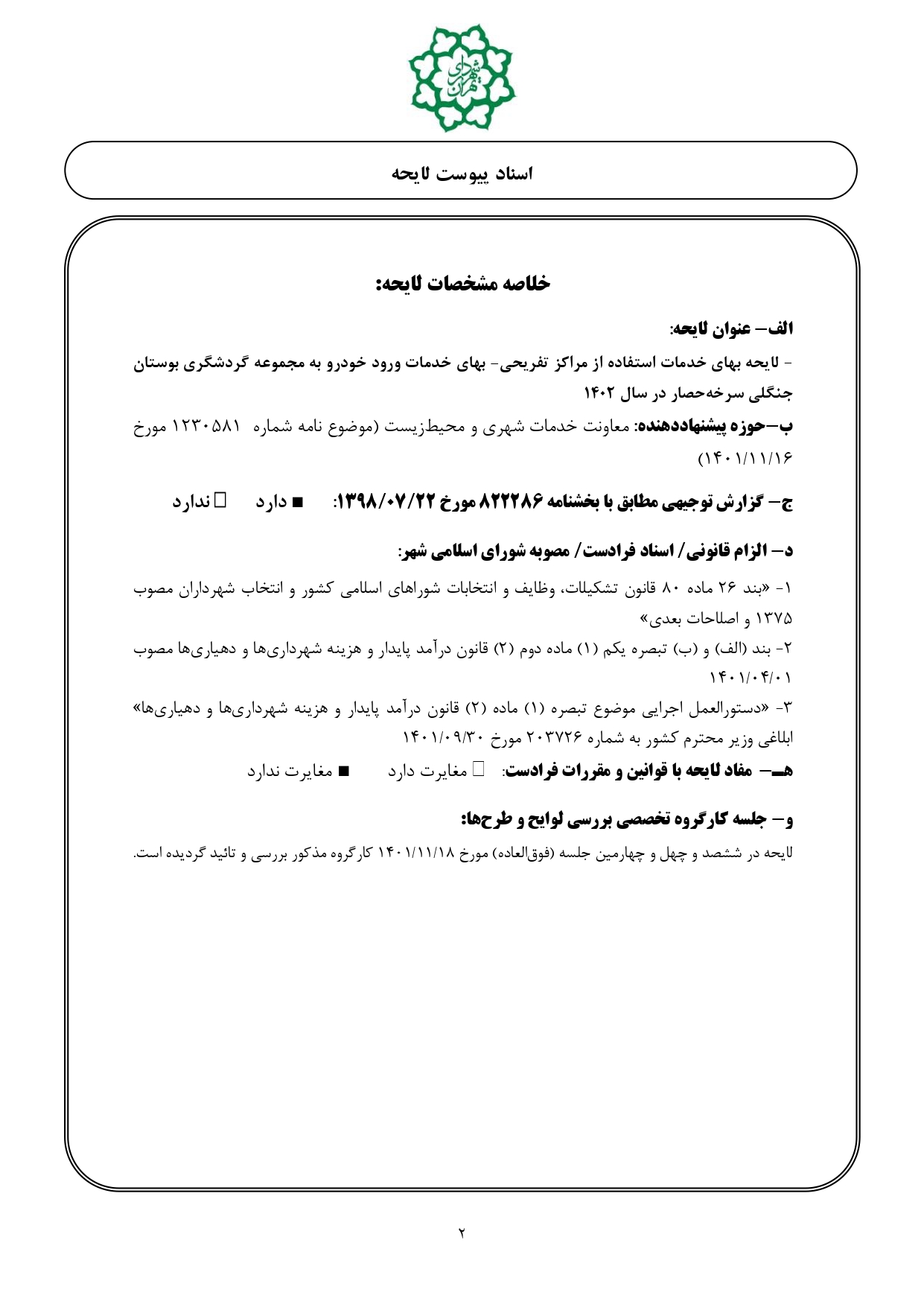 بهاي خدمات استفاده از مراكز تفريحي- بهاي خدمات ورود خودرو به مجموعه گردشگري بوستان جنگلي سرخهحصار در سال 1402
