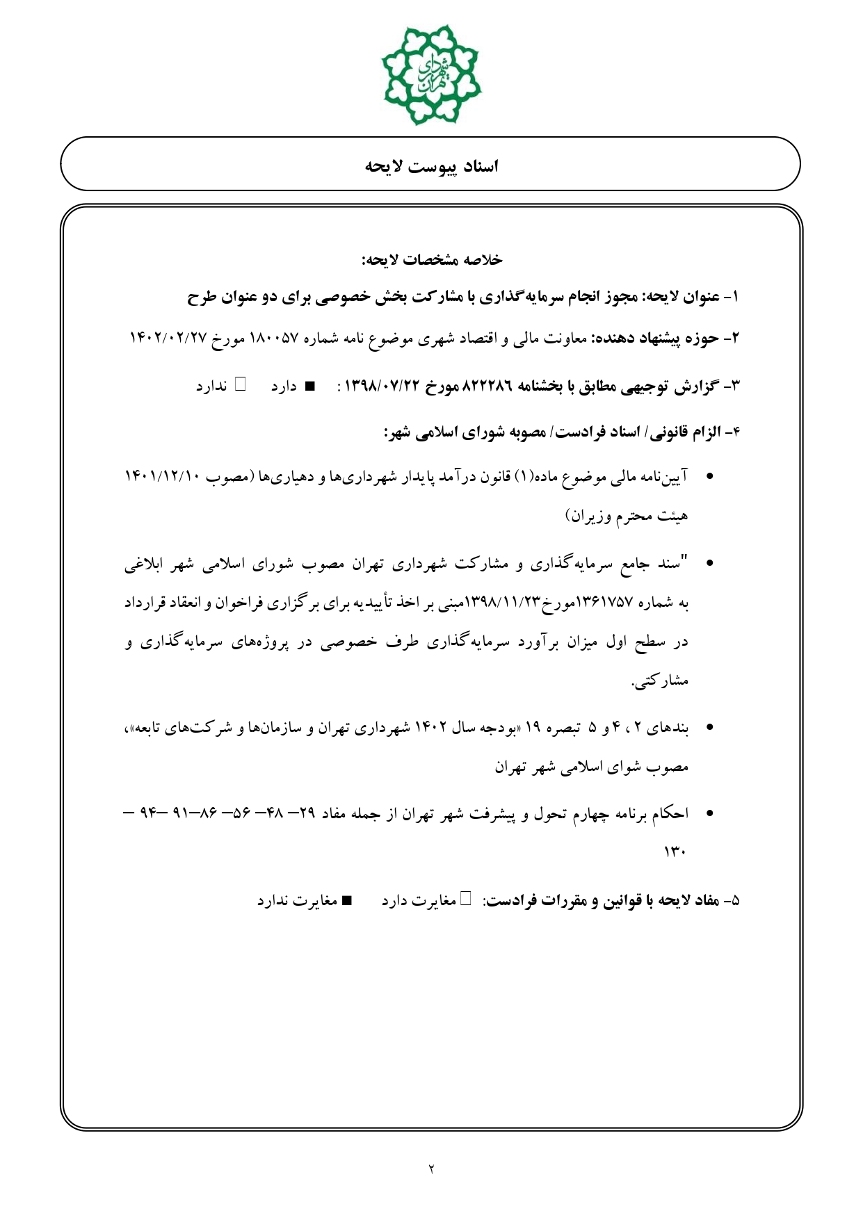 مجوز انجام سرمايهگذاري با مشاركت بخش خصوصي براي دو عنوان طرح