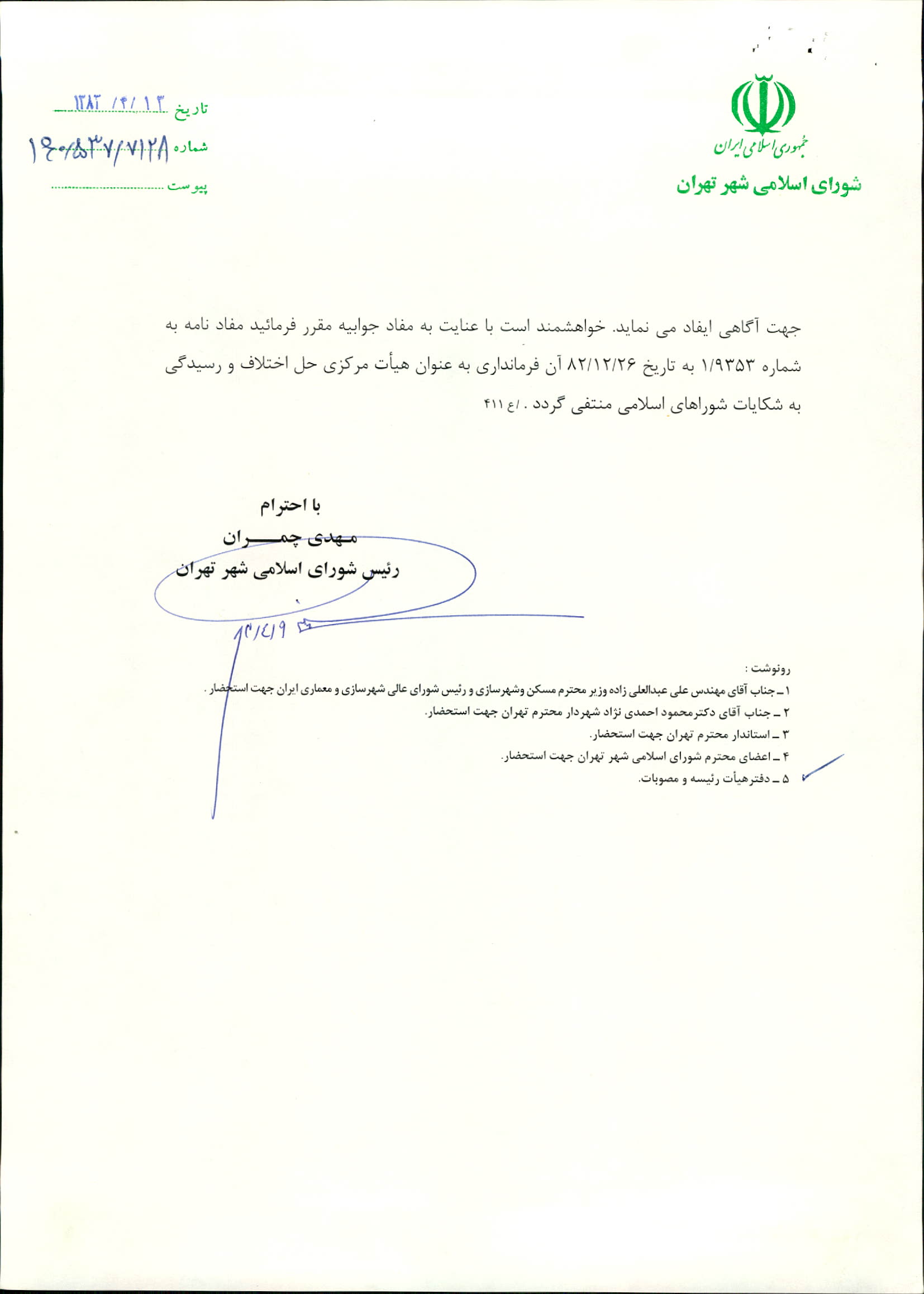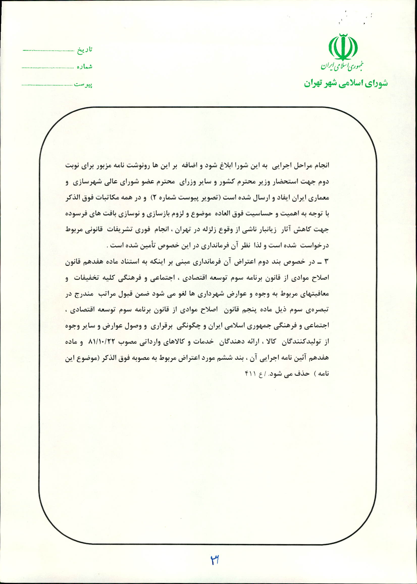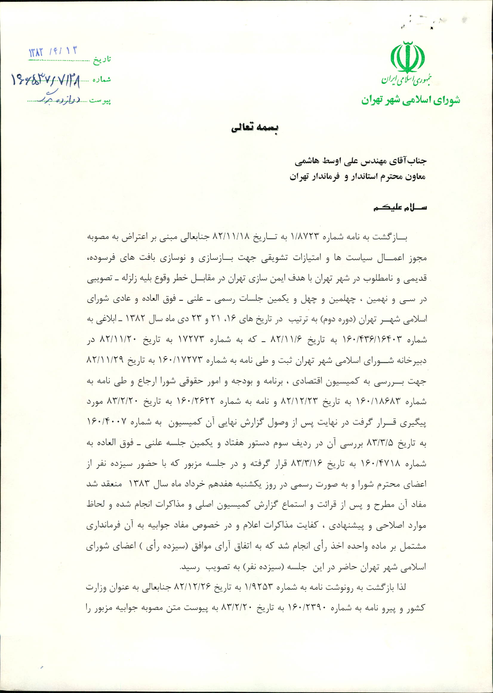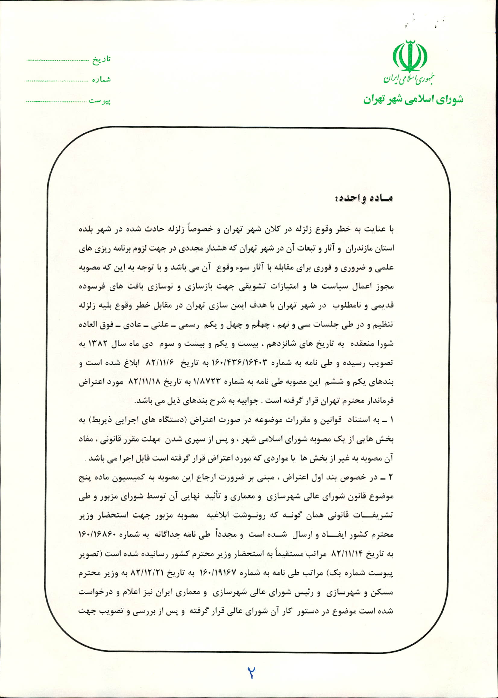 جوابيه شوراي اسلامي شهر تهران به اعتراض فرمانداري تهران به شماره 1/8723 به تاريخ 82/11/18 به مصوبه «مجوز اعمال سياست ها و امتيازات تشويقي جهت بازسازي و نوسازي بافتهاي فرسوده، قديمي و نامطلوب در شهر تهران با هدف ايمن سازي تهران در مقابل خطر وقوع بليه زلزله» تصويبي در جلسات 39 و 40 و 41 شوراي اسلامي شهر تهران- ابلاغي به شماره 160/436/16403 به تاريخ 82/11/6