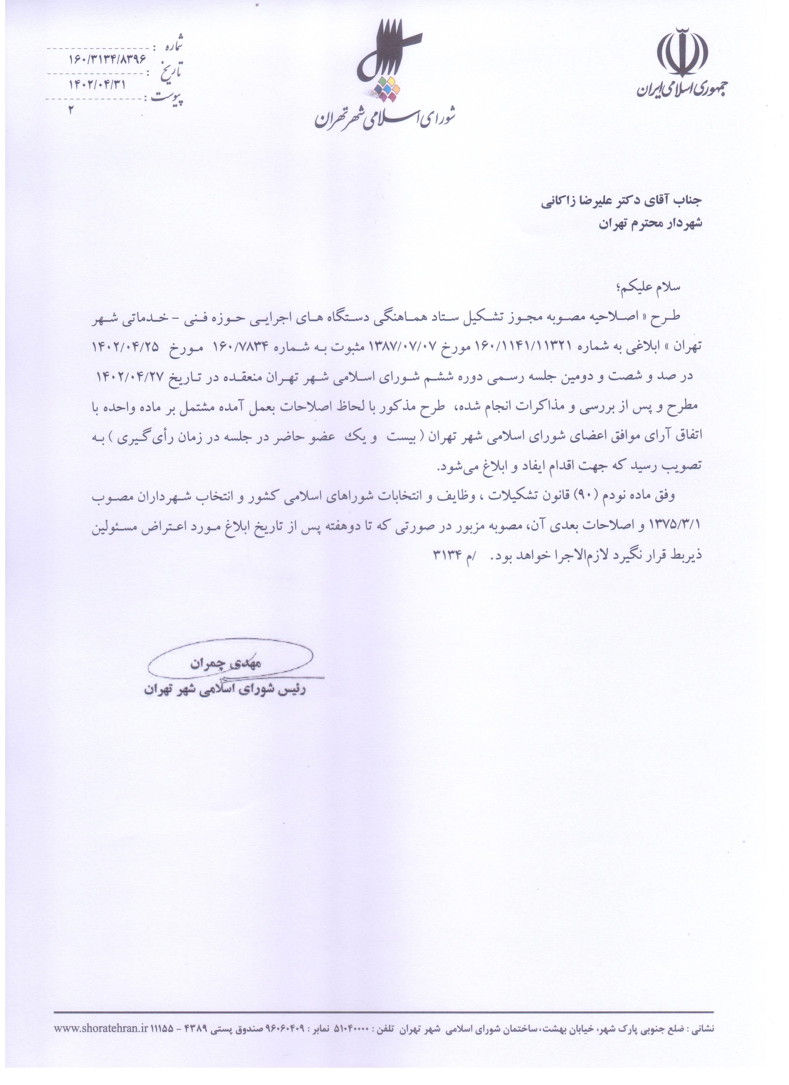 اصلاحيه مصوبه «مجوز تشكيل ستاد هماهنگي دستگاه هاي اجرايي حوزه فني - خدماتي شهر تهران» ابلاغي به شماره 160/1141/11321 مورخ 1387/07/07