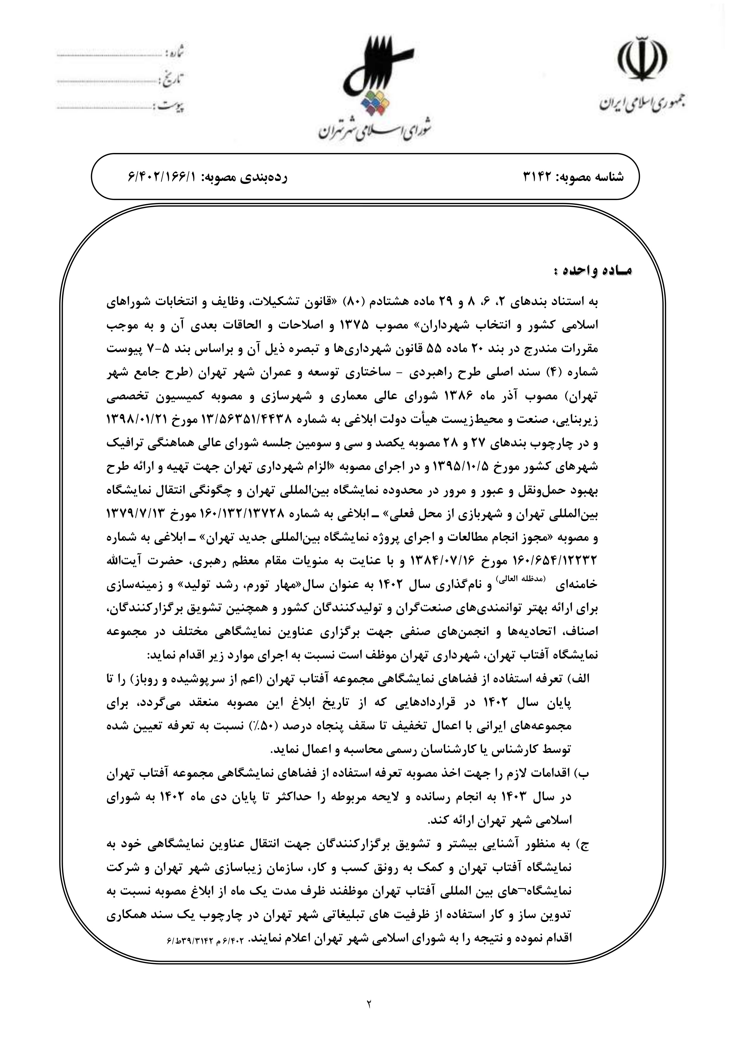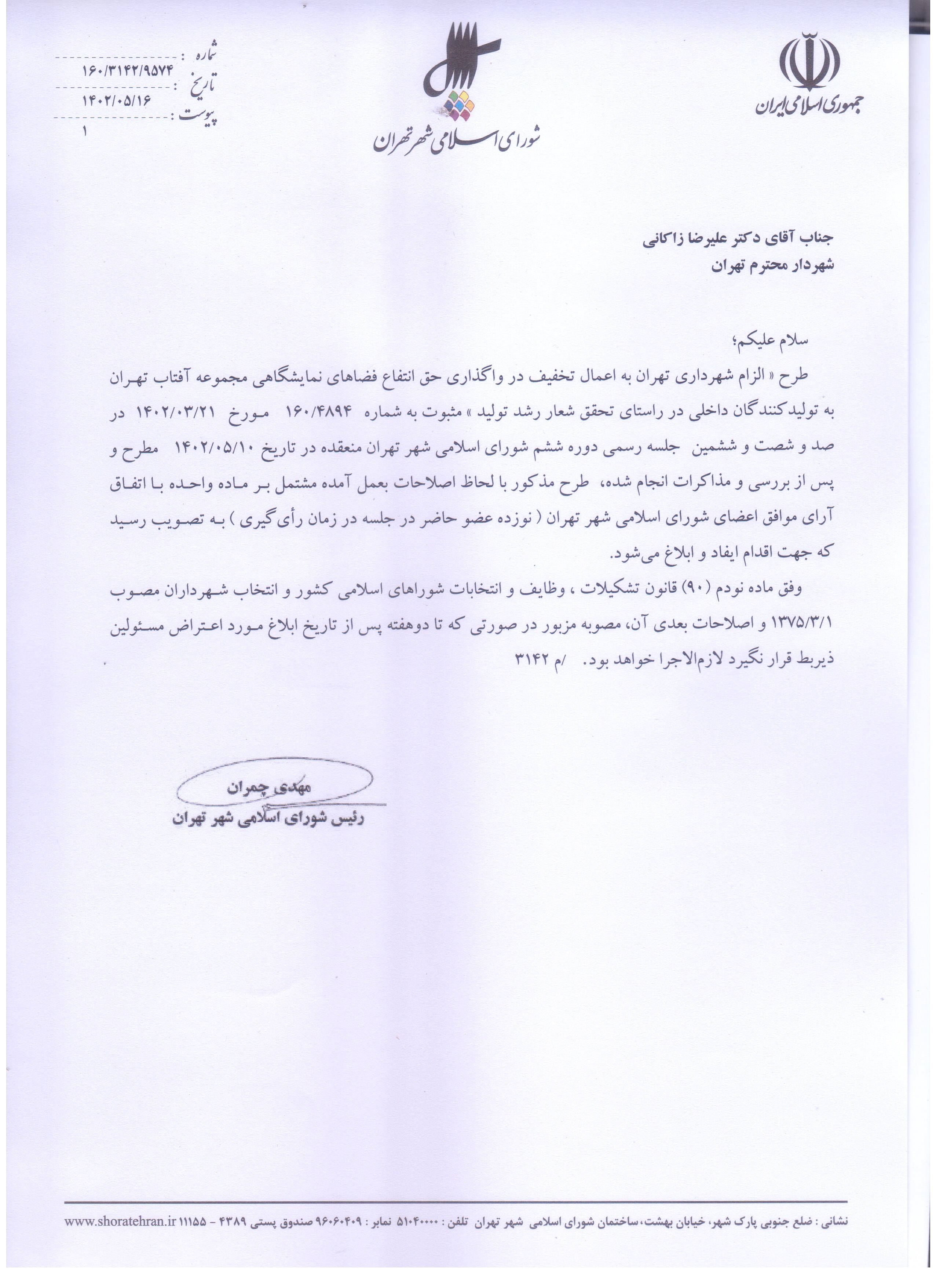الزام شهرداري تهران به اعمال تخفيف در واگذاري حق انتفاع فضاهاي نمايشگاهي مجموعه آفتاب تهران به توليدكنندگان داخلي در راستاي تحقق شعار رشد توليد