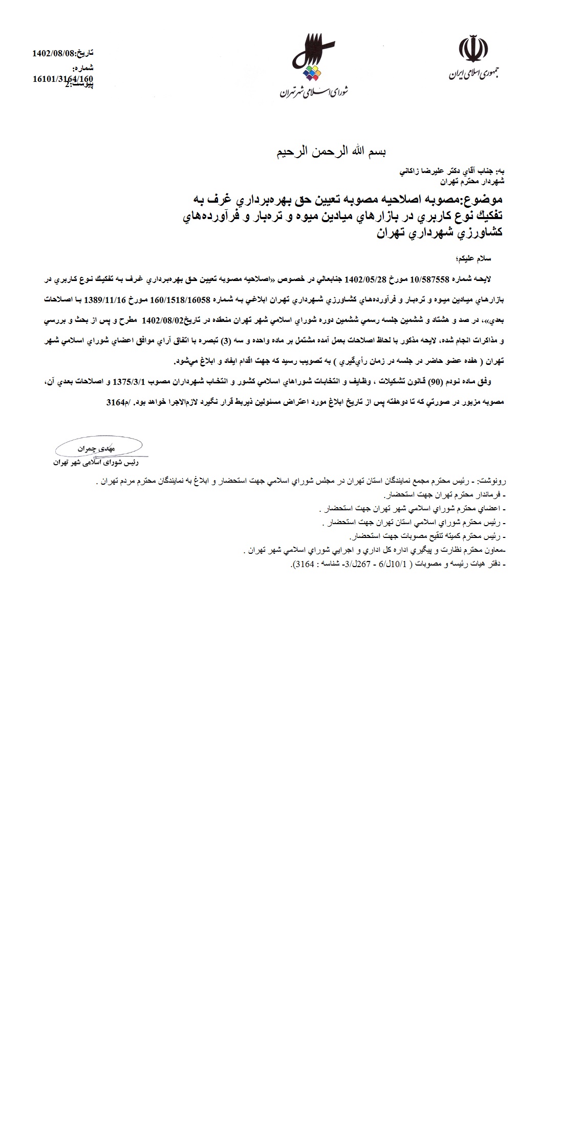 اصلاحيه مصوبه تعيين حق بهرهبرداري غرف به تفكيك نوع كاربري در بازارهاي ميادين ميوه و ترهبار و فرآوردههاي كشاورزي شهرداري تهران ابلاغي به شماره 160/1518/16058 مورخ 1389/11/16 با اصلاحات بعدي
