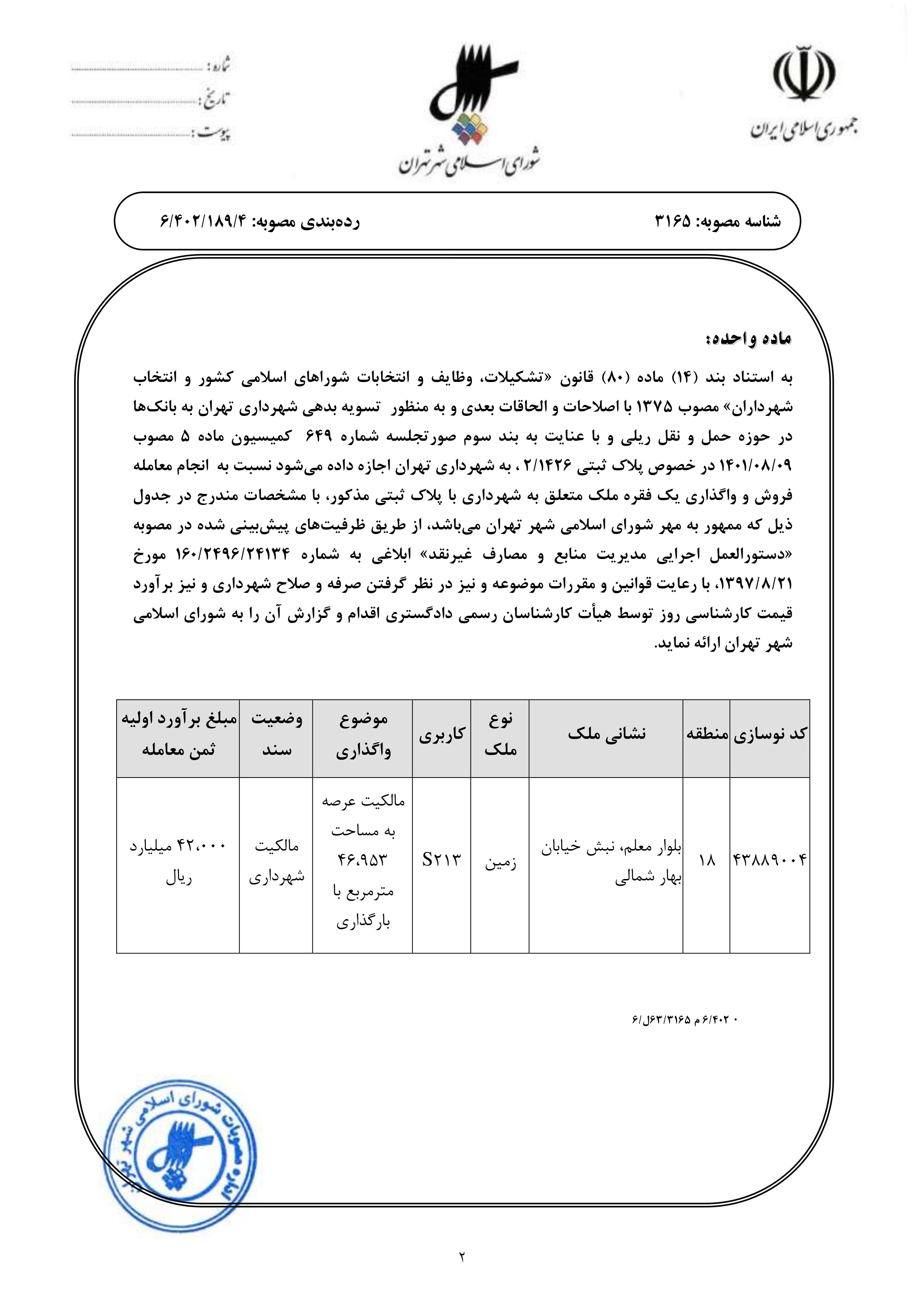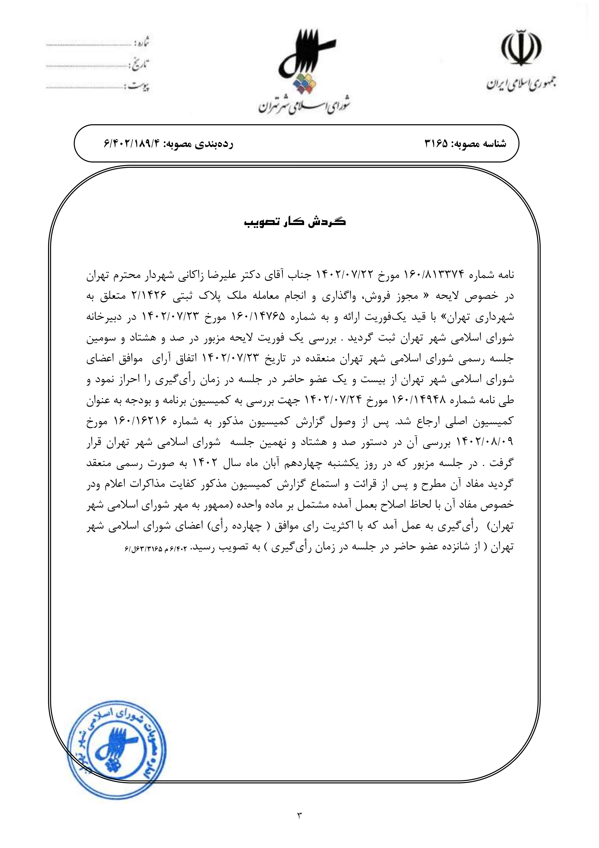 مجوز فروش، واگذاري و انجام معامله ملك پلاك ثبتي 2/1426 متعلق به شهرداري تهران