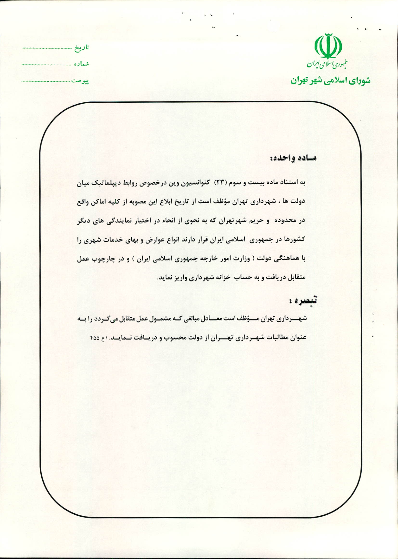 مجوز اخذ عوارض و بهاي خدمات از نمايندگيهاي كشورهاي خارجي در ايران
