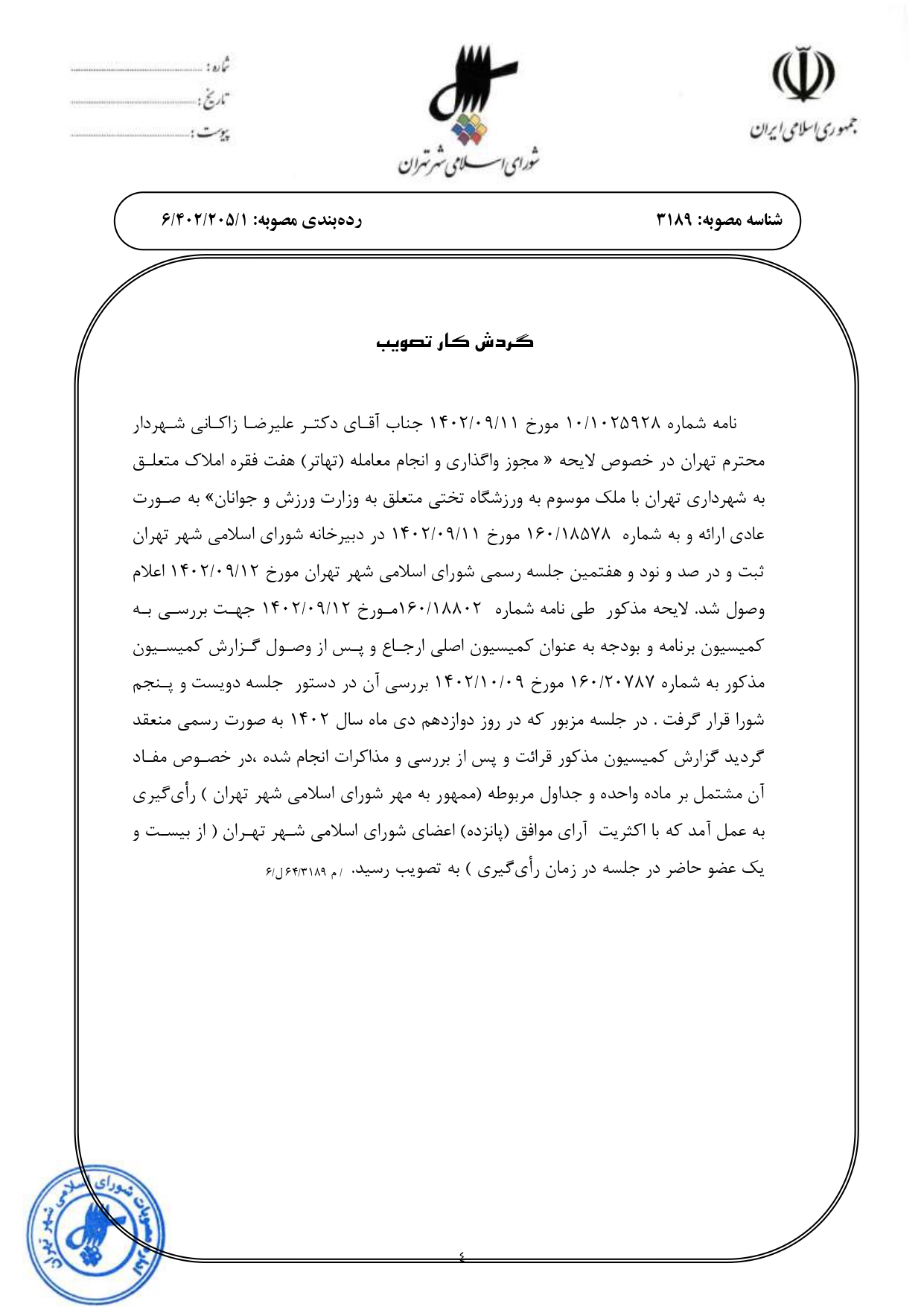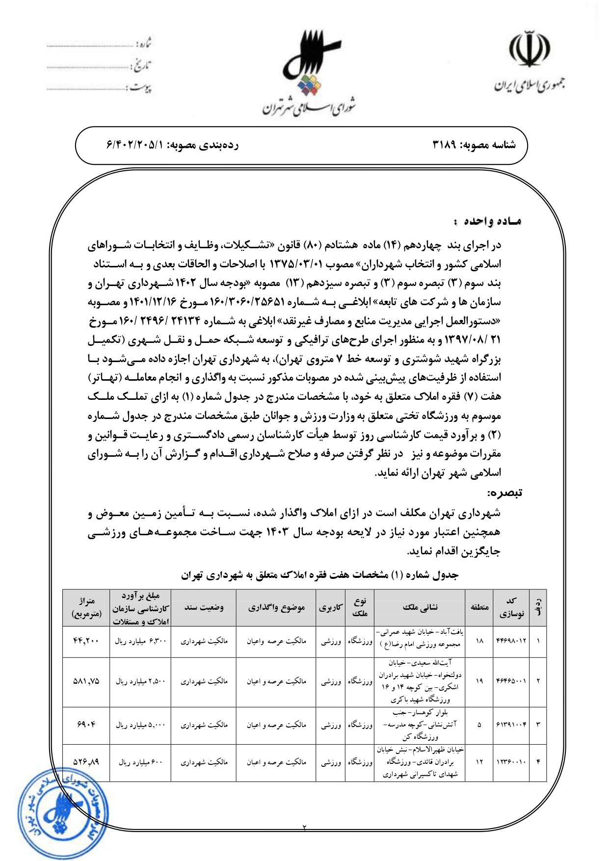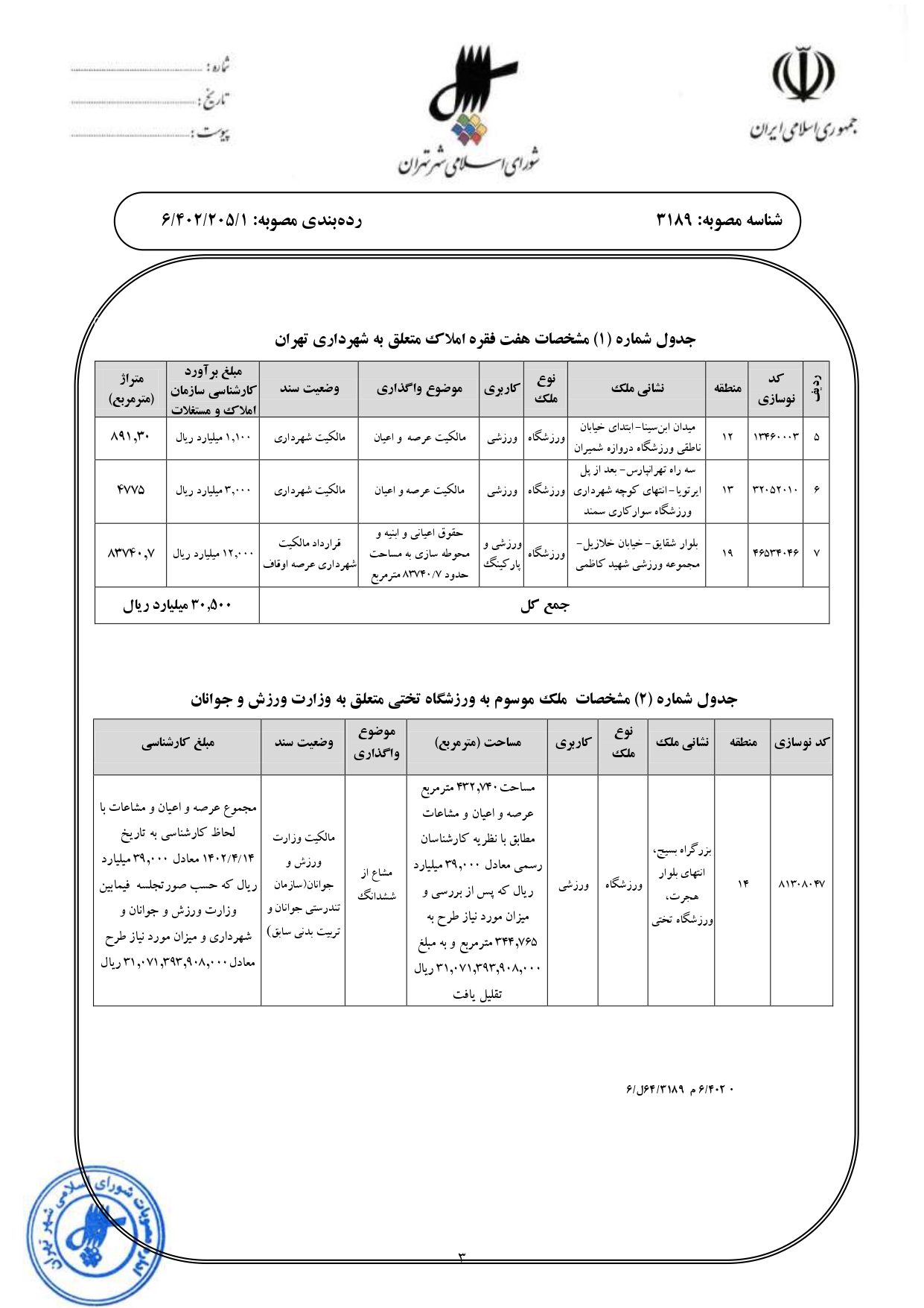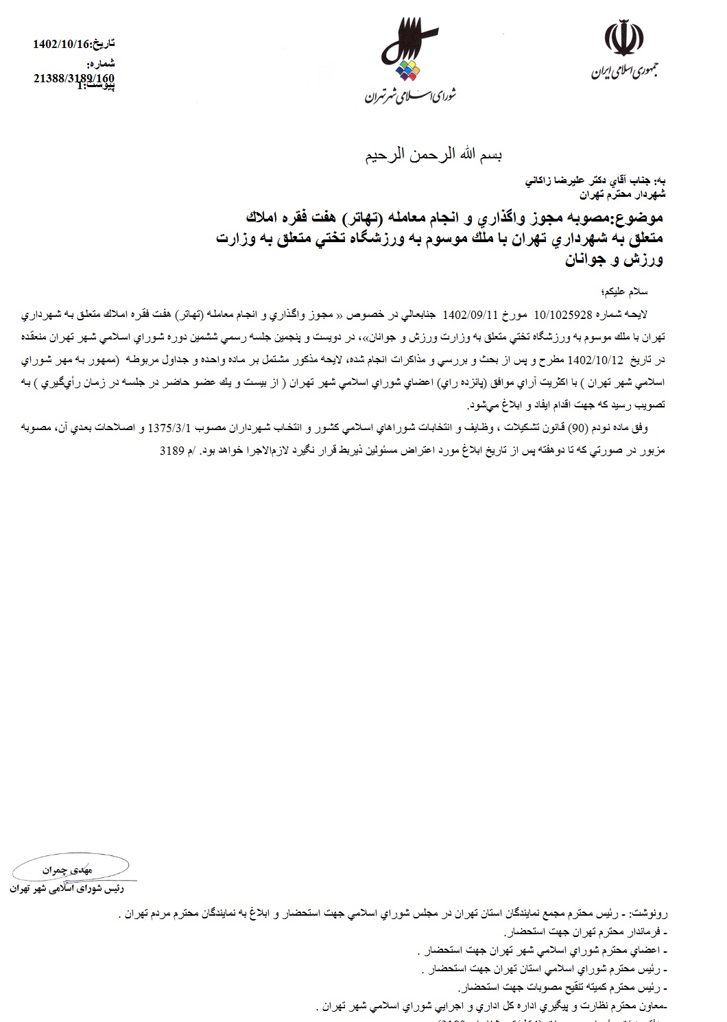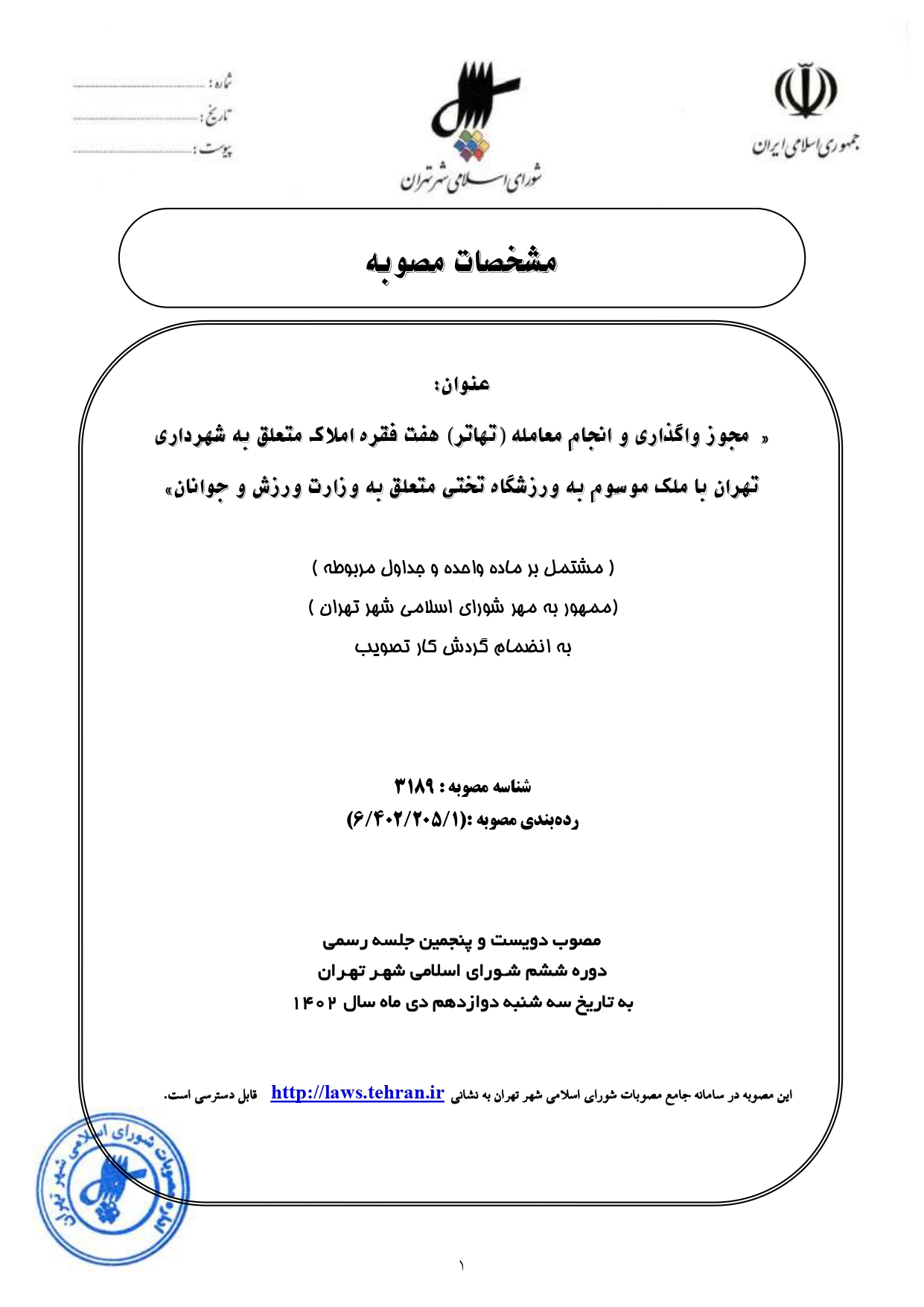 مجوز واگذاري و انجام معامله (تهاتر) هفت فقره املاك متعلق به شهرداري تهران با ملك موسوم به ورزشگاه تختي متعلق به وزارت ورزش و جوانان