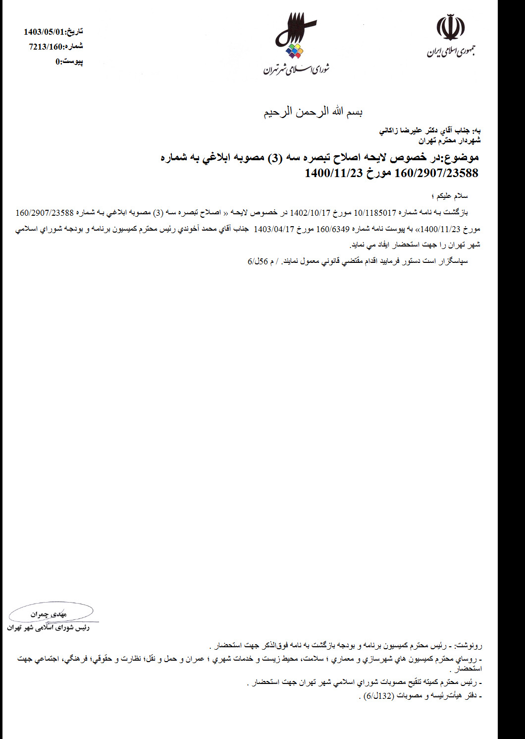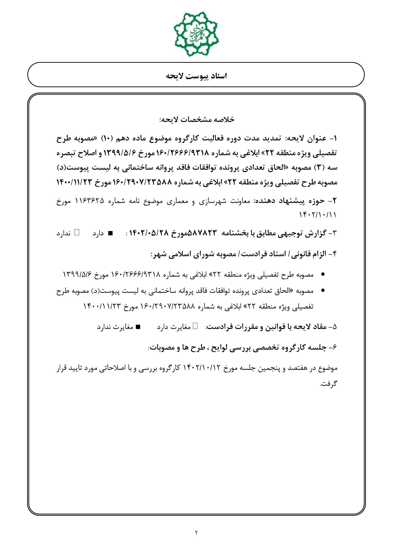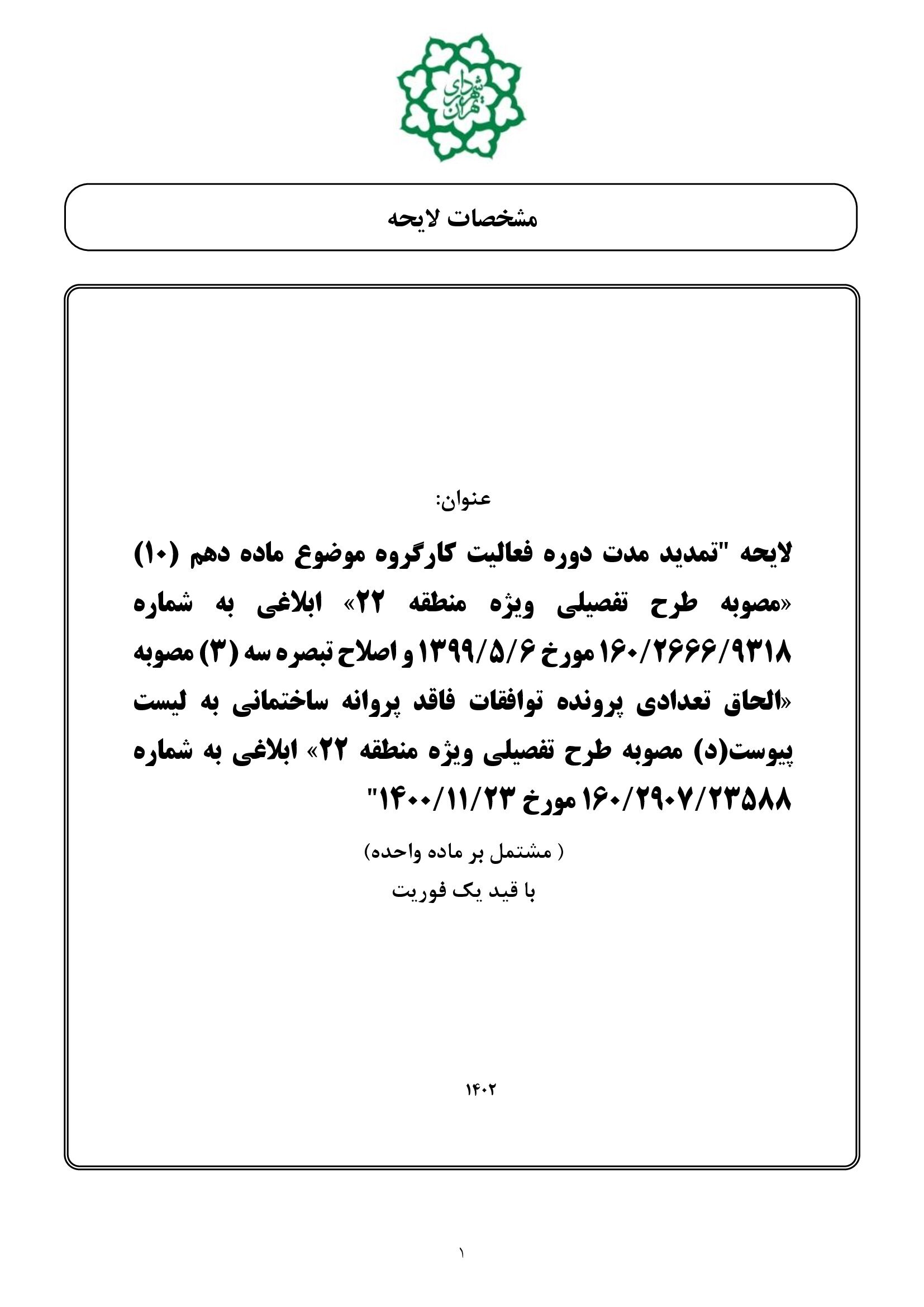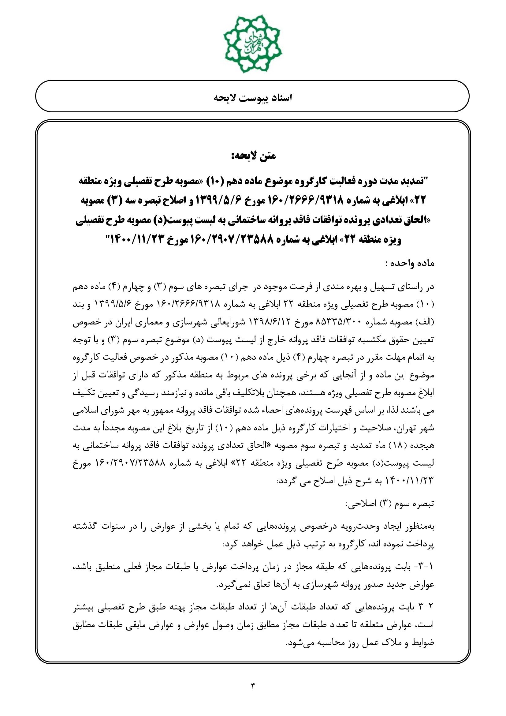 اصلاح تبصره سه (3) مصوبه «الحاق تعدادي پرونده توافقات فاقد پروانه ساختماني به ليست پيوست (د) مصوبه طرح تفصيلي ويژه منطقه 22» ابلاغي به شماره 160/2907/23588 مورخ 1400/11/23