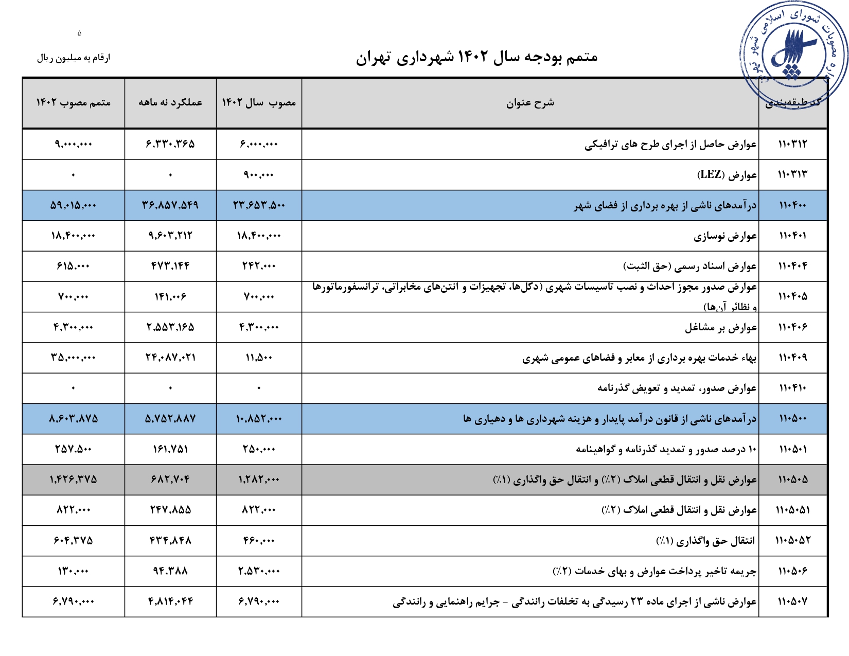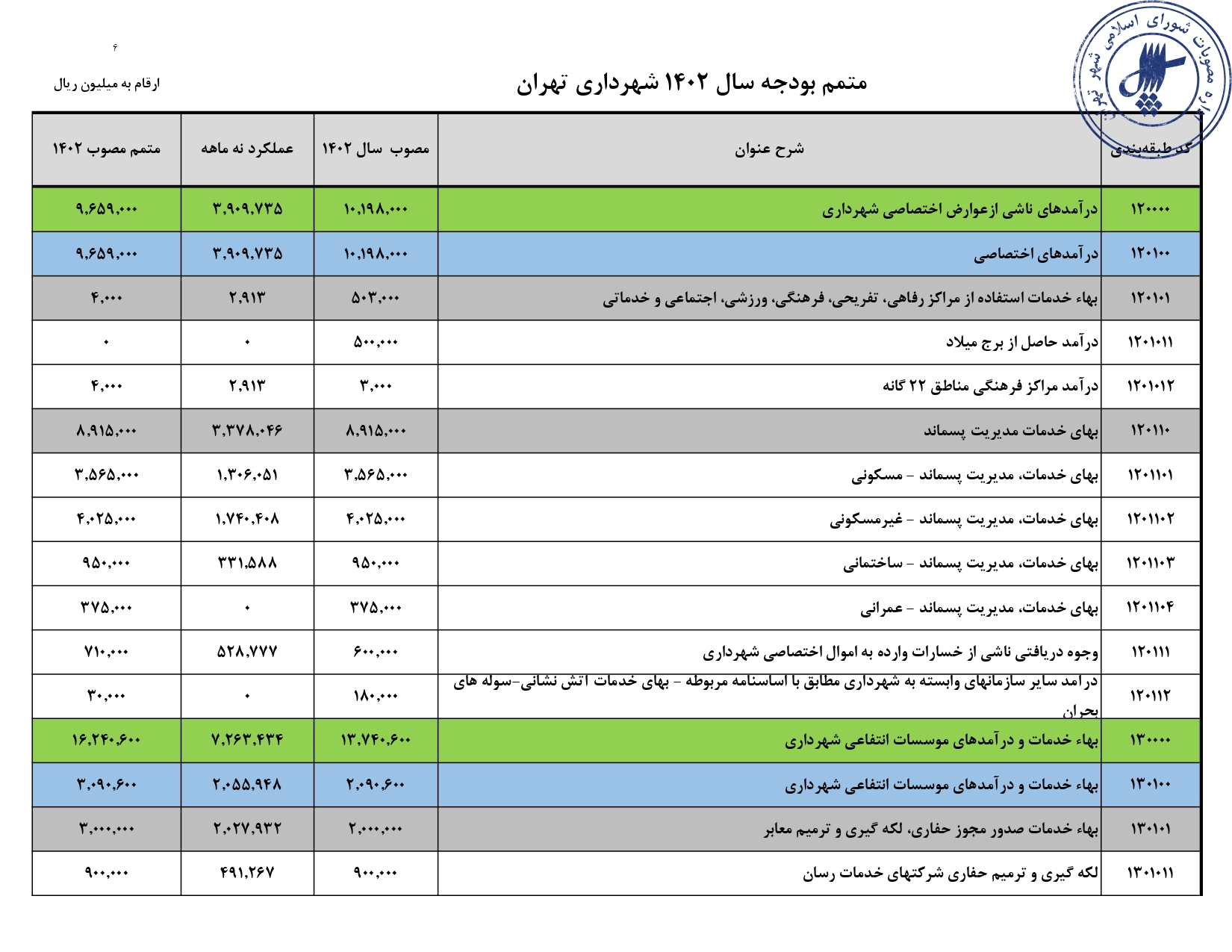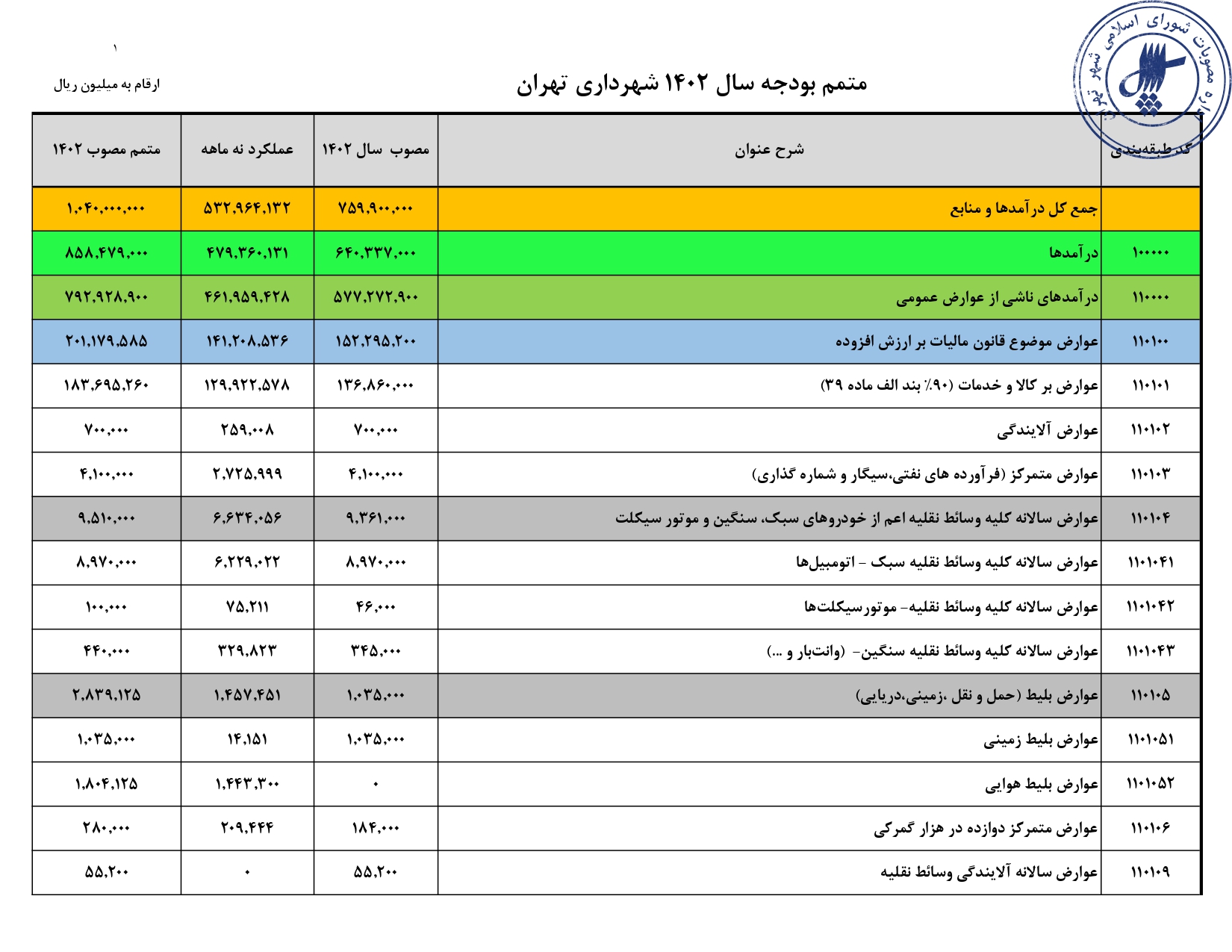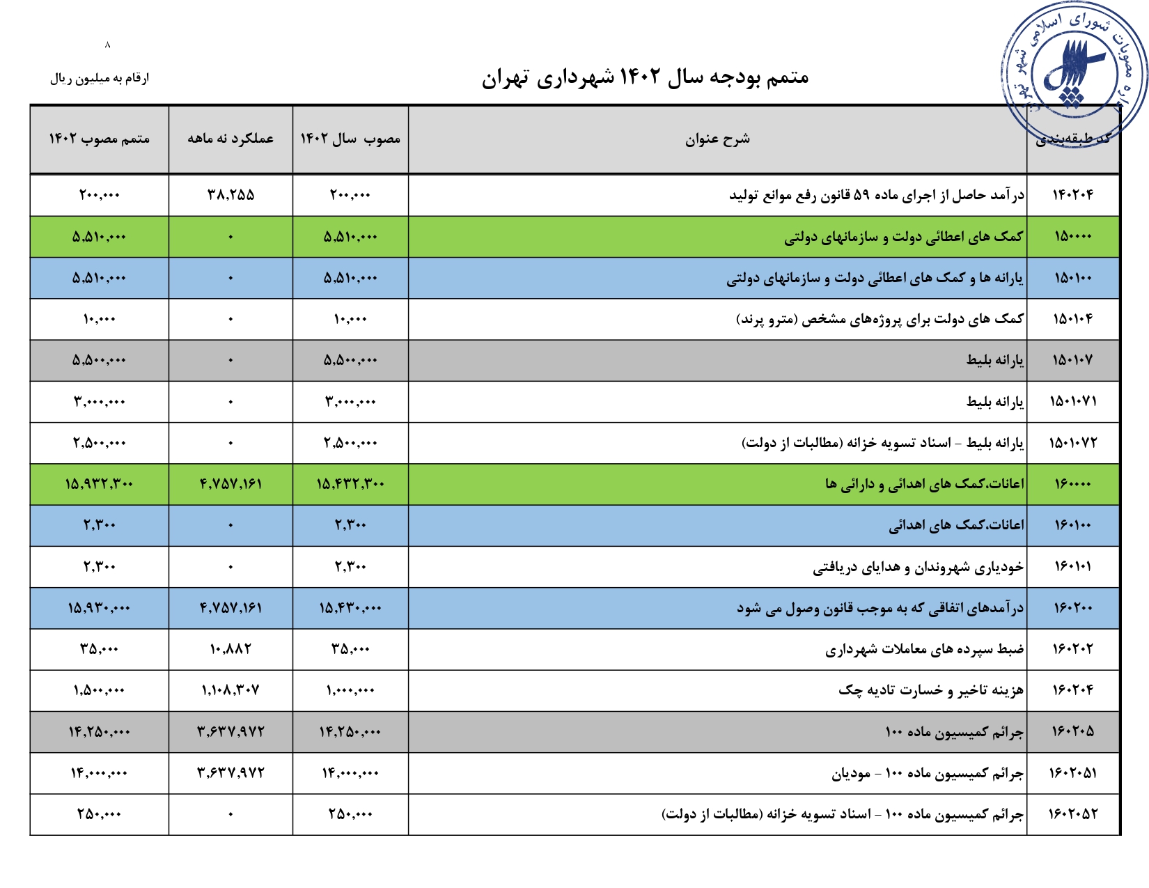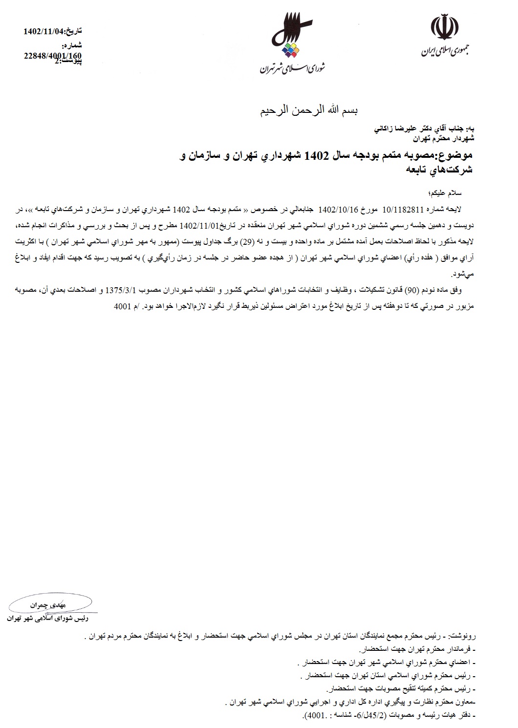 متمم بودجه سال 1402 شهرداري تهران و سازمانها و شركتهاي تابعه