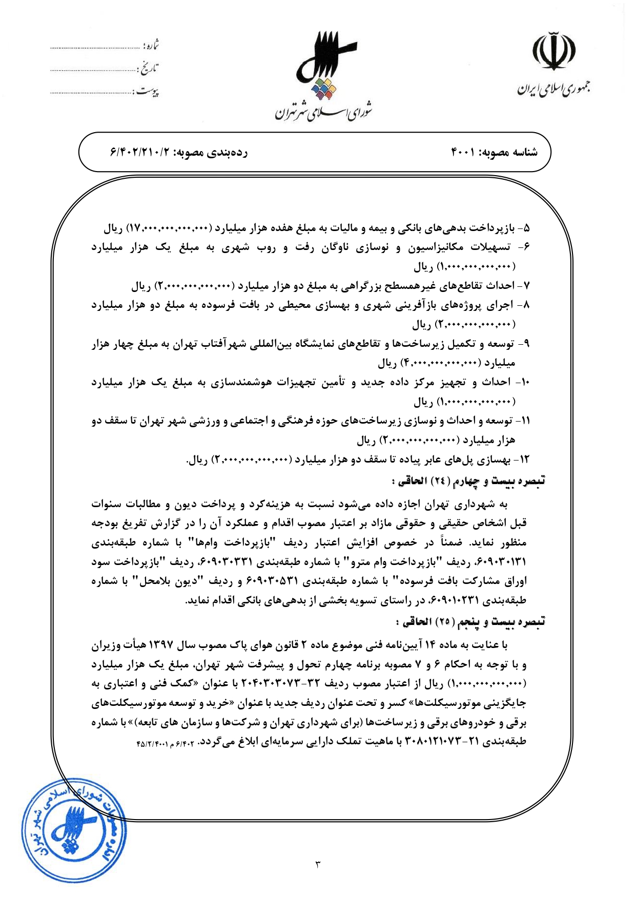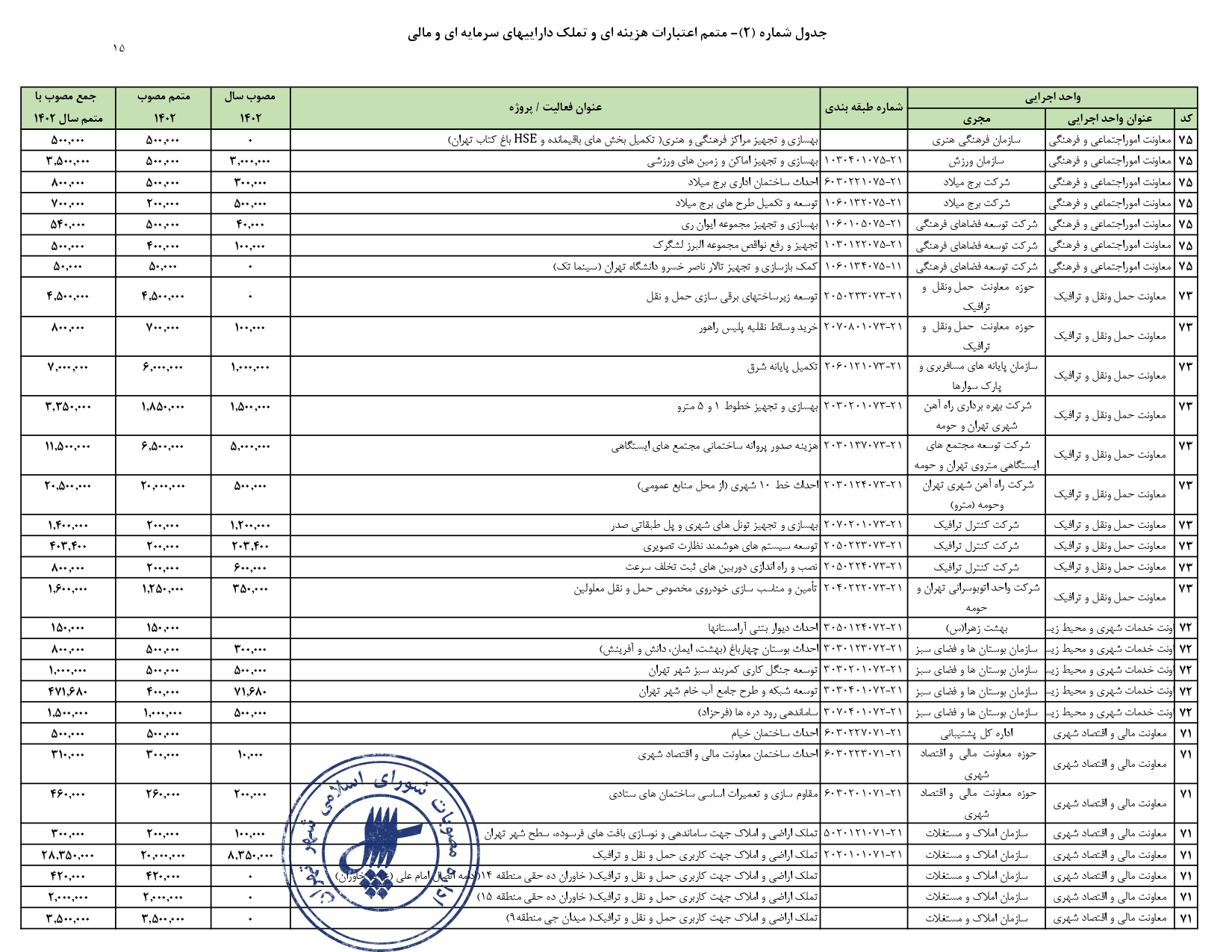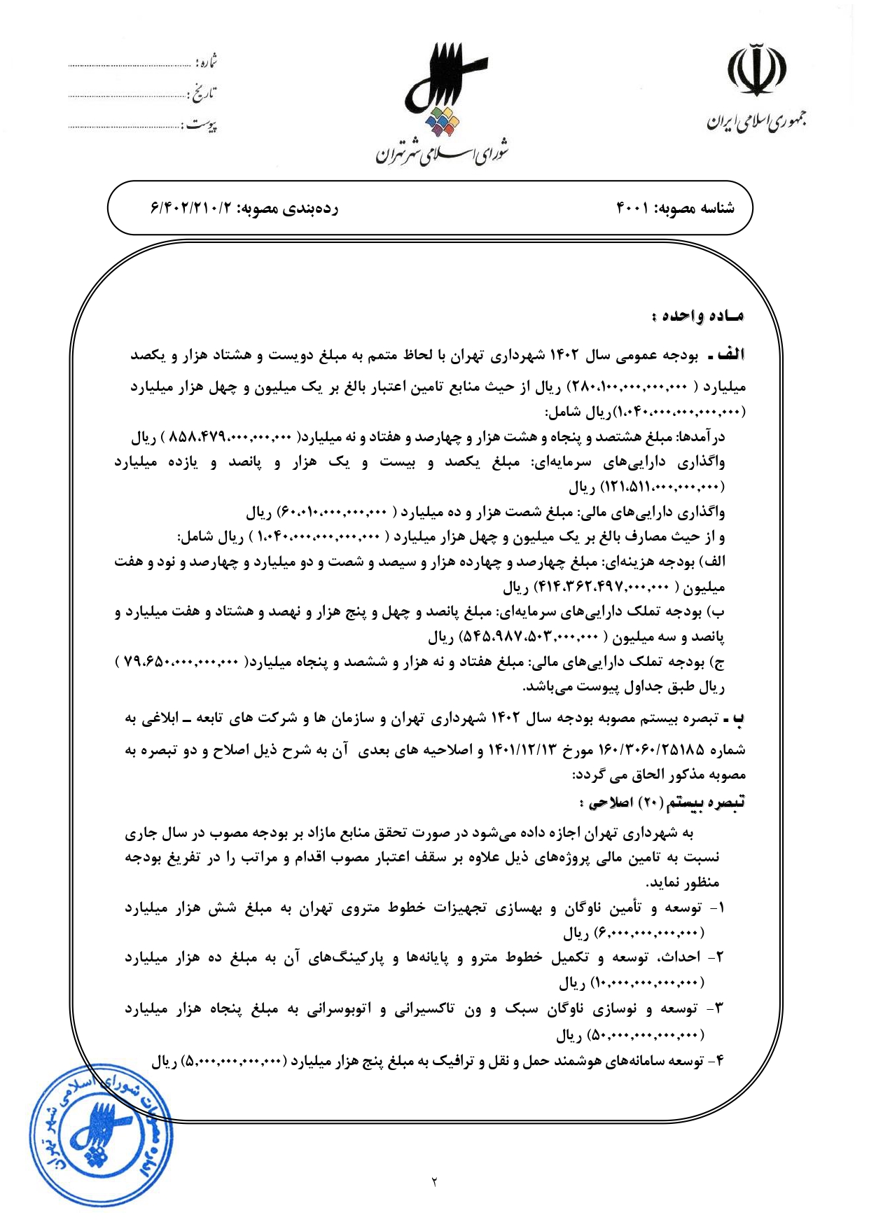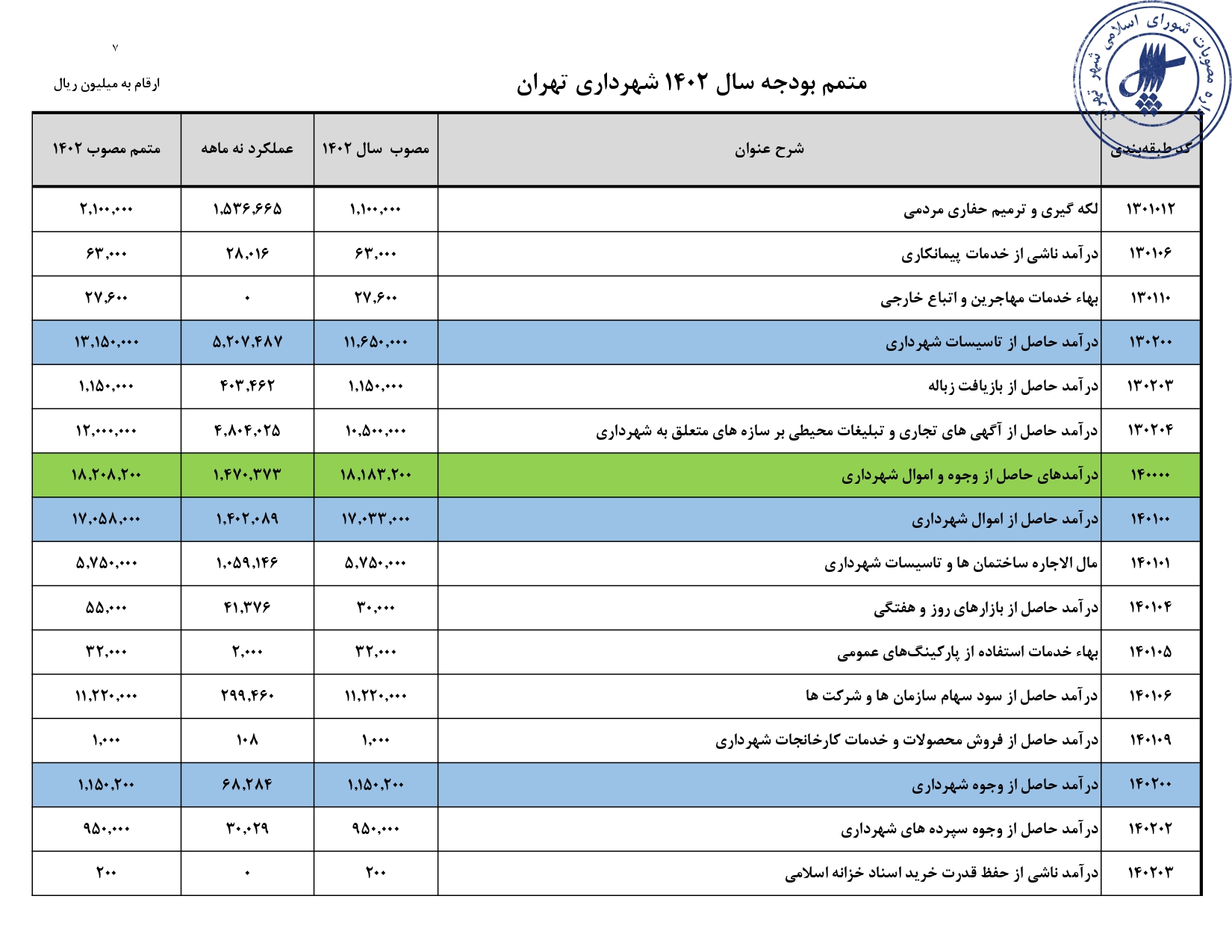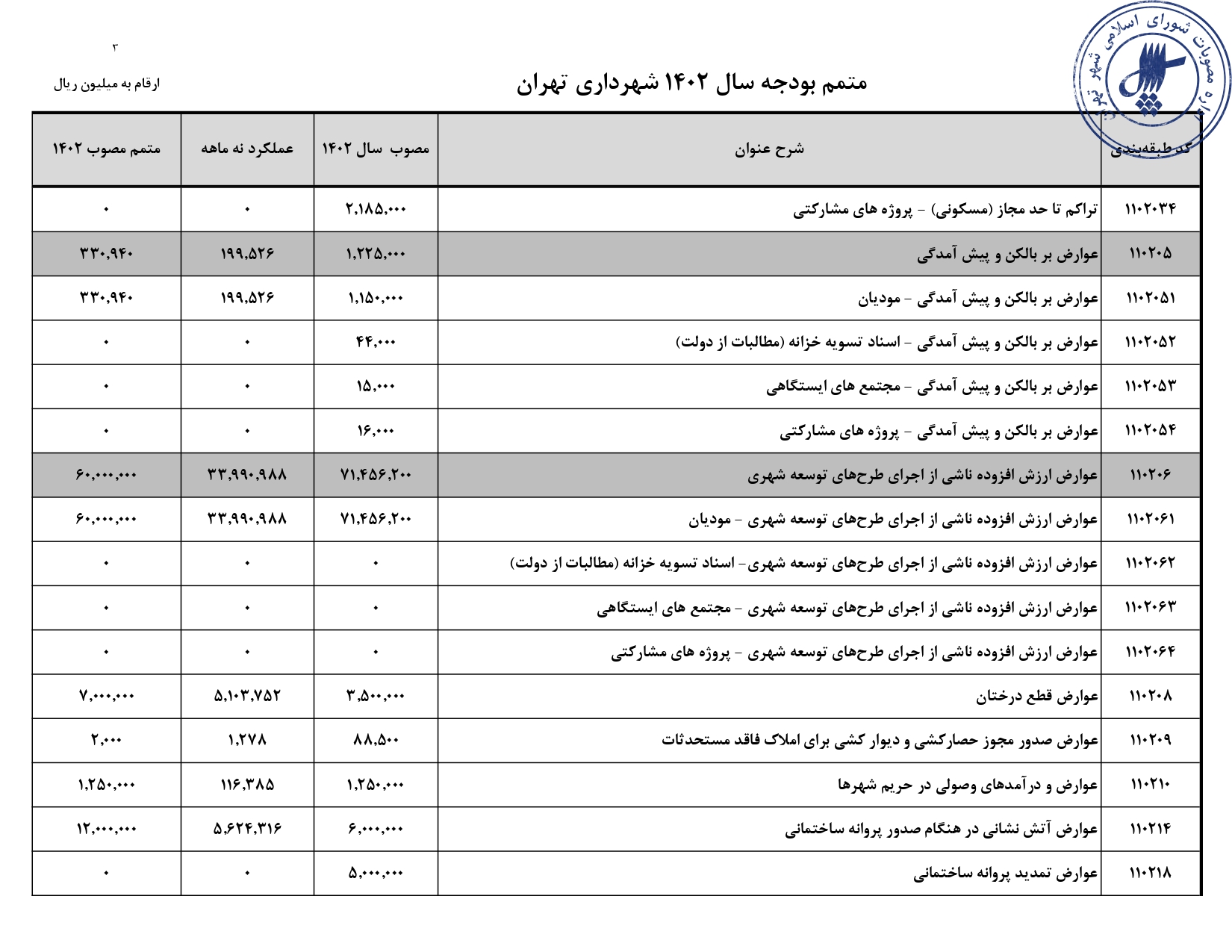 متمم بودجه سال 1402 شهرداري تهران و سازمانها و شركتهاي تابعه