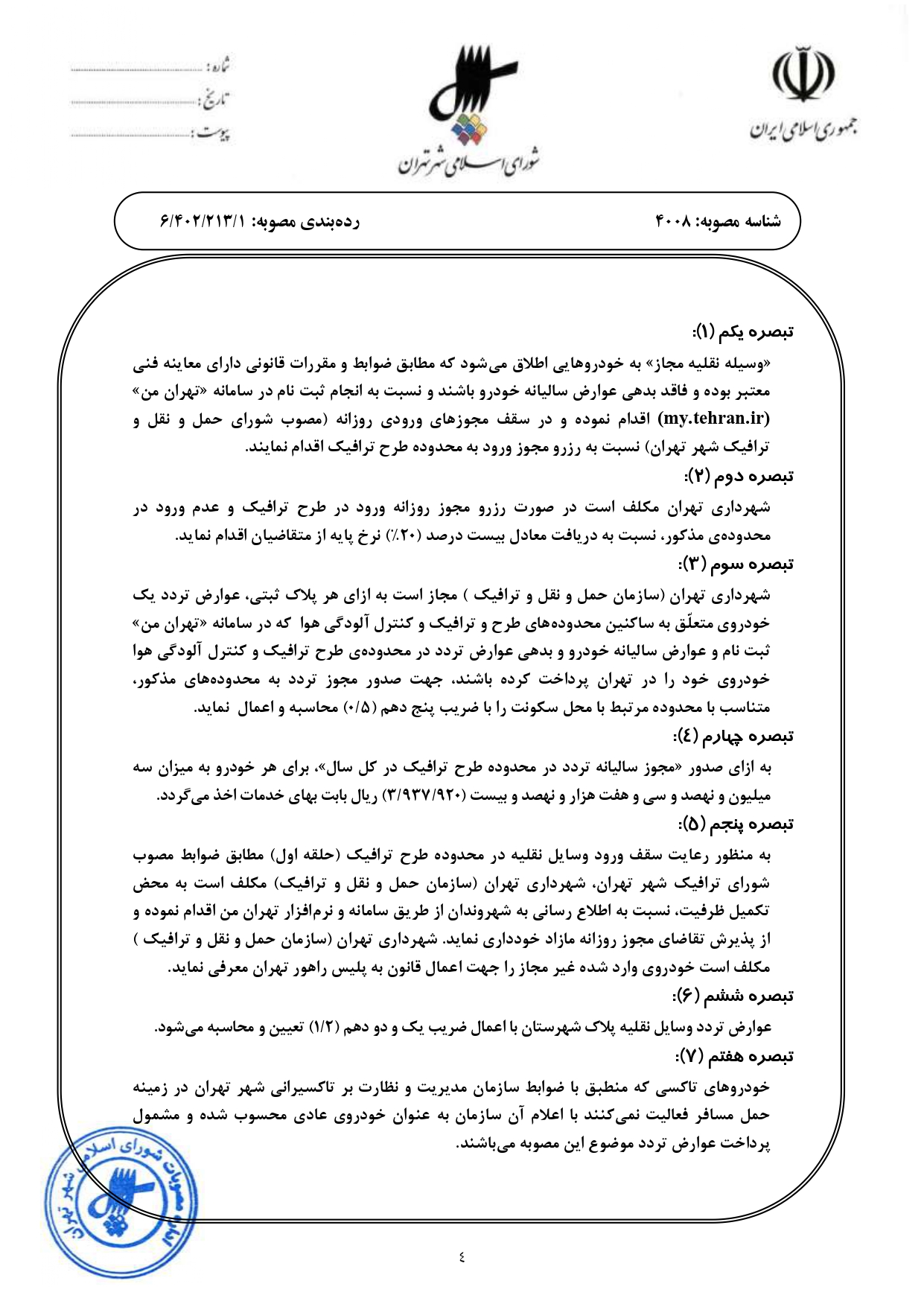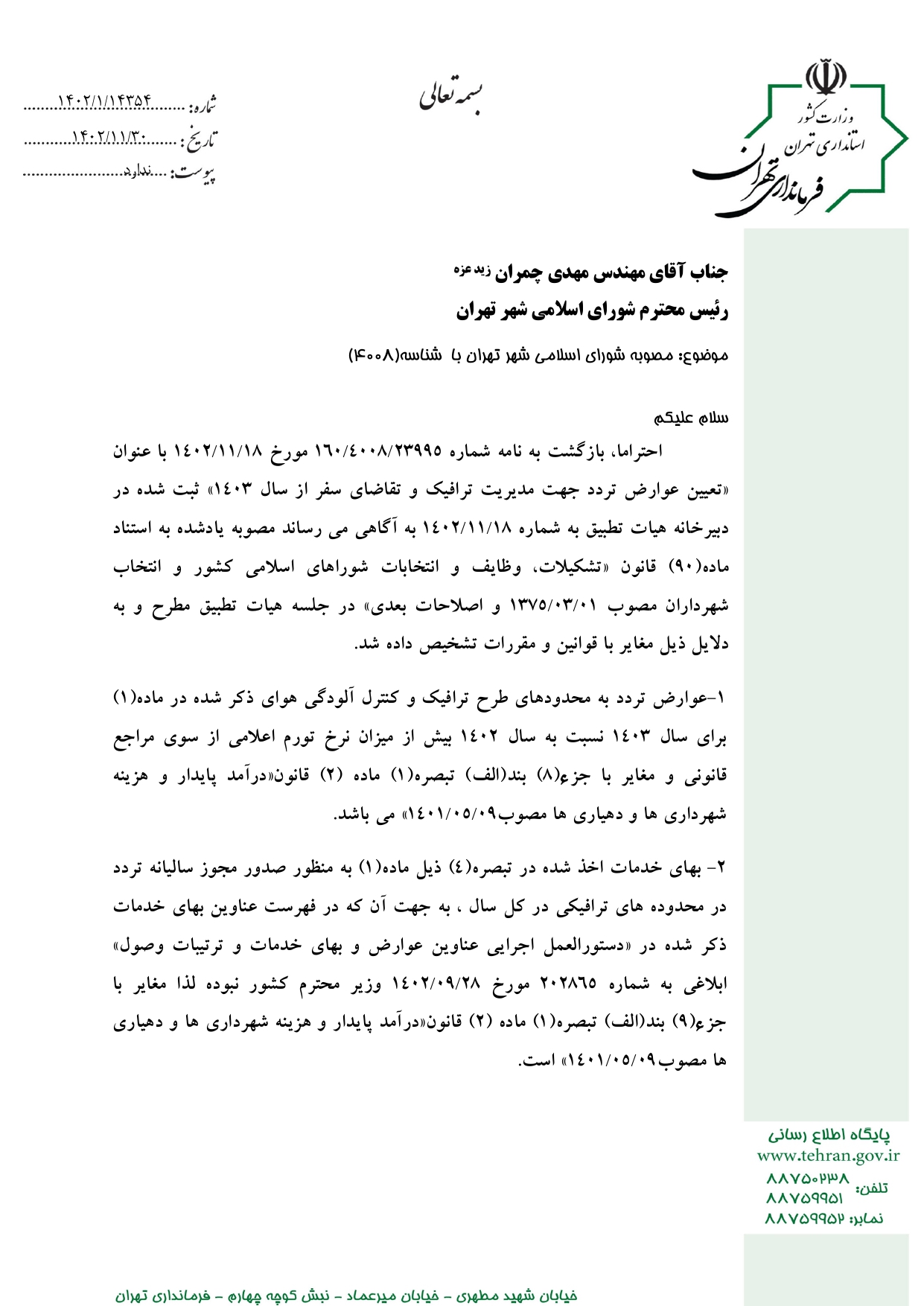 تعيين عوارض تردد جهت مديريت ترافيك و تقاضاي سفر از سال 1403