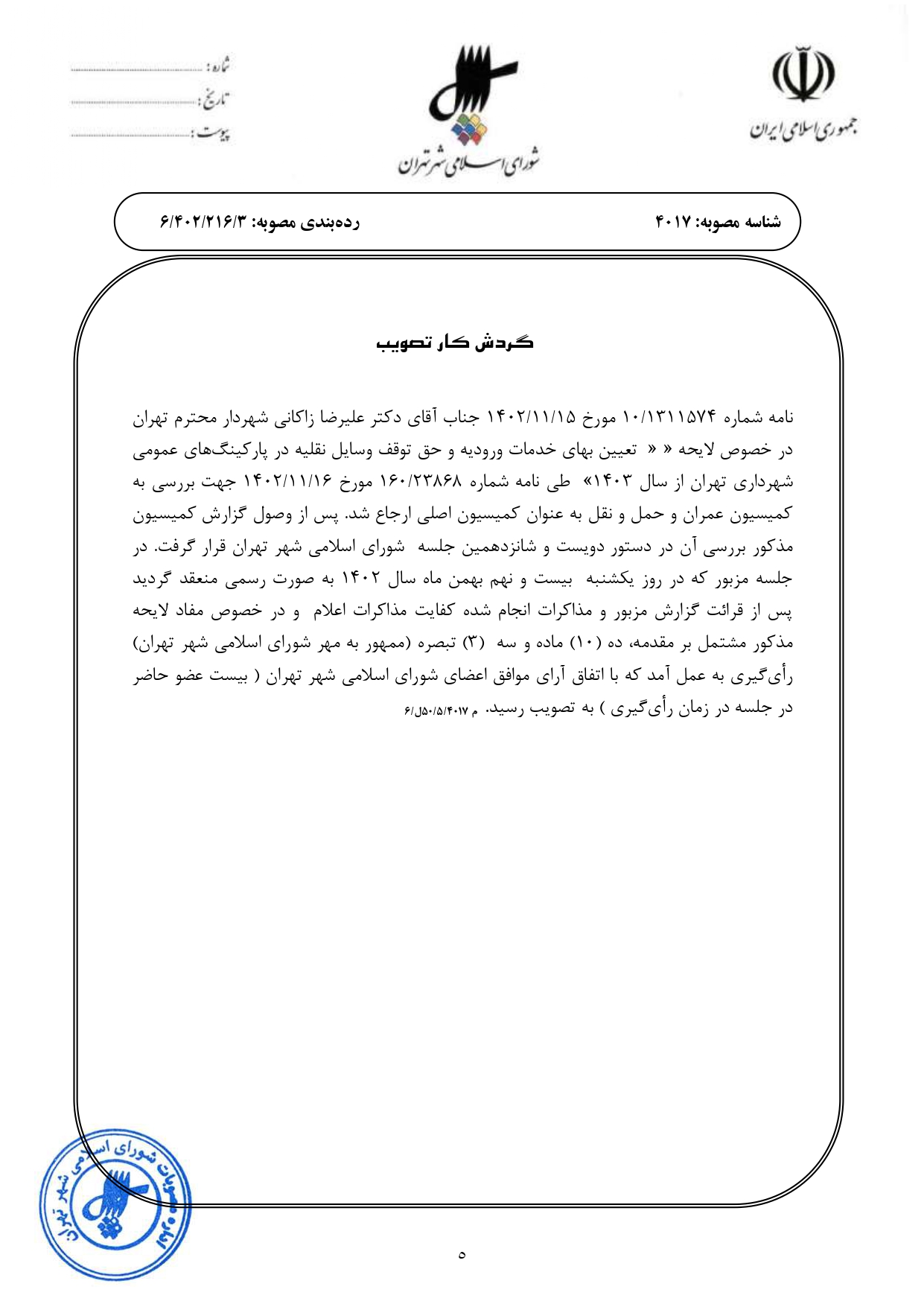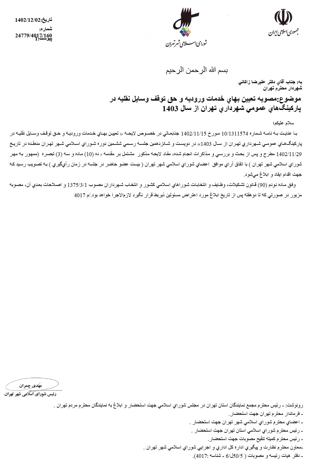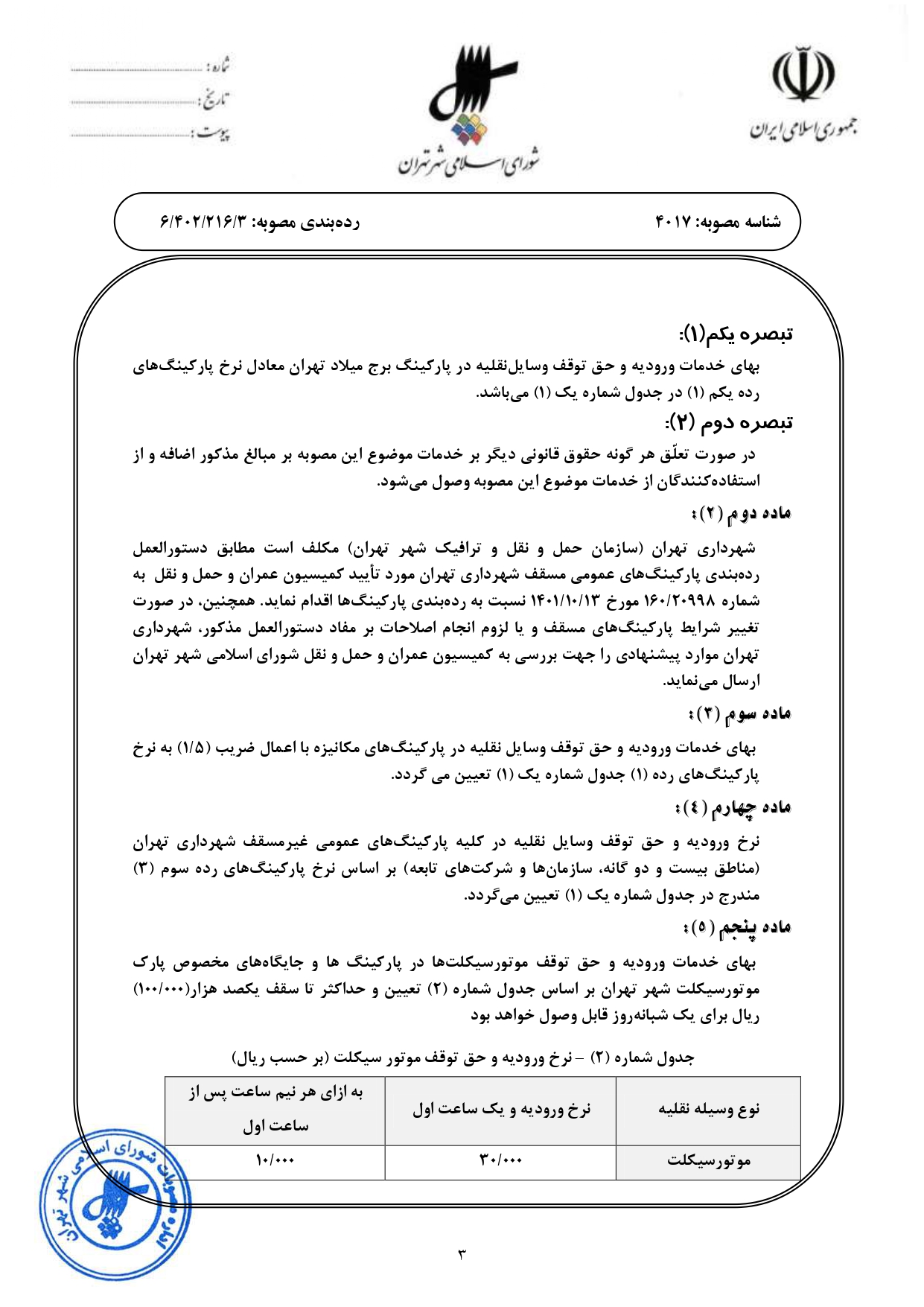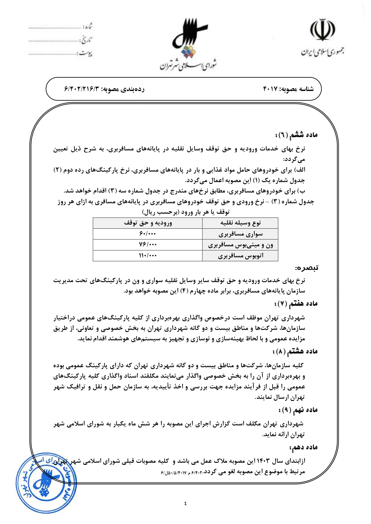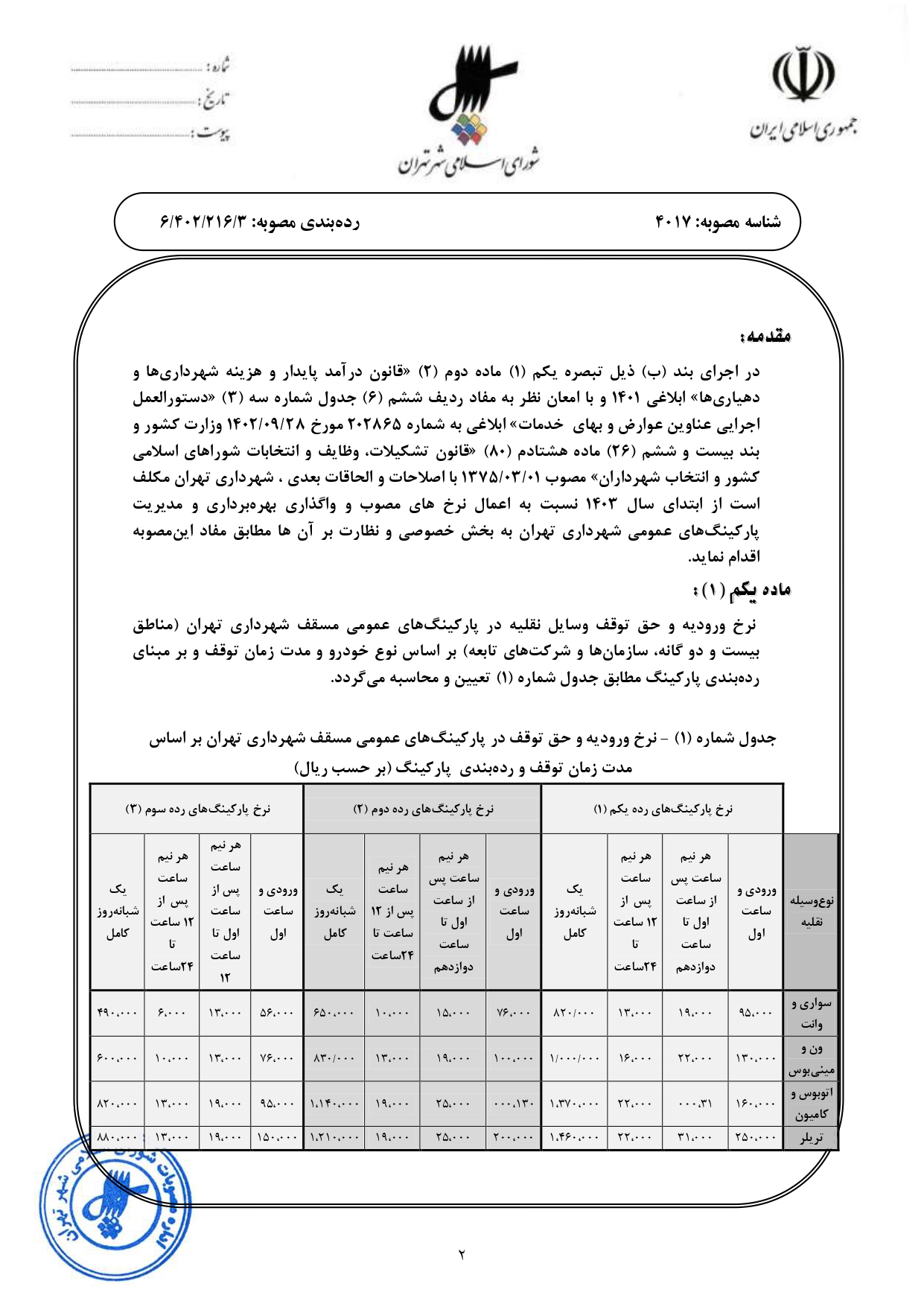 تعيين بهاي خدمات وروديه و حق توقف وسايل نقليه در پاركينگهاي عمومي شهرداري تهران از سال 1403