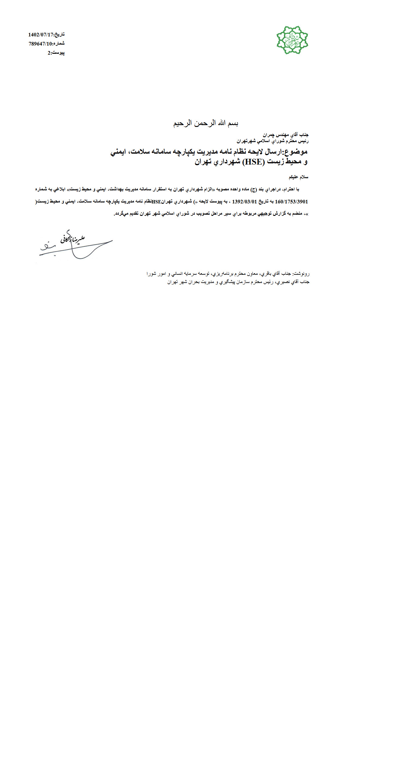 نظامنامه مديريت يكپارچه سلامت، ايمني و محيطزيست (HSE) شهرداري تهران