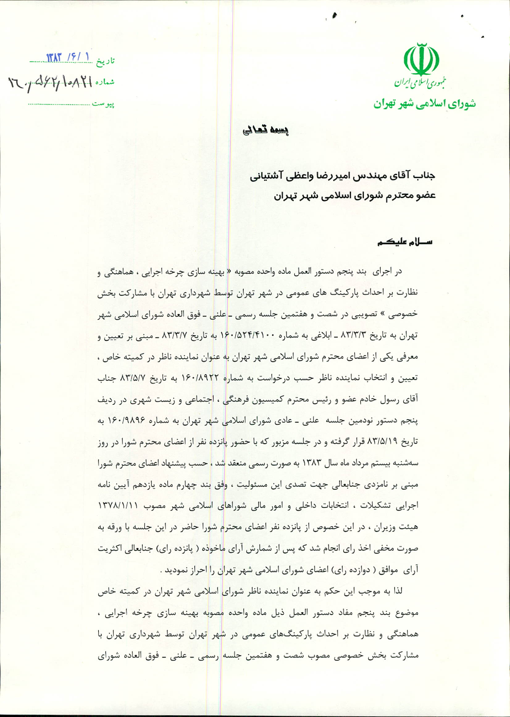 تعیین و معرفی آقاي اميررضا واعظي آشتياني به‌ عنوان نماينده ناظر در كميسيون خاص موضوع مصوبه «بهينه‌سازي چرخه اجرايي، هماهنگي و نظارت بر احداث پاركينگ‌هاي عمومي در شهر تهران توسط شهرداري تهران با مشاركت بخش خصوصي» ابلاغي به شماره 160/524/4100 به تاريخ 83/3/7