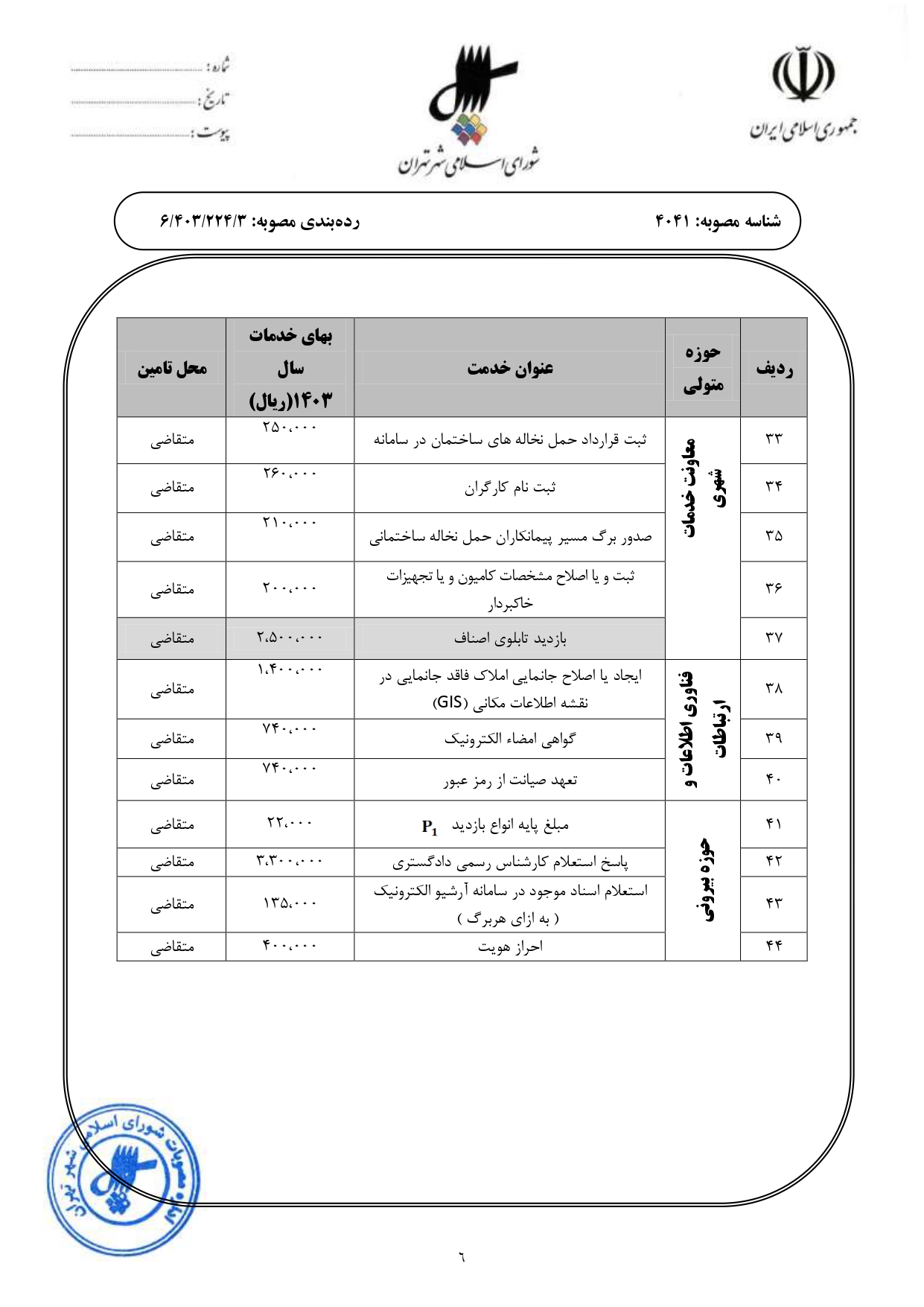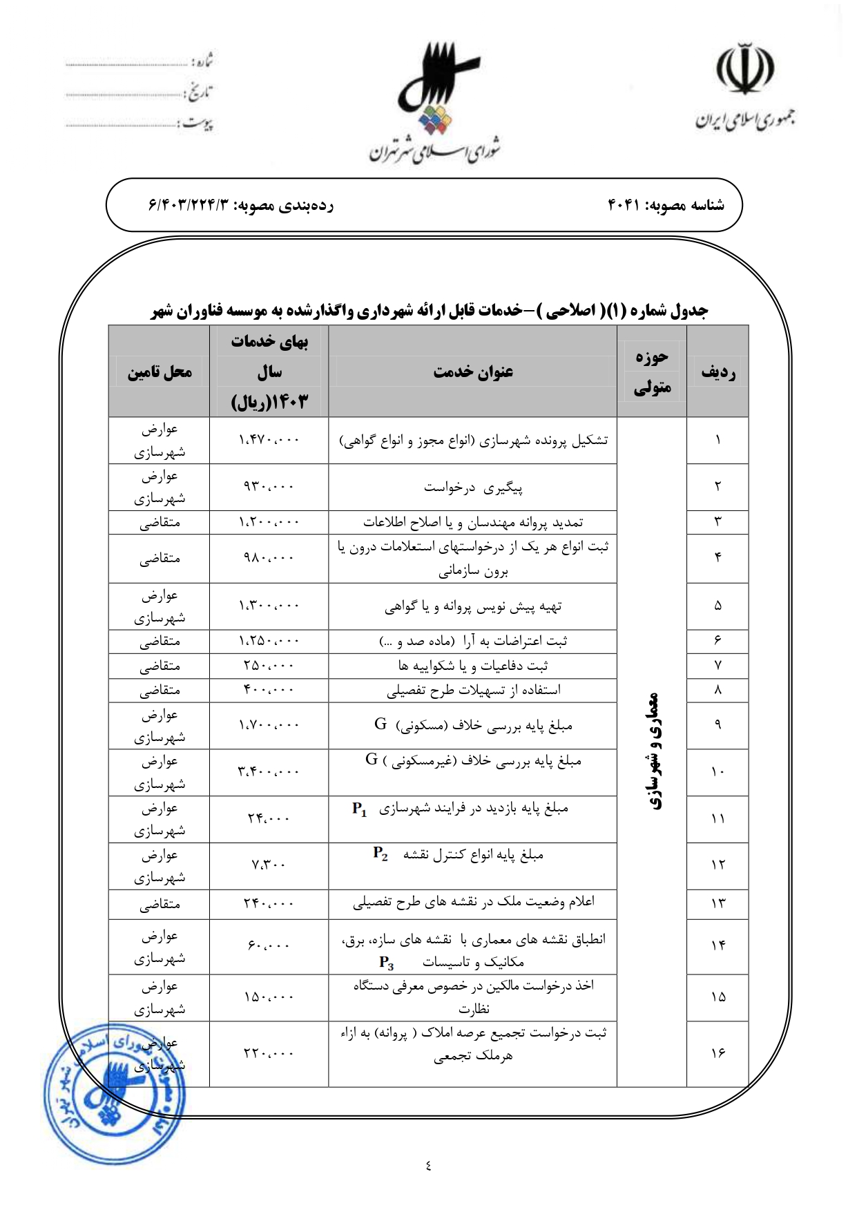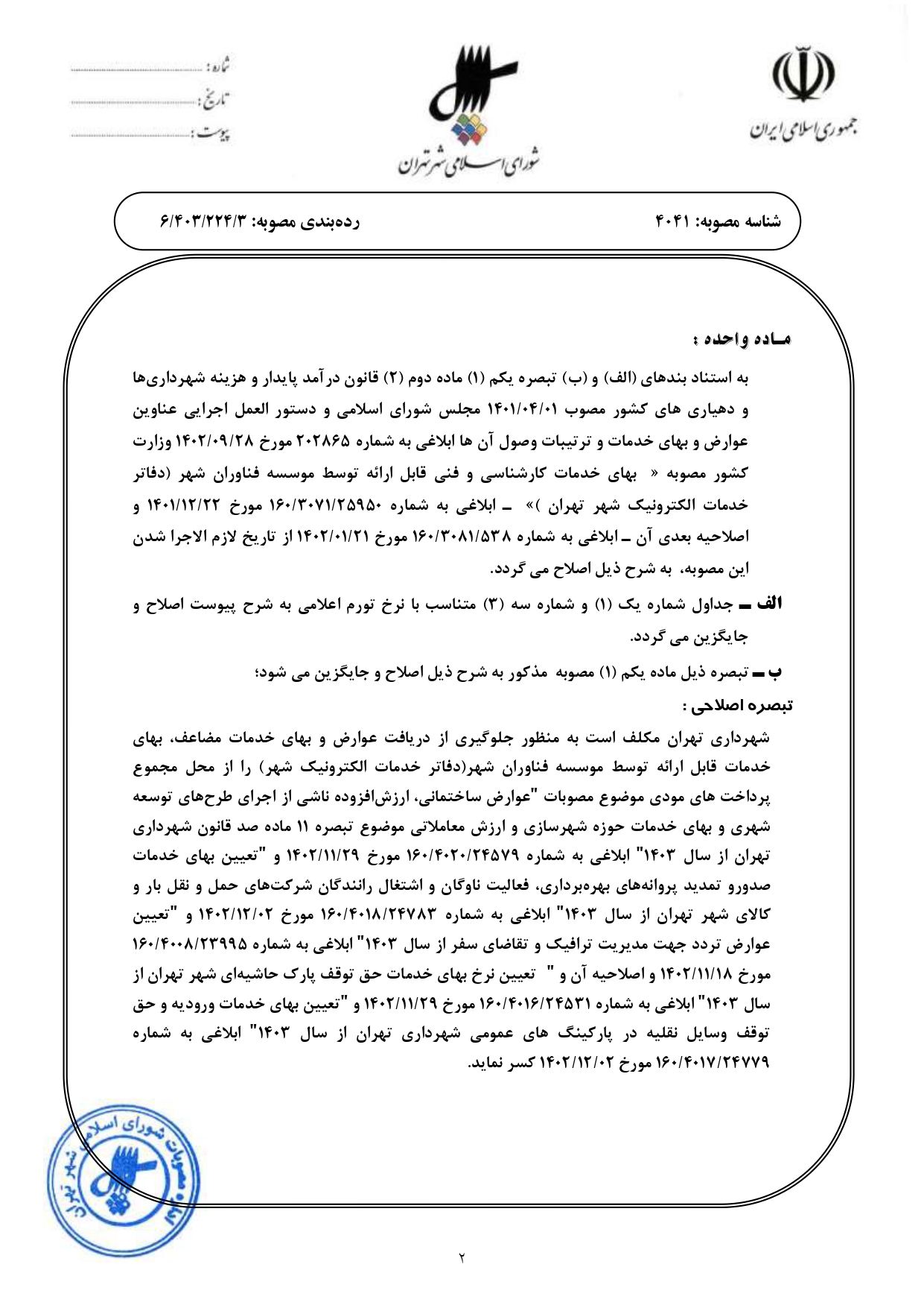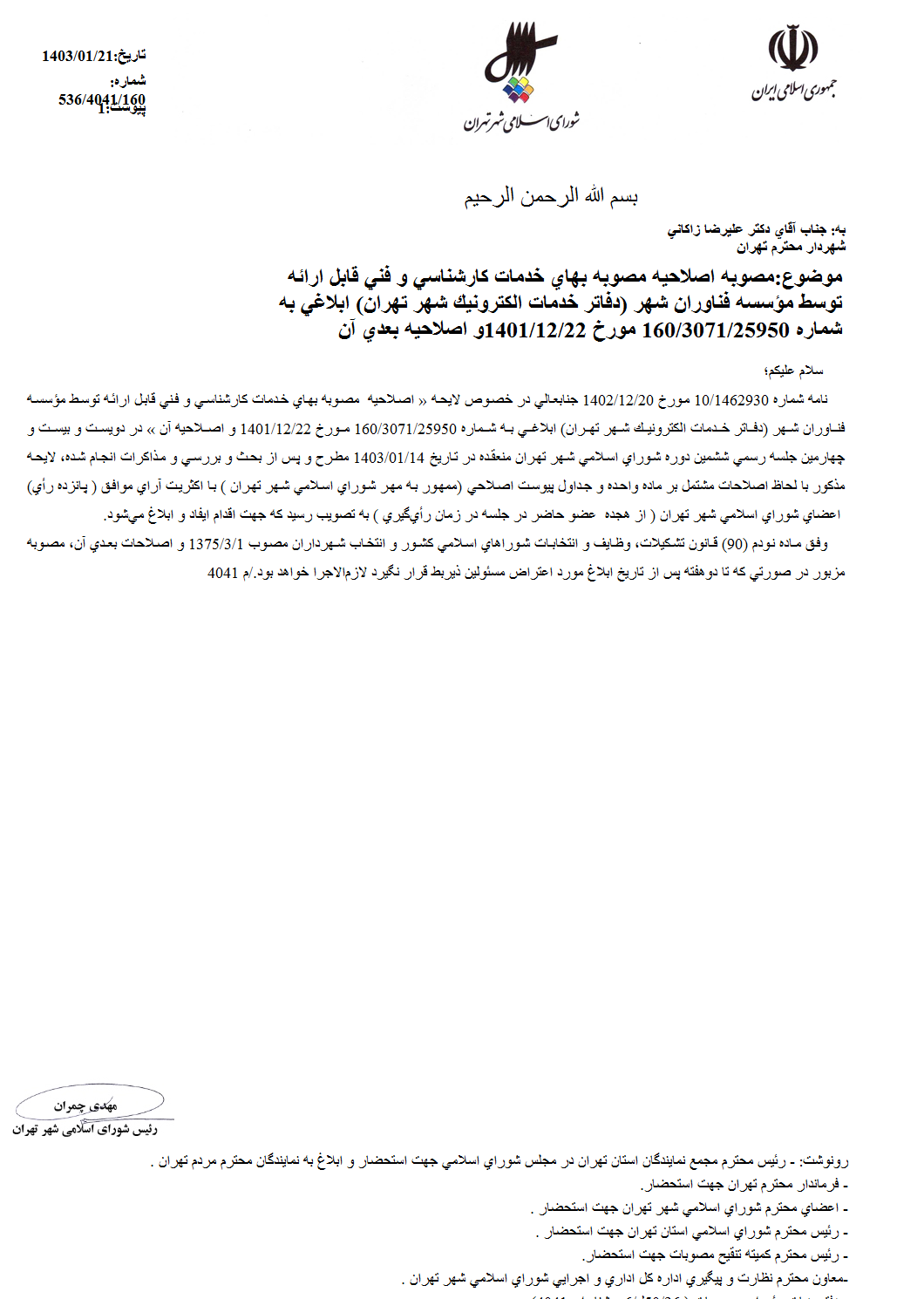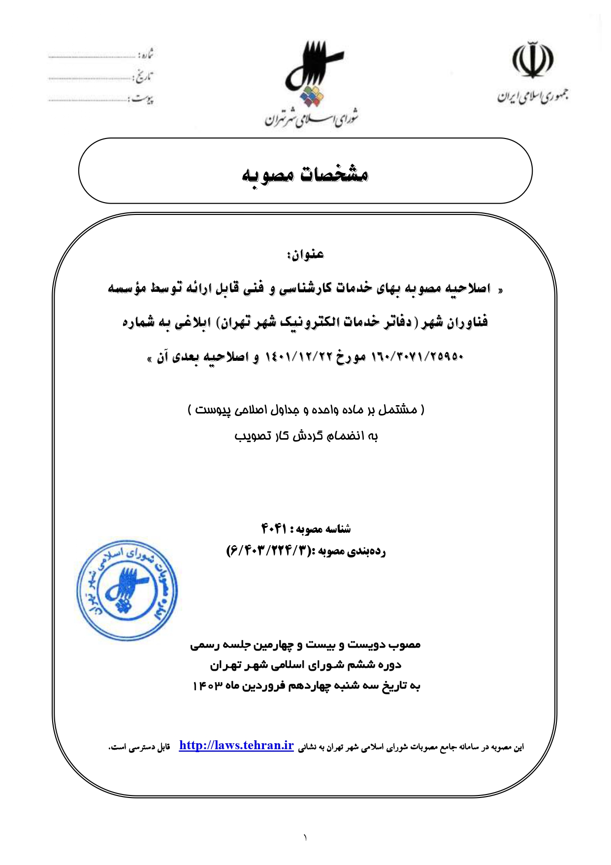 اصلاحيه مصوبه بهاي خدمات كارشناسي و فني قابل ارائه توسط مؤسسه فناوران شهر (دفاتر خدمات الكترونيك شهر تهران) ابلاغي به شماره 160/3071/25950 مورخ 1401/12/22 و اصلاحيه بعدي آن