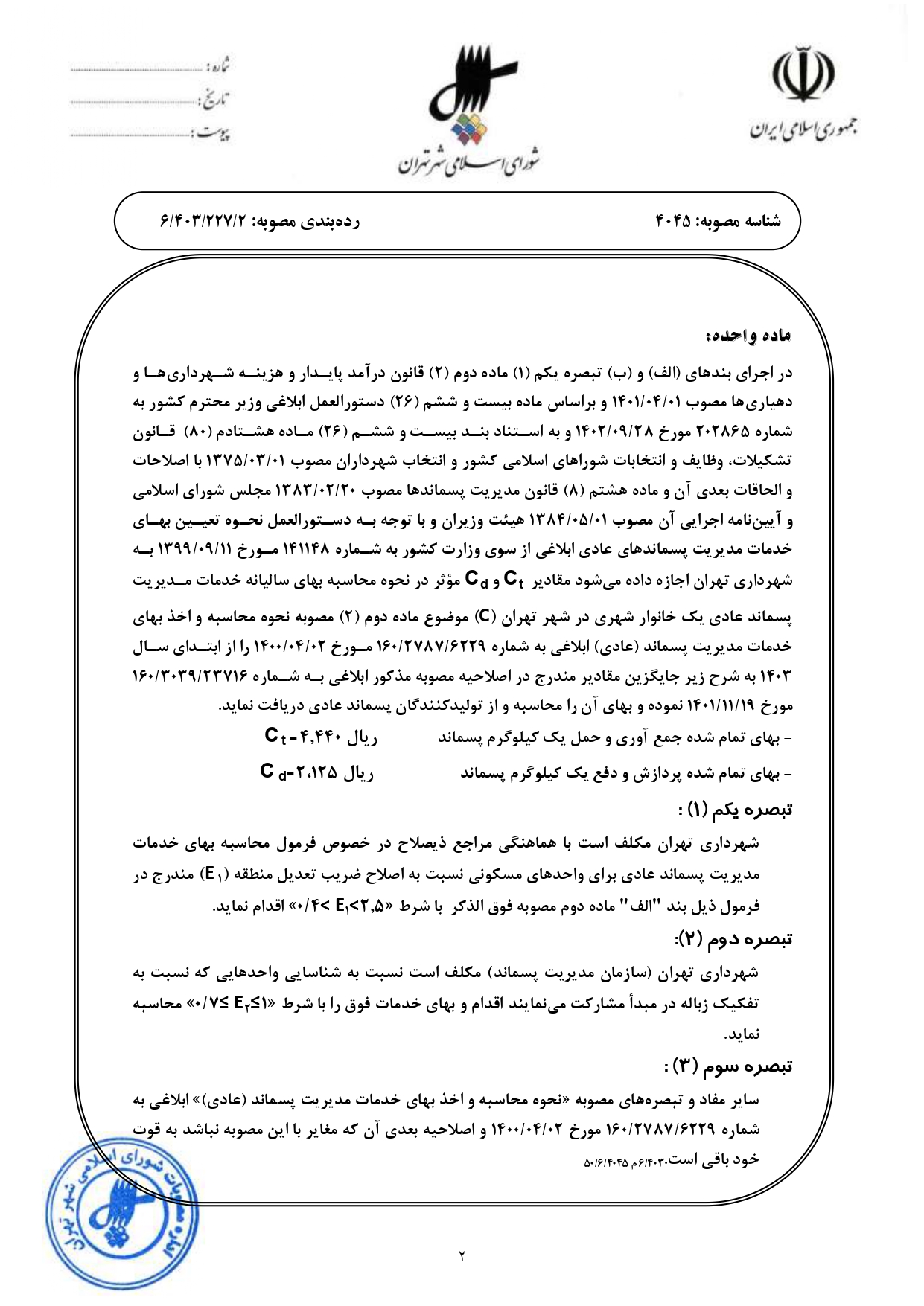 اصلاحيه مصوبه نحوه محاسبه و اخذ بهاي خدمات مديريت پسماند (عادي) - ابلاغي به شماره 160/2787/6229 مورخ 1400/04/02 و اصلاحيه بعدي آن