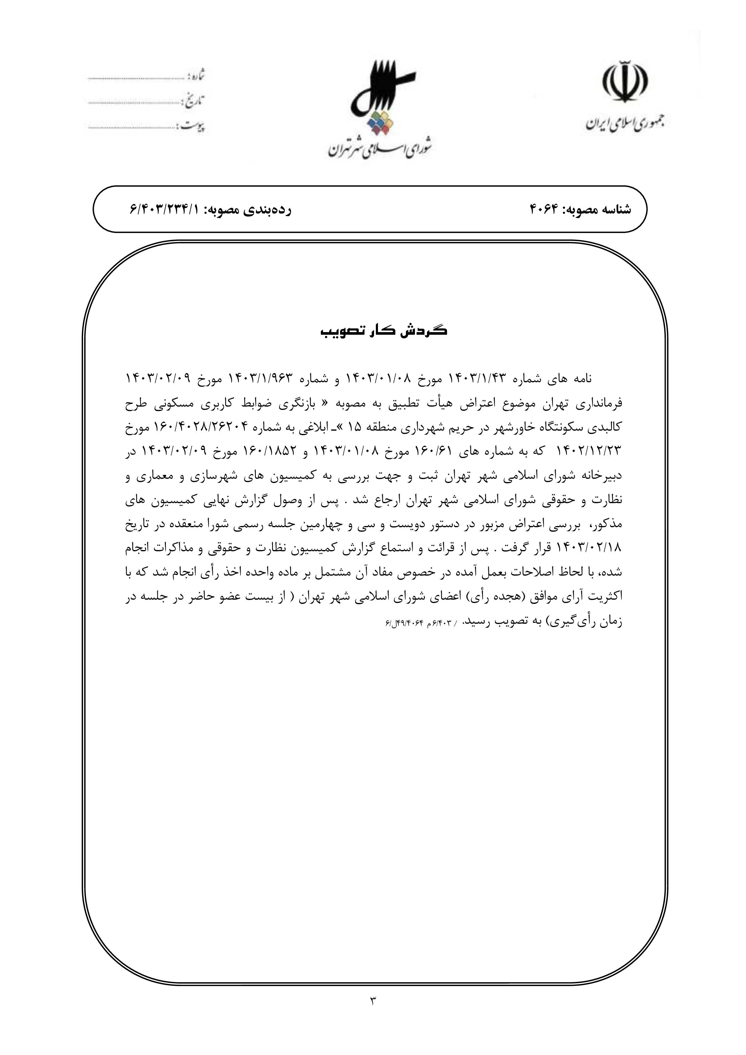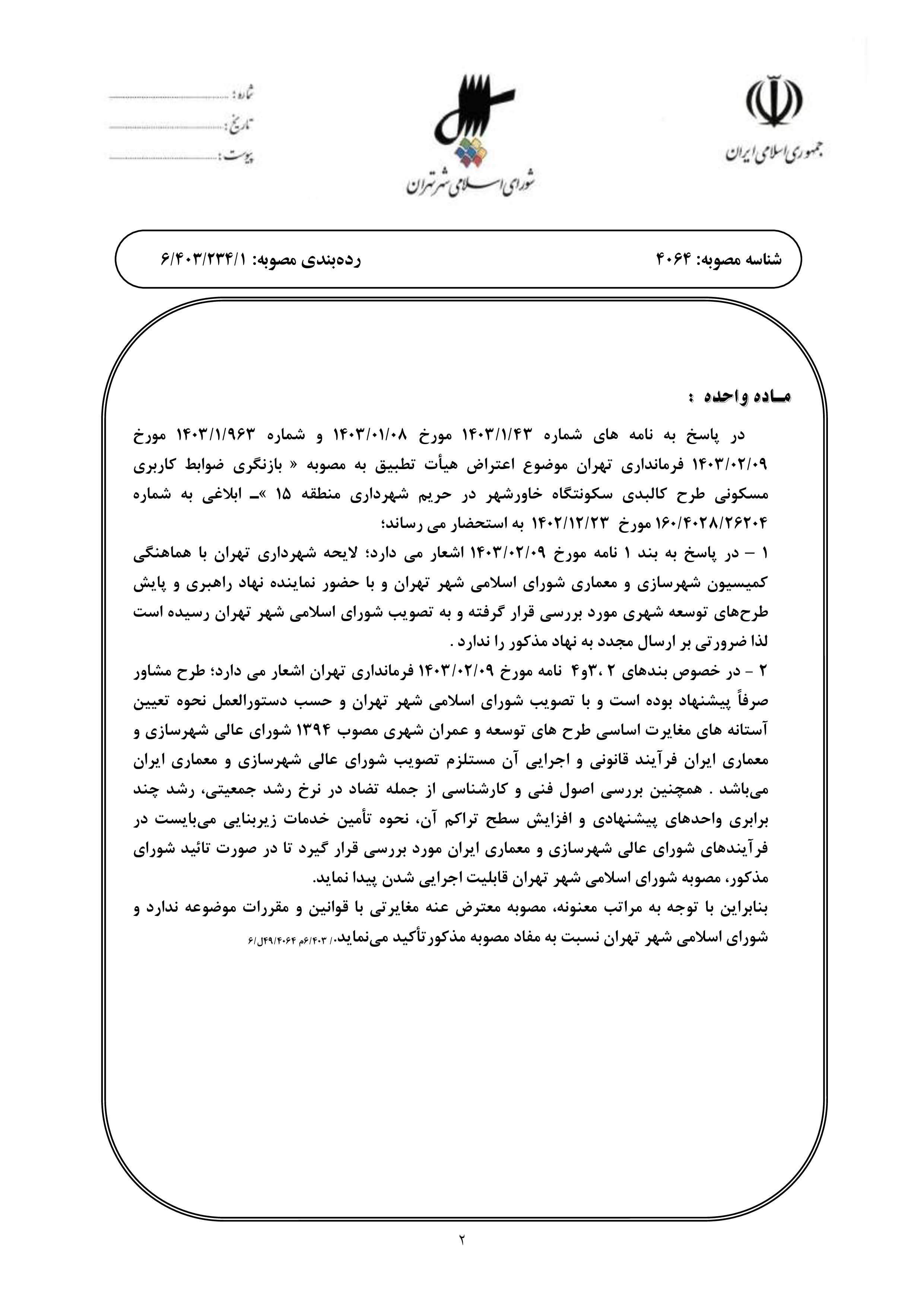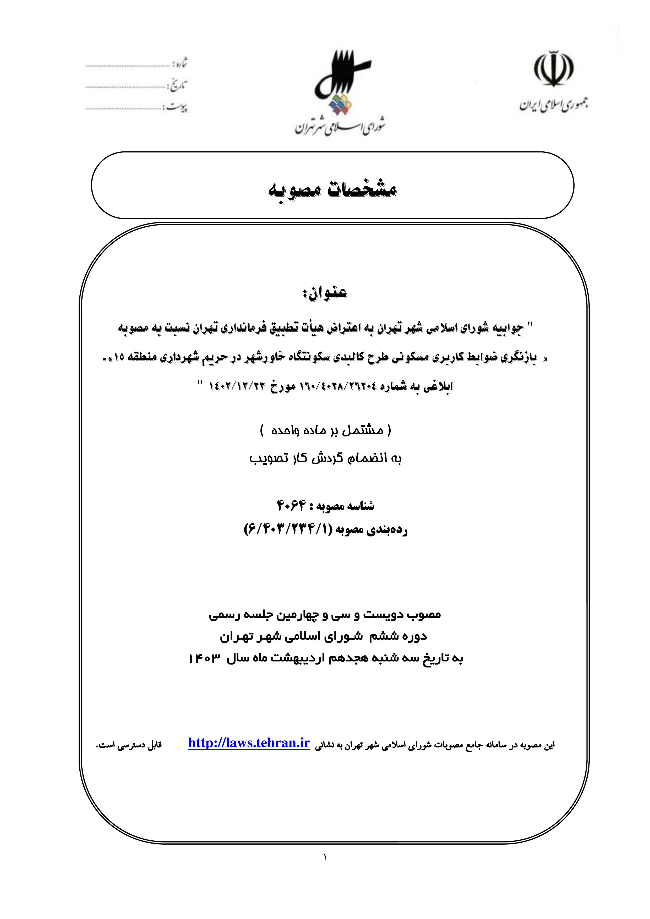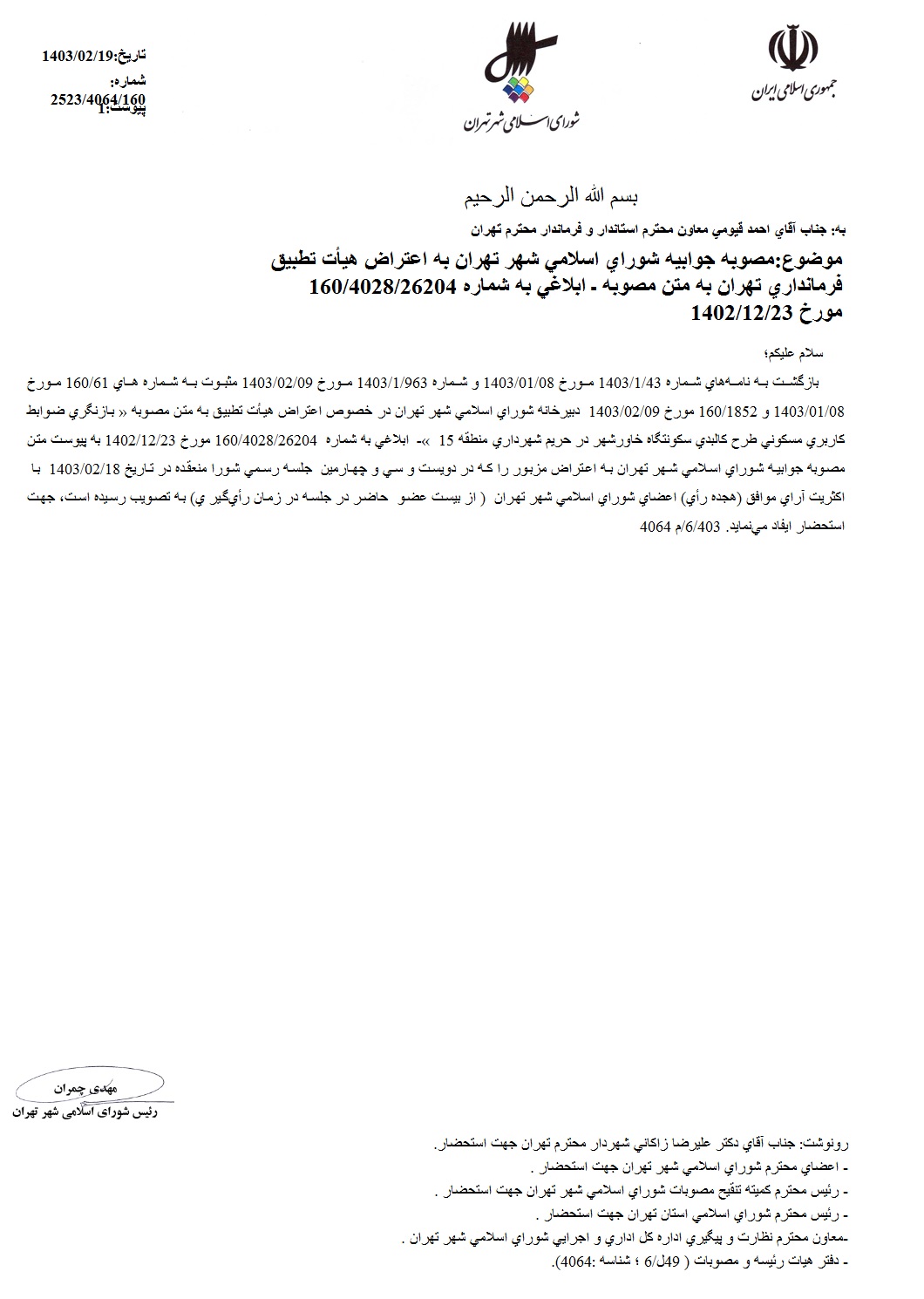 جوابيه شوراي اسلامي شهر تهران به اعتراض هيأت تطبيق فرمانداري تهران نسبت به مصوبه «بازنگري ضوابط كاربري مسكوني طرح كالبدي سكونتگاه خاورشهر در حريم شهرداري منطقه 15» - ابلاغي به شماره 160/4028/26204 مورخ 1402/12/23