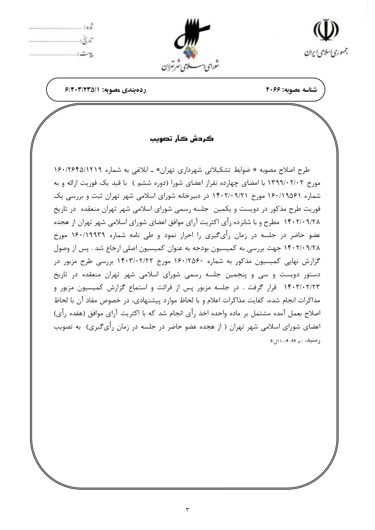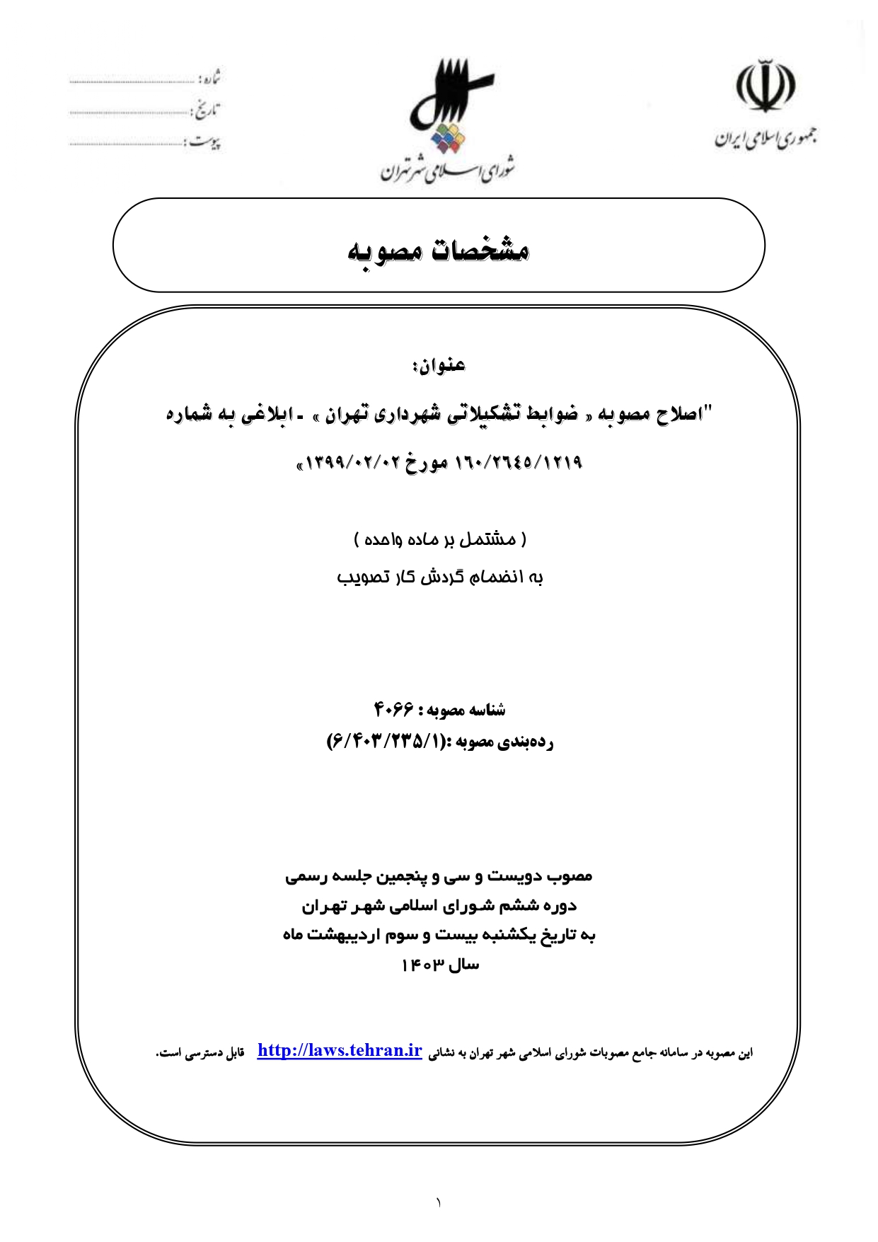 اصلاح مصوبه «ضوابط تشكيلاتي شهرداري تهران» - ابلاغي به شماره 160/2645/1219 مورخ 1399/02/02