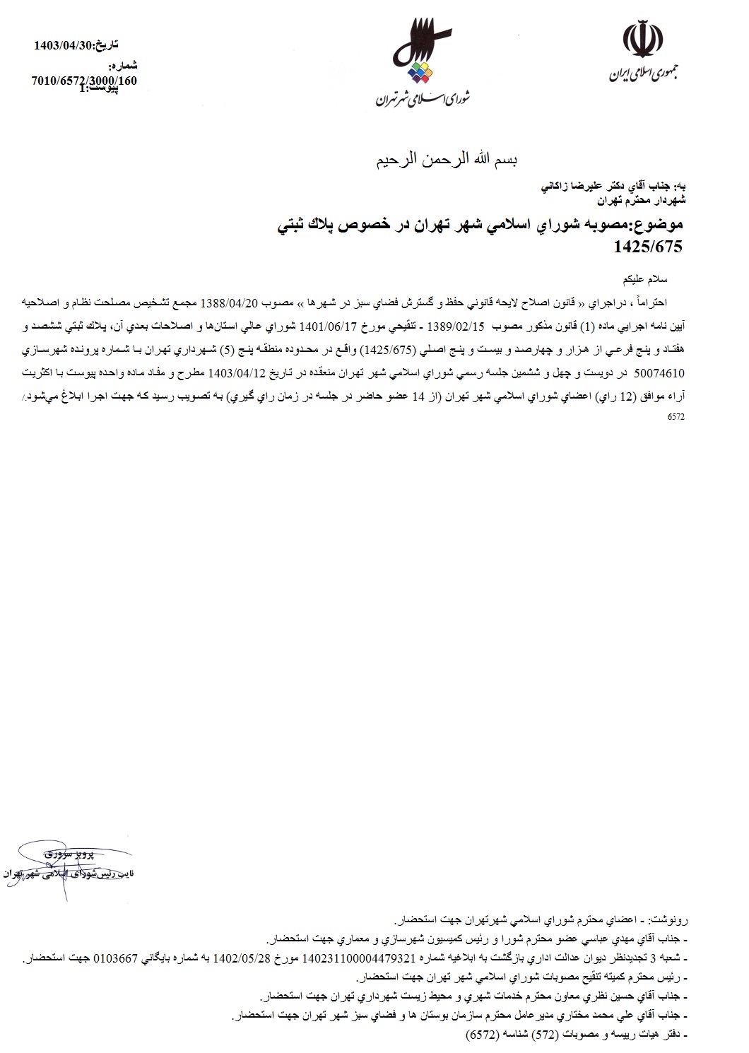 مصوبه شوراي اسلامي شهر تهران در خصوص پلاك ثبتي به شماره ششصد و هفتاد و پنج فرعي از هزار و چهارصد و بيست و پنج اصلي (1425/675) واقع در محدوده منطقه پنج (5) شهرداري تهران