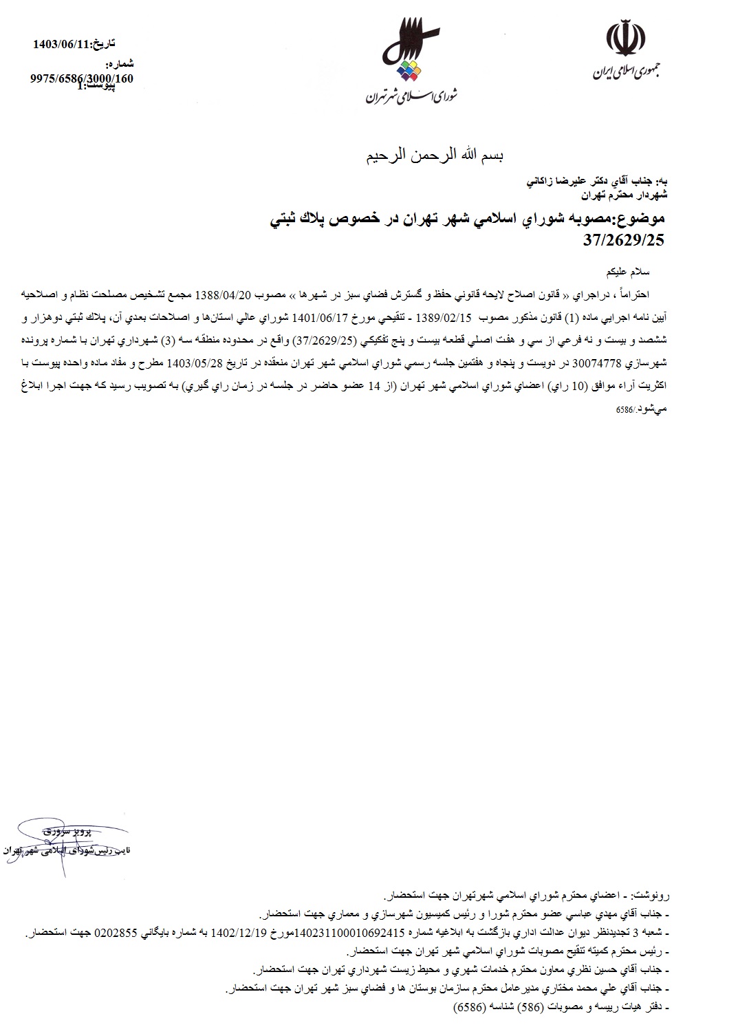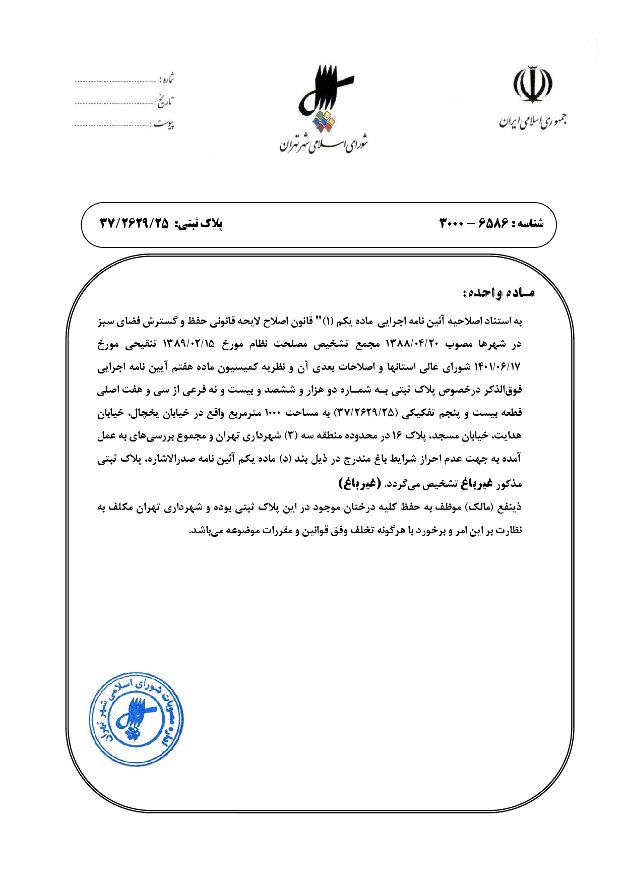 مصوبه شوراي اسلامي شهر تهران در خصوص پلاك ثبتي به شماره دو هزار و ششصد و بيست و نه فرعي از سي و هفت اصلي قطعه بيست و پنجم تفكيكي (37/2629/25) واقع در محدوده منطقه سه (3) شهرداري تهران