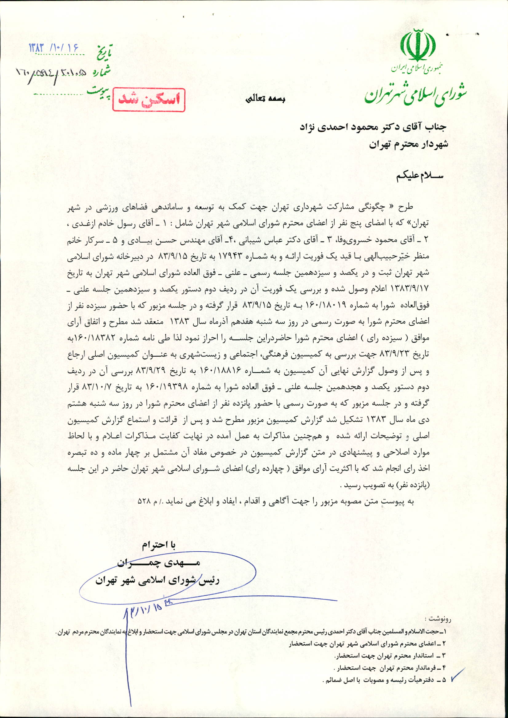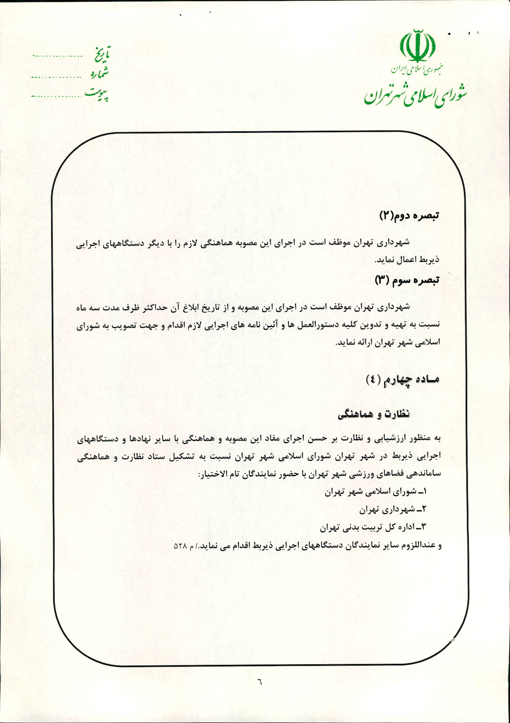 مشاركت شهرداري تهران در ايجاد، توسعه و ساماندهي فضاها و اماكن ورزشي شهر تهران