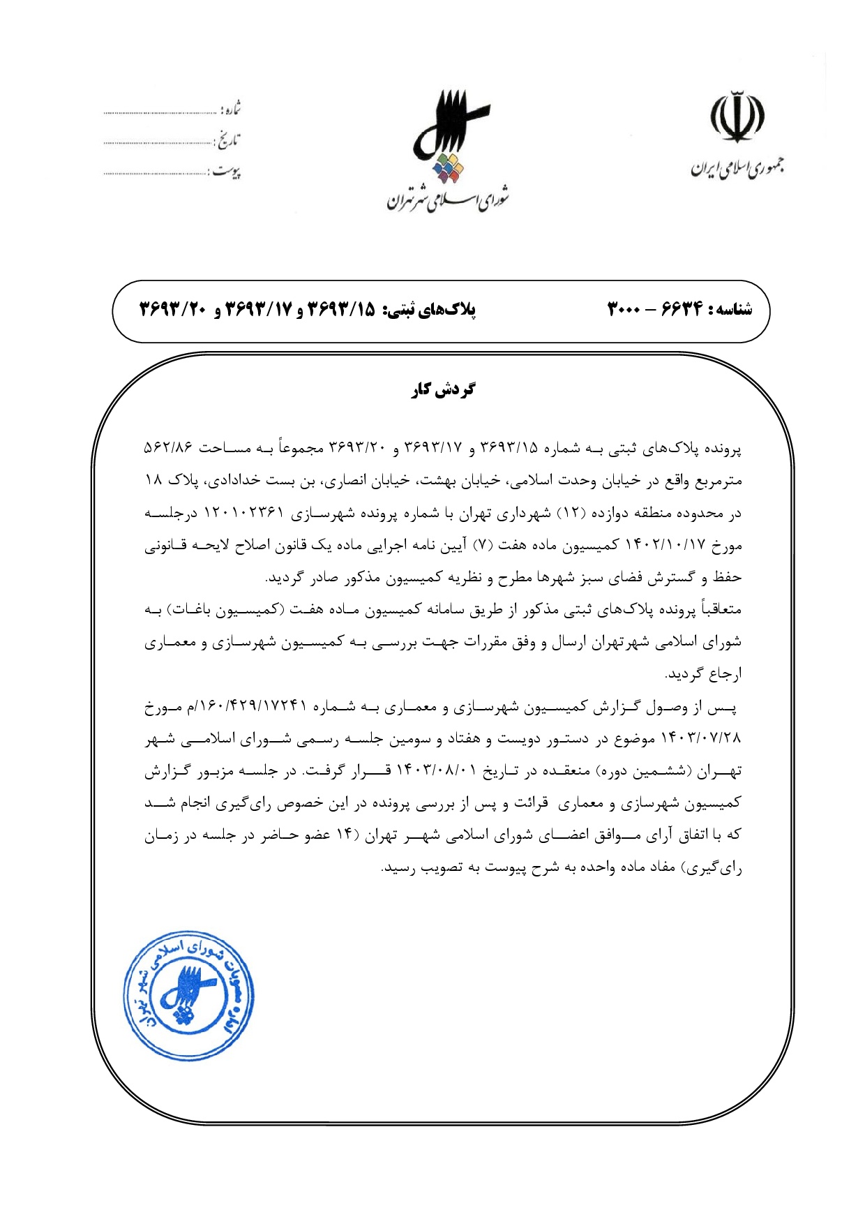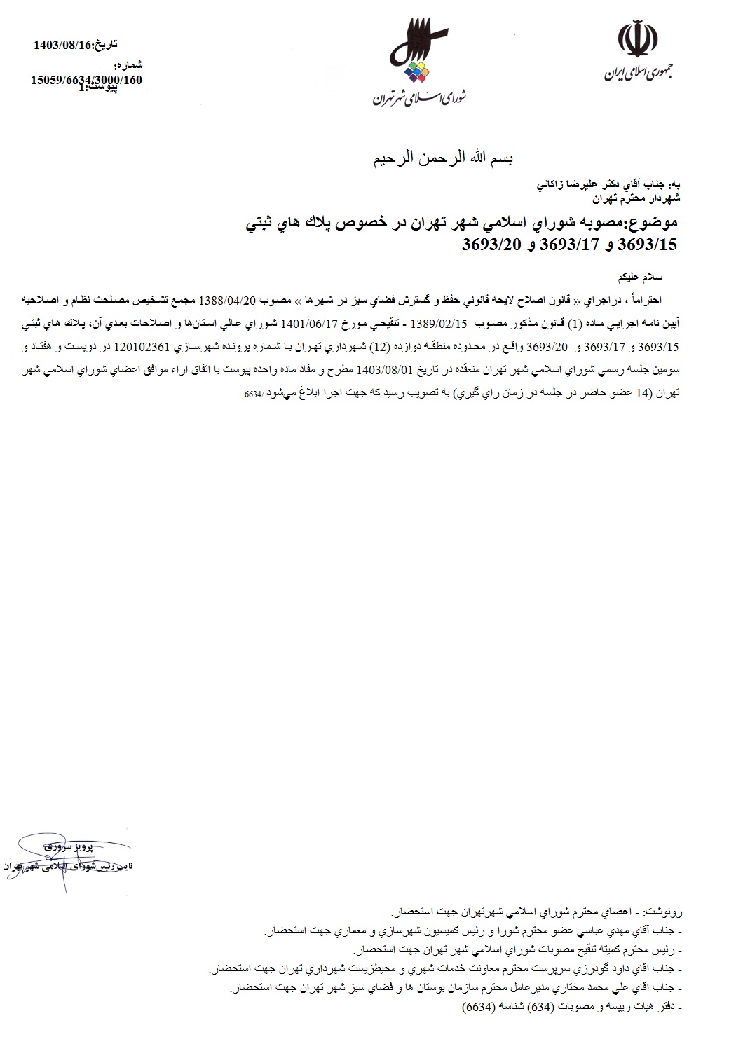 مصوبه شوراي اسلامي شهر تهران در خصوص پلاكهاي ثبتي به شماره 3693/15 و 3693/17 و 3693/20 واقع در محدوده منطقه دوازده (12) شهرداري تهران