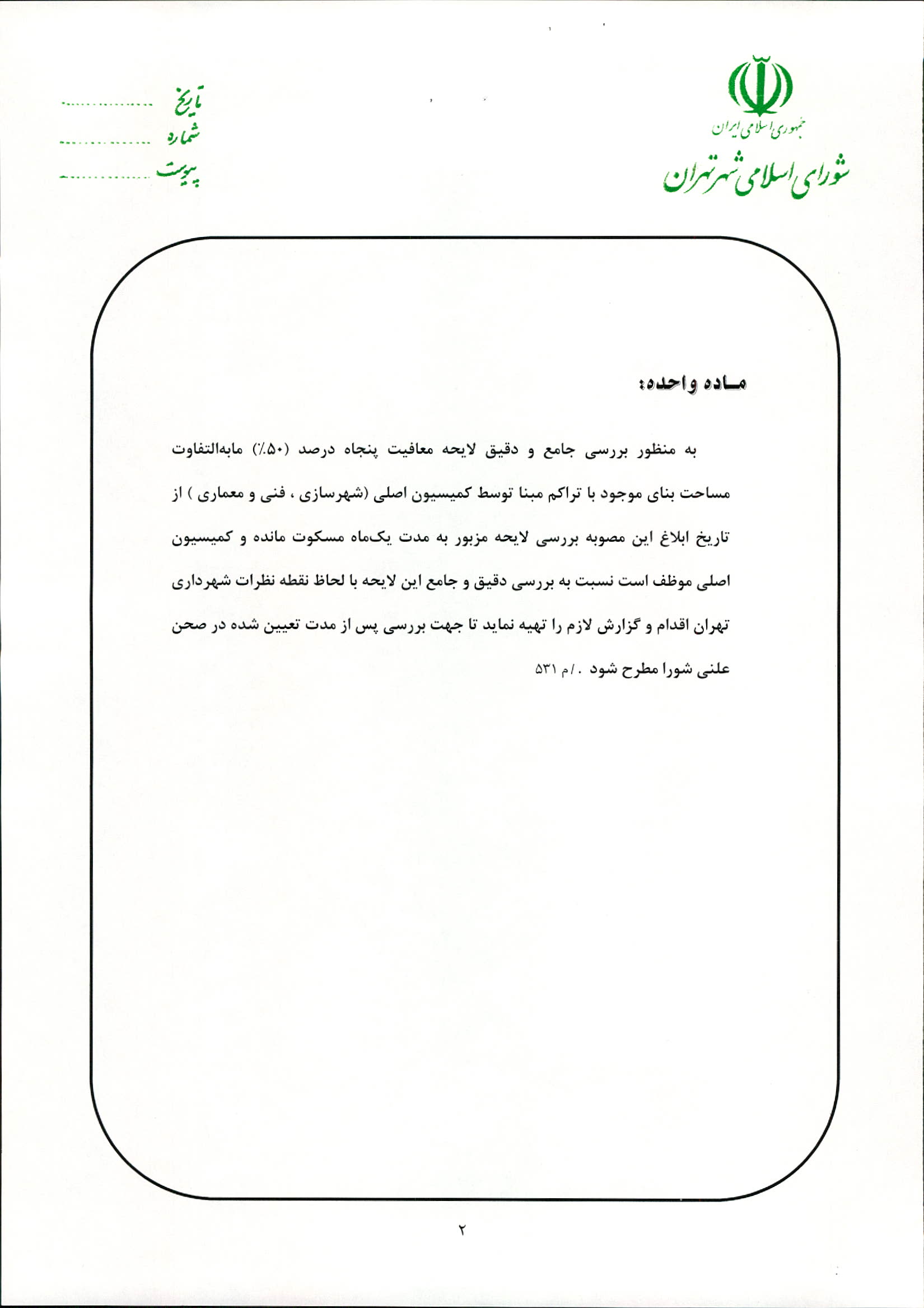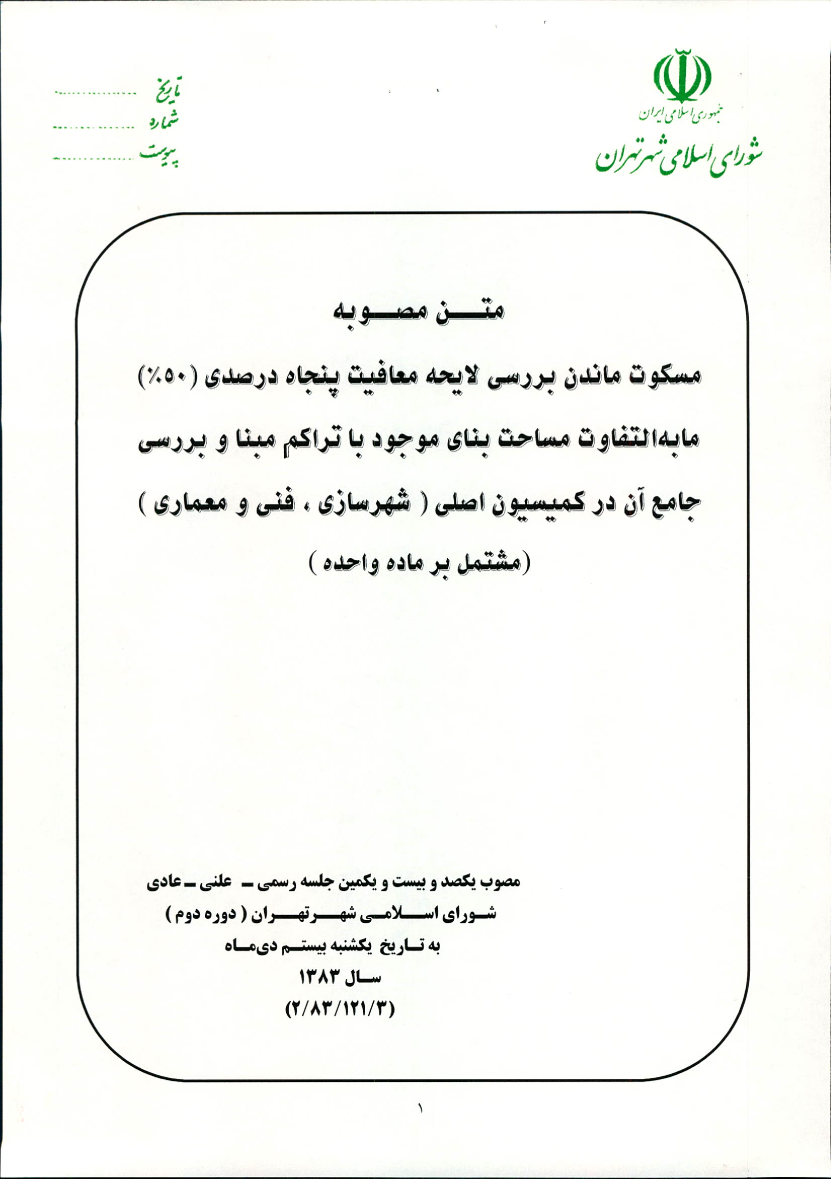 مسكوت ماندن بررسي لايحه معافيت پنجاه درصدي (50%) مابهالتفاوت مساحت بناي موجود با تراكم مبنا و بررسي جامع آن در كميسيون اصلي (شهرسازي، فني و معماري )