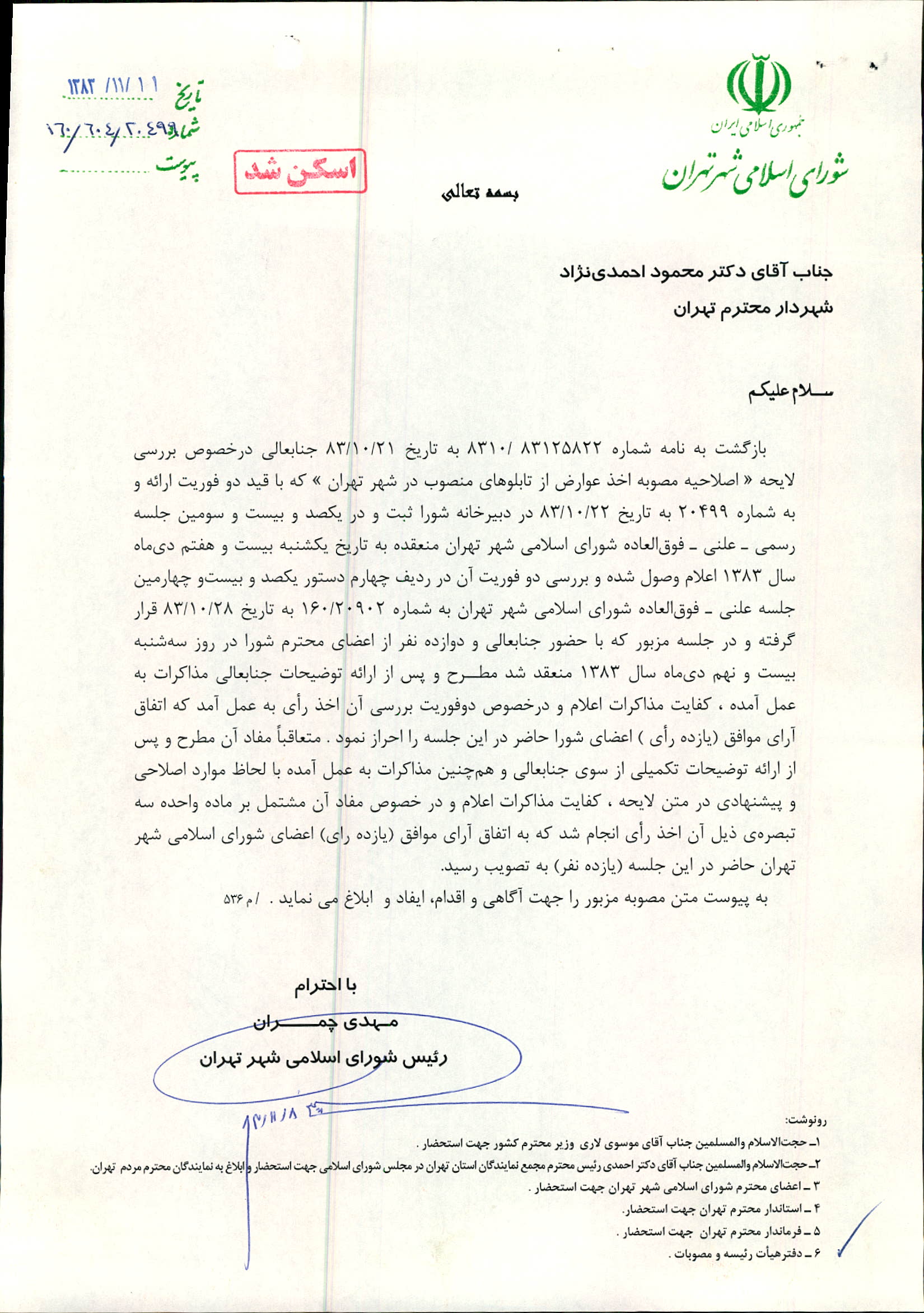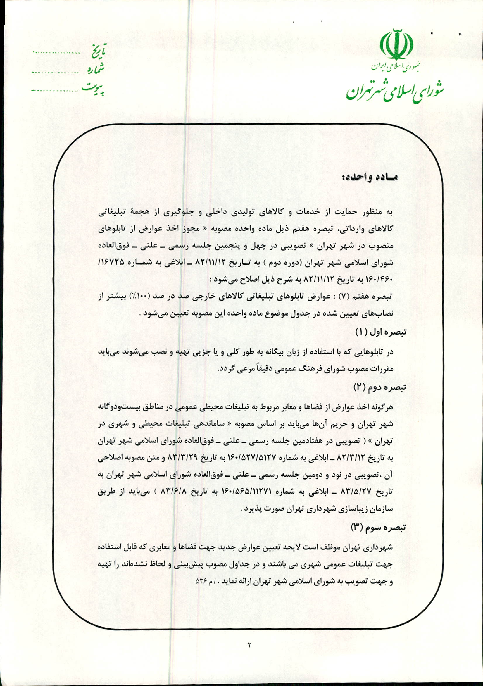اصلاحيه مصوبه «اخذ عوارض از تابلوهاي منصوب در شهر تهران» تصويبي در چهل و پنجمين جلسه رسمي-علني-فوقالعاده شوراي اسلامي شهر تهران (دوره دوم) به تاريخ 82/11/12- ابلاغي به شماره 160/460/16725 به تاريخ 82/11/12
