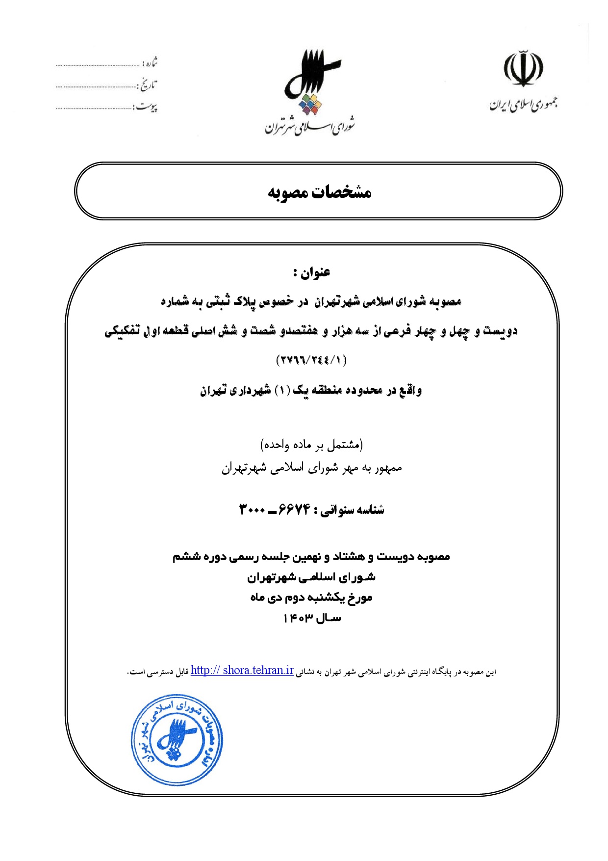 مصوبه شوراي اسلامي شهر تهران در خصوص پلاك ثبتي به شماره دويست و چهل و چهار فرعي از سه هزار و هفتصد و شصت و شش اصلي قطعه اول تفكيكي (3766/244/1) واقع در محدوده منطقه يك (1) شهرداري تهران