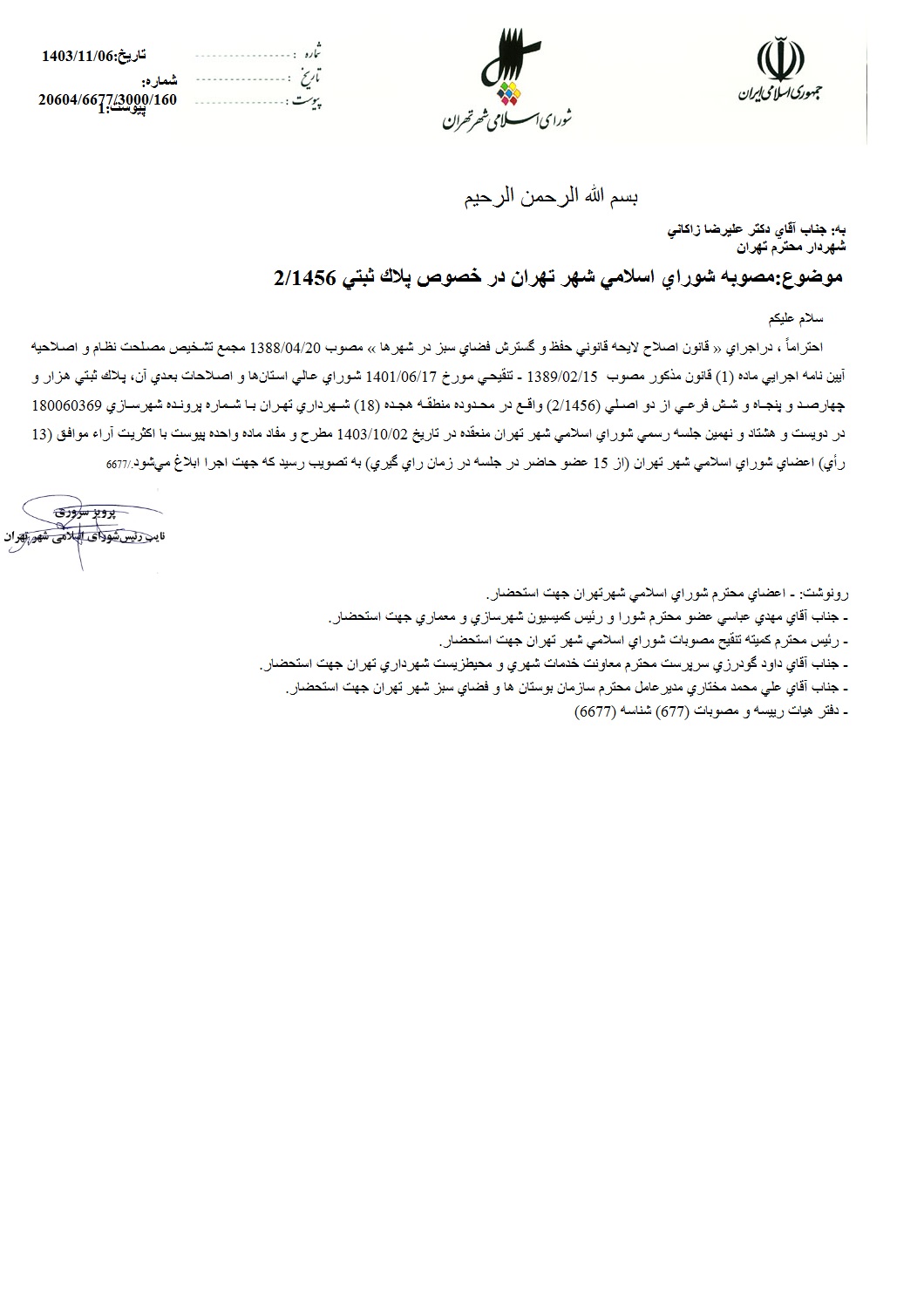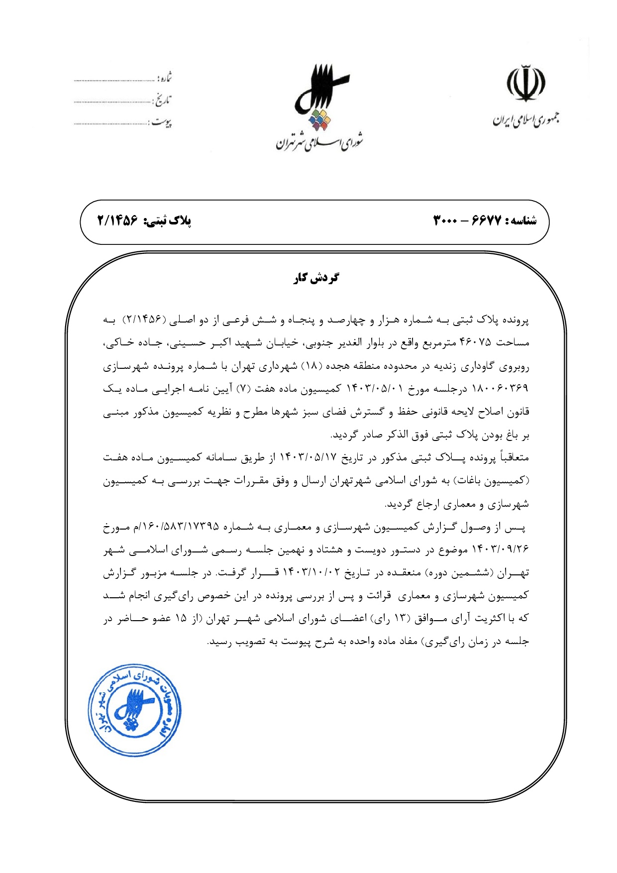 مصوبه شوراي اسلامي شهر تهران در خصوص پلاك ثبتي به شماره هزار و چهارصد و پنجاه و شش فرعي از دو اصلي (2/1456) واقع در محدوده منطقه هجده (18) شهرداري تهران