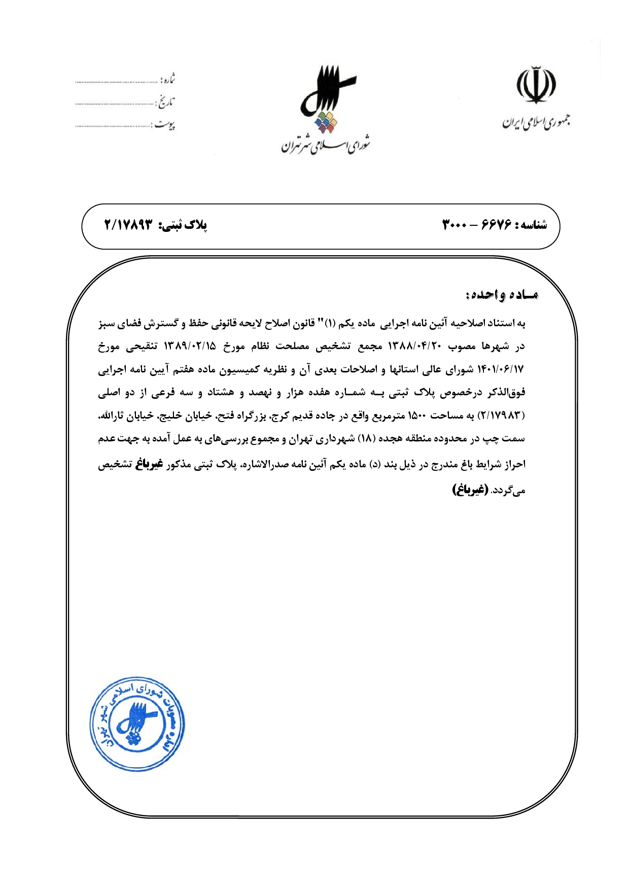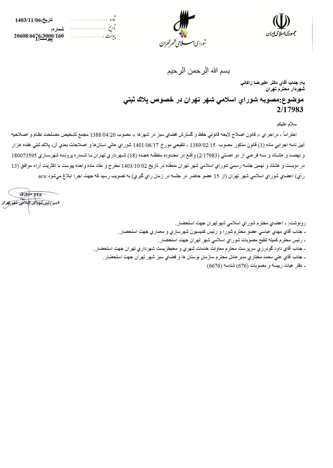 مصوبه شوراي اسلامي شهر تهران در خصوص پلاك ثبتي به شماره هفده هزار و نهصد و هشتاد و سه فرعي از دو اصلي (2/17983) واقع در محدوده منطقه هجده (18) شهرداري تهران