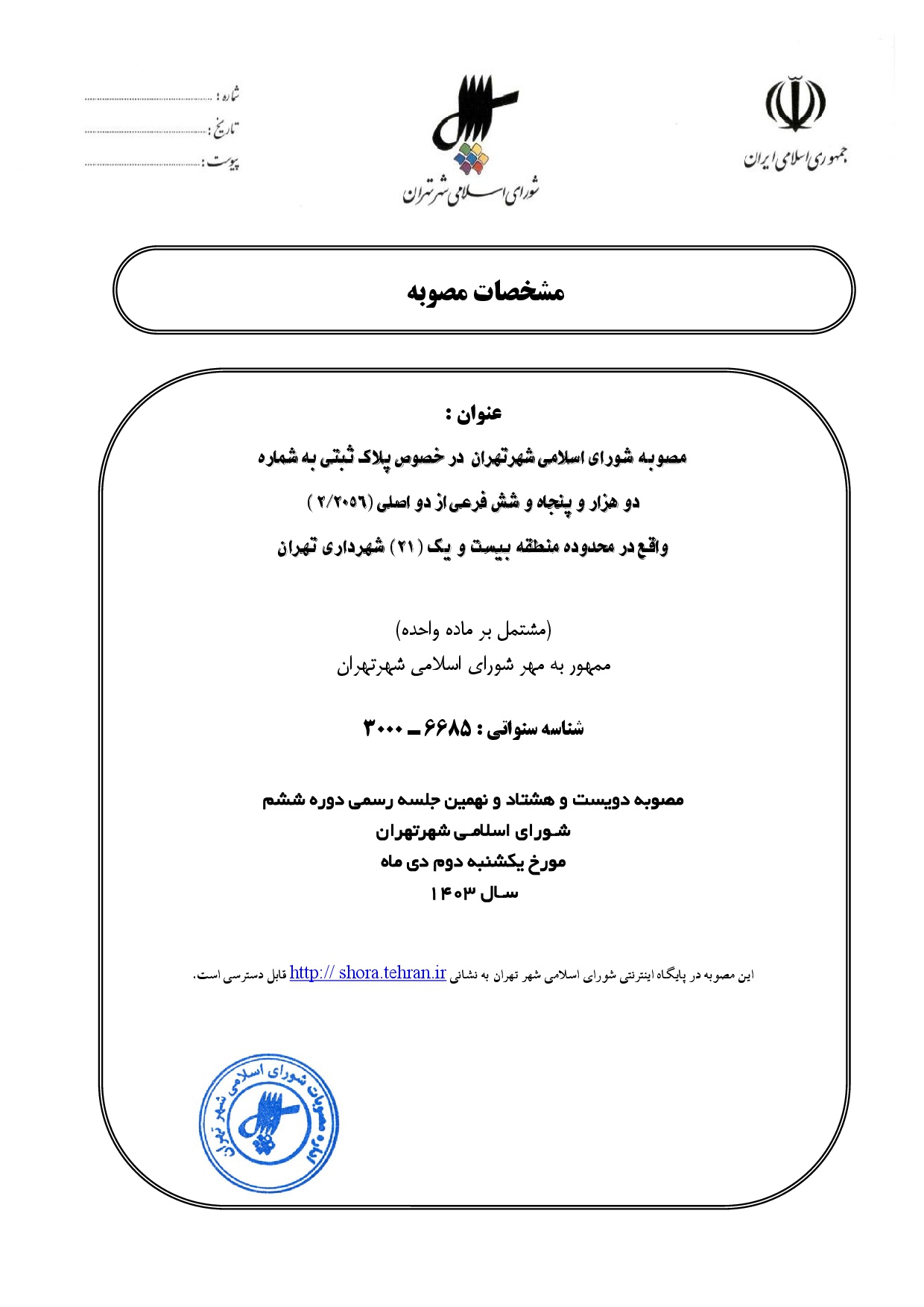 مصوبه شوراي اسلامي شهر تهران در خصوص پلاك ثبتي به شماره دو هزار و پنجاه و شش فرعي از دو اصلي (2/2056) واقع در محدوده منطقه بيست و يك (21) شهرداري تهران