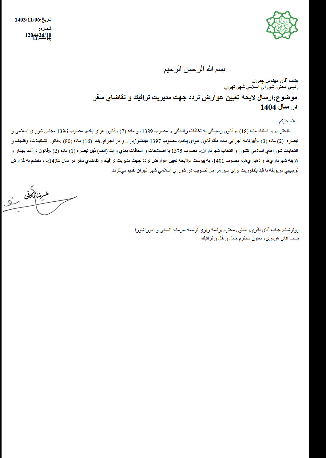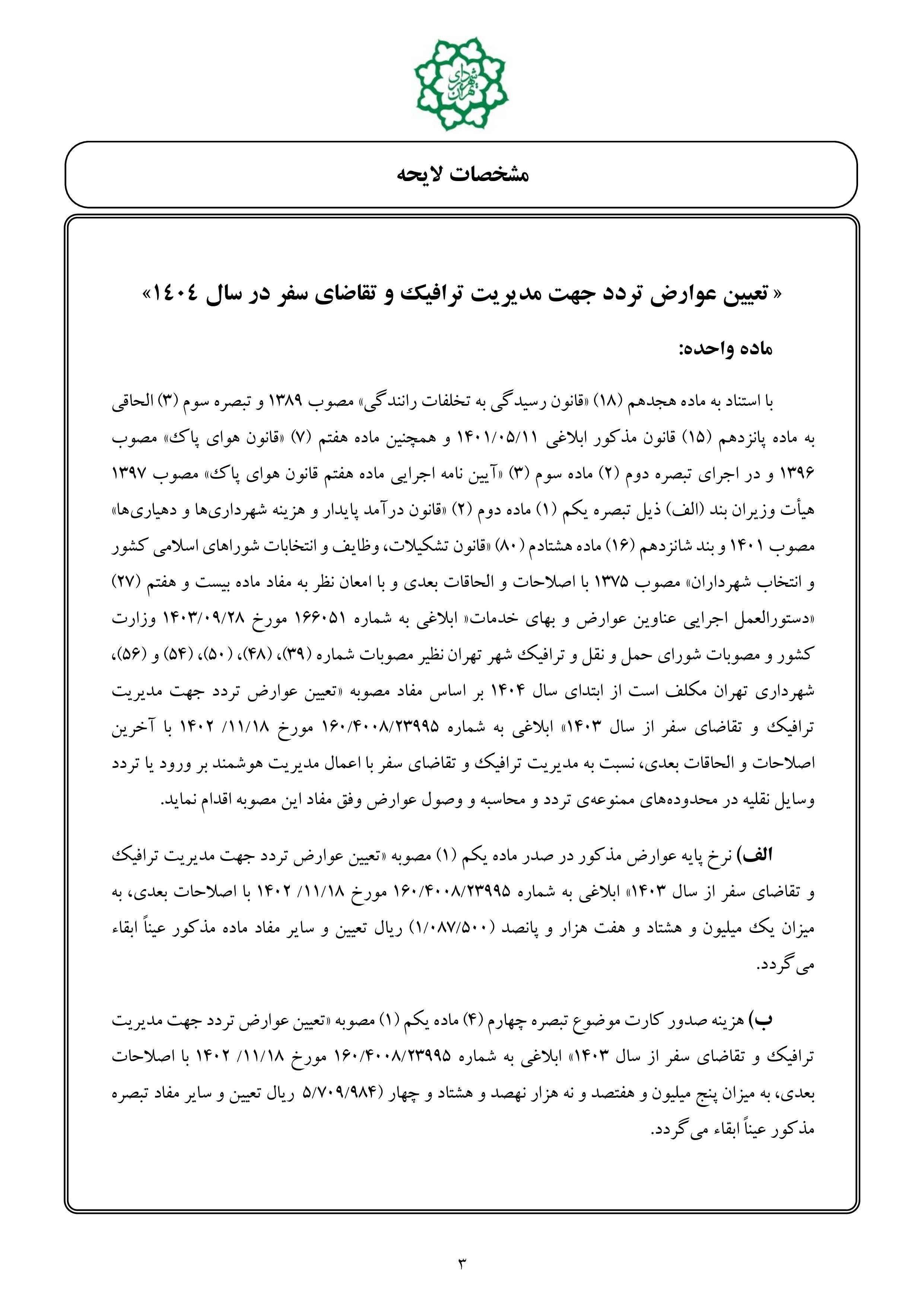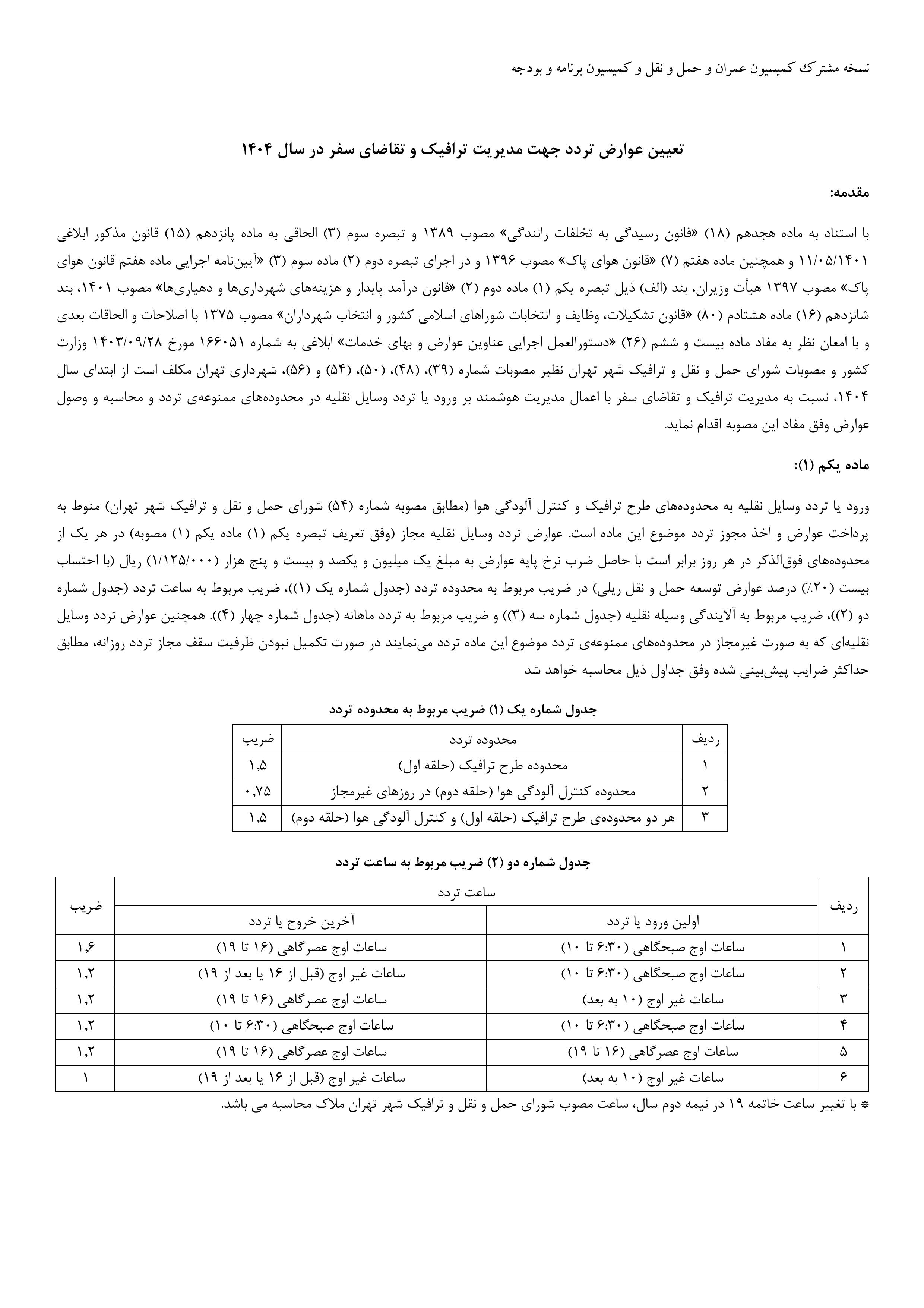 تعيين عوارض تردد جهت مديريت ترافيك و تقاضاي سفر از سال 1404