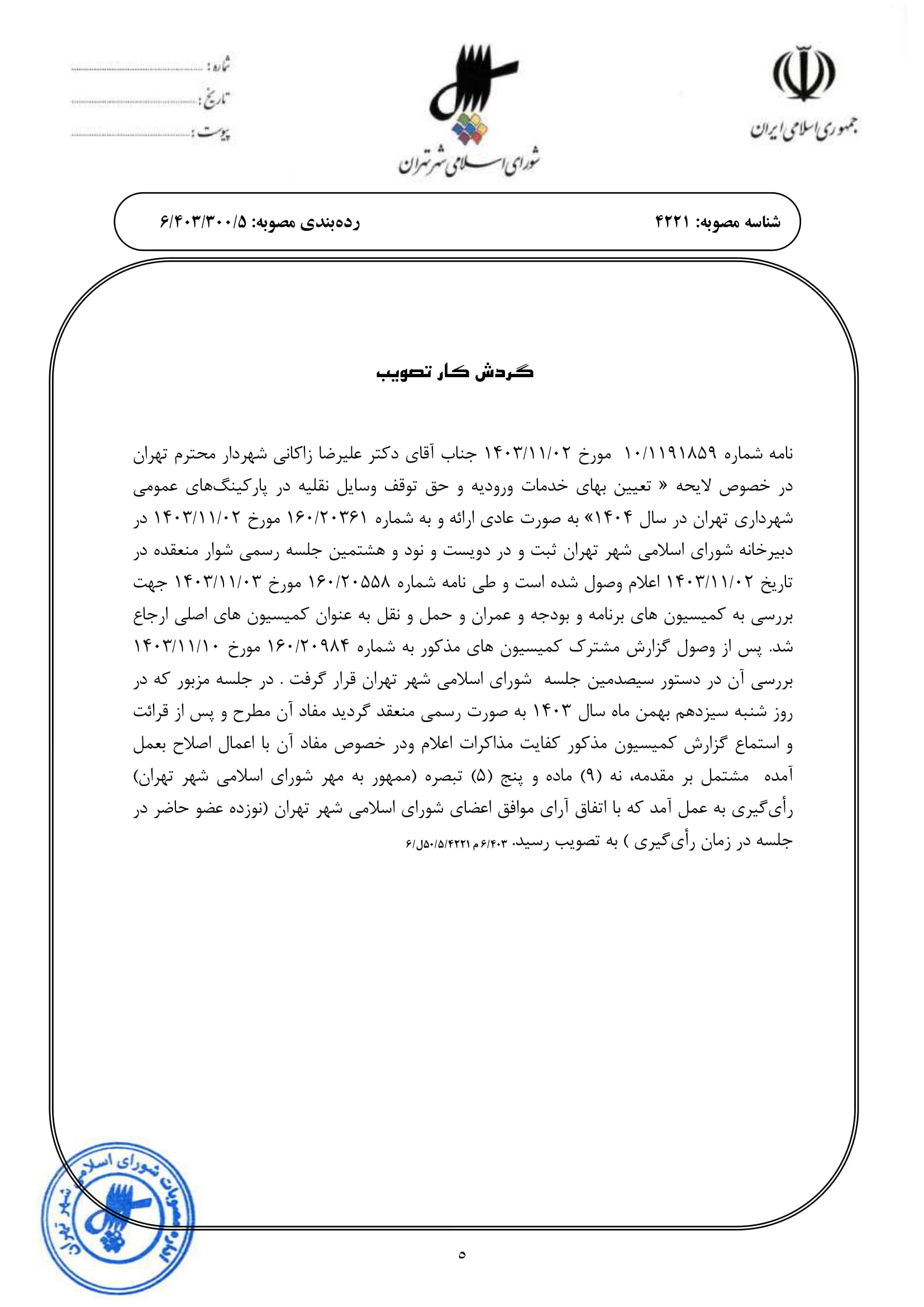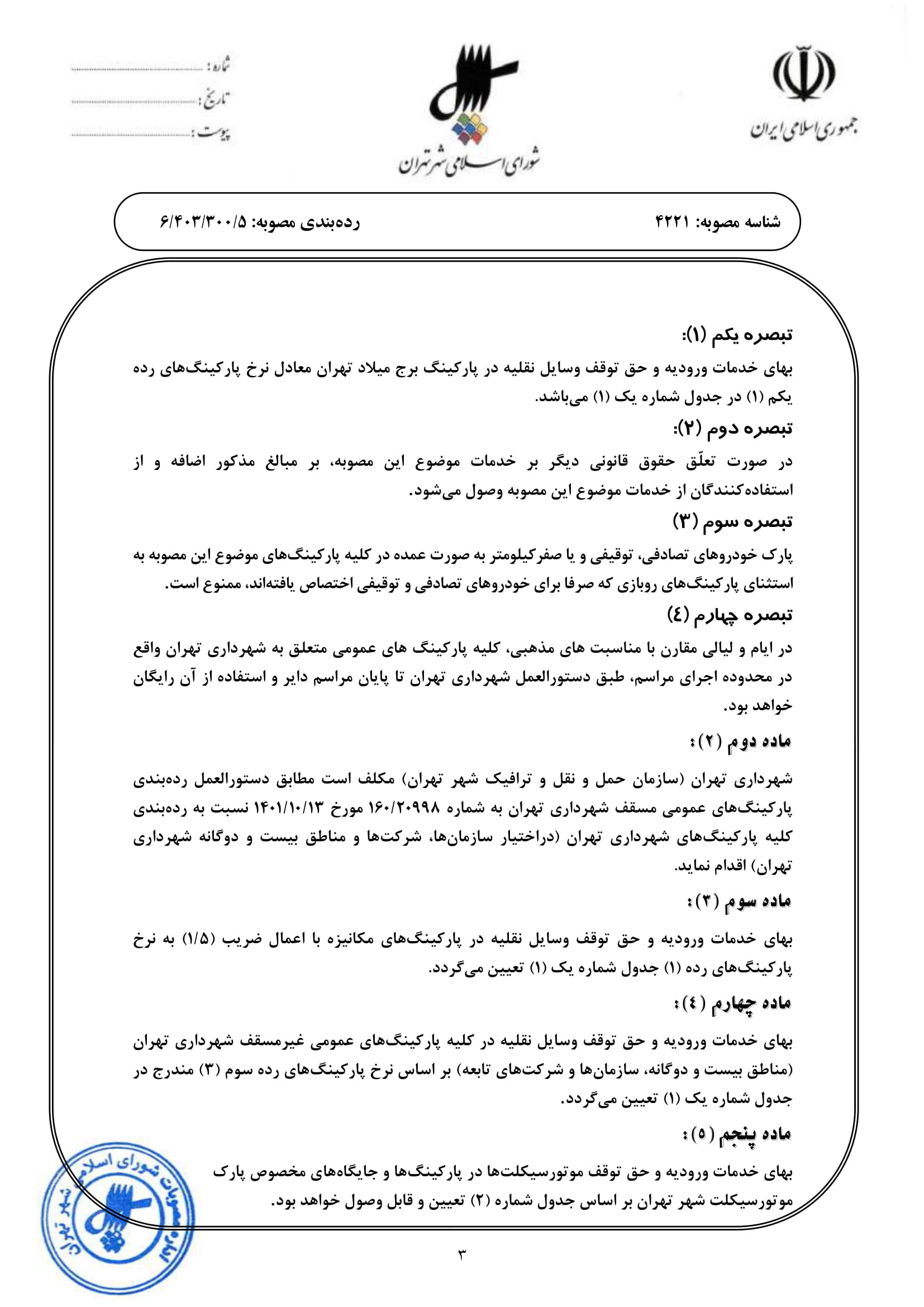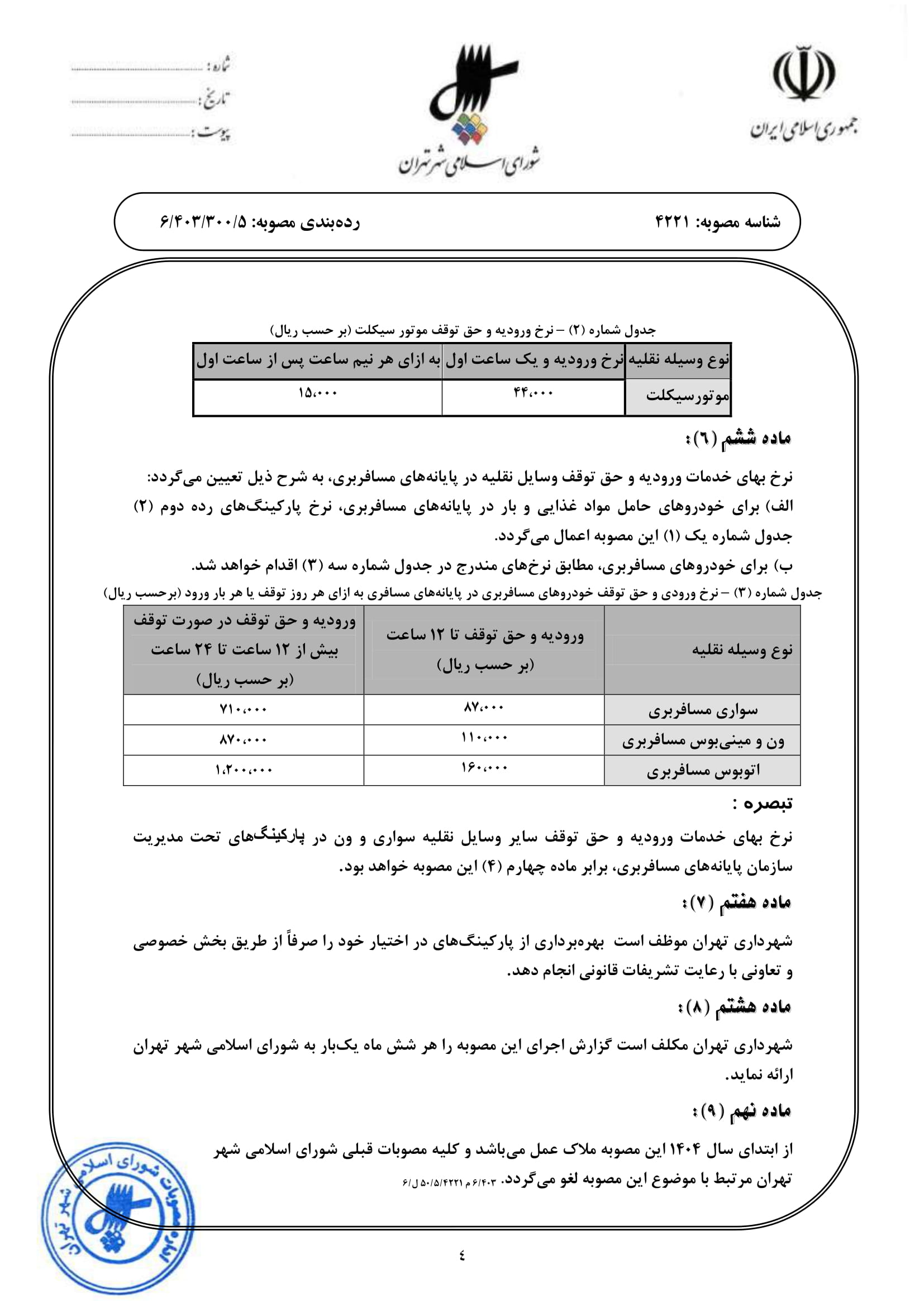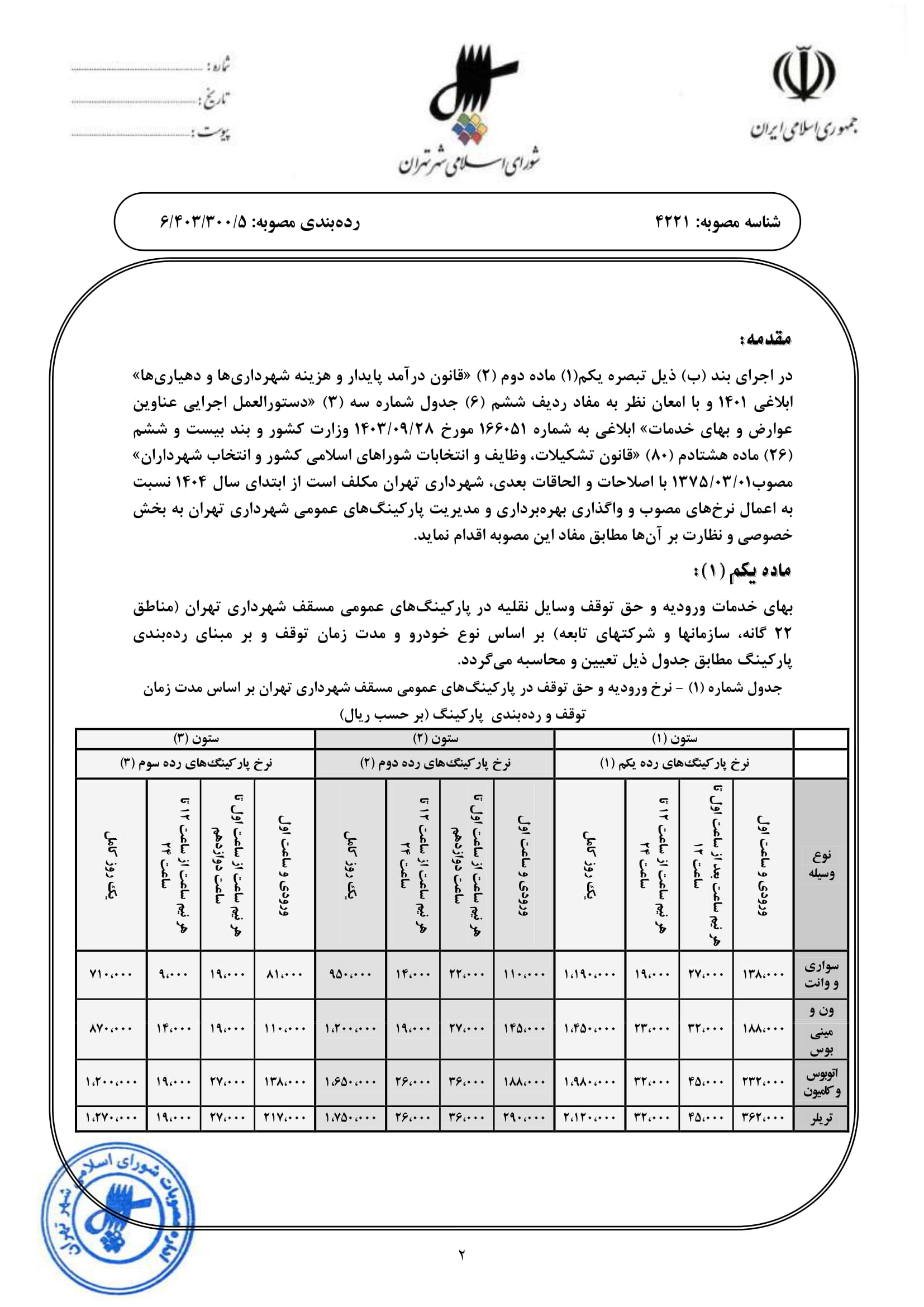 تعيين بهاي خدمات وروديه و حق توقف وسايل نقليه در پاركينگهاي عمومي شهرداري تهران در سال 1404