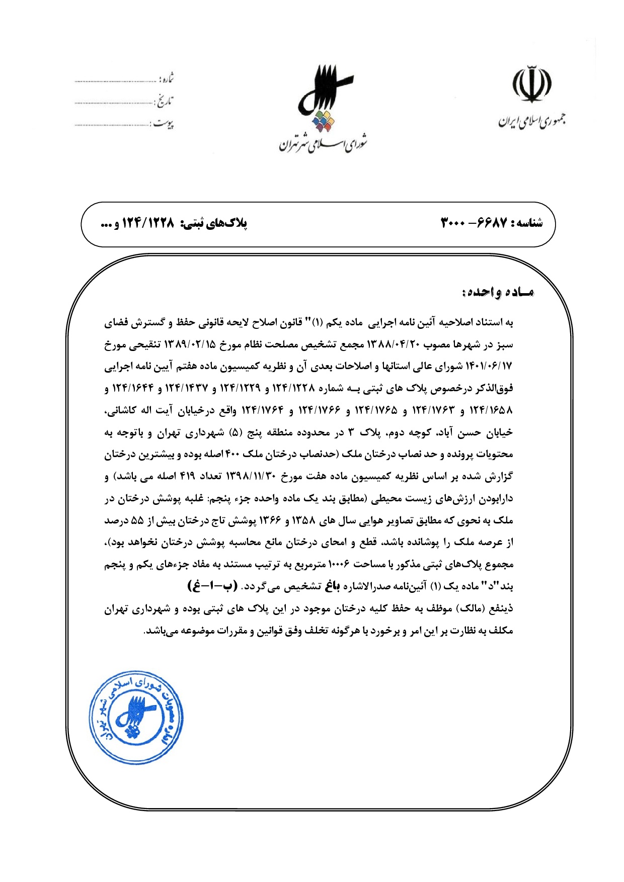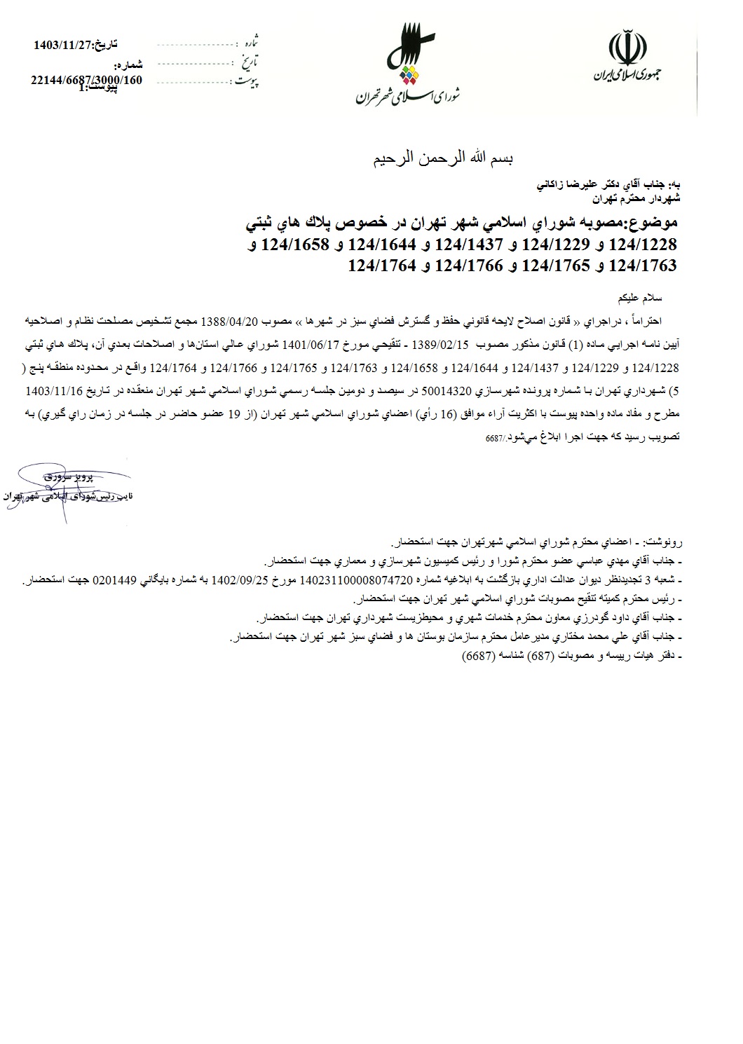 مصوبه شوراي اسلامي شهر تهران در خصوص پلاكهاي ثبتي به شماره (124/1228 و 124/1229 و 124/1437و 124/1644 و 124/1658 و 124/1763 و 124/1765 و 124/1766 و 124/1764) واقع در محدوده منطقه پنج (5) شهرداري تهران