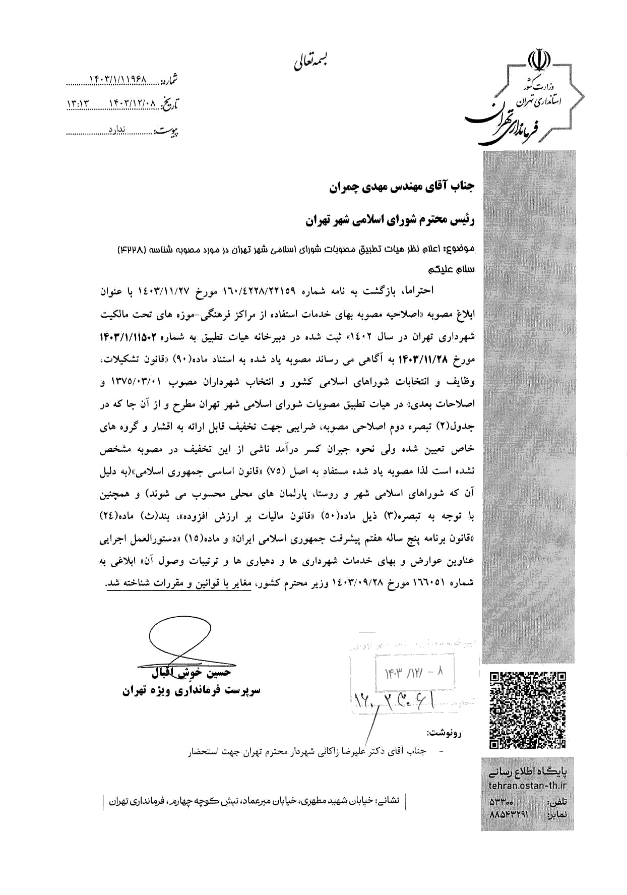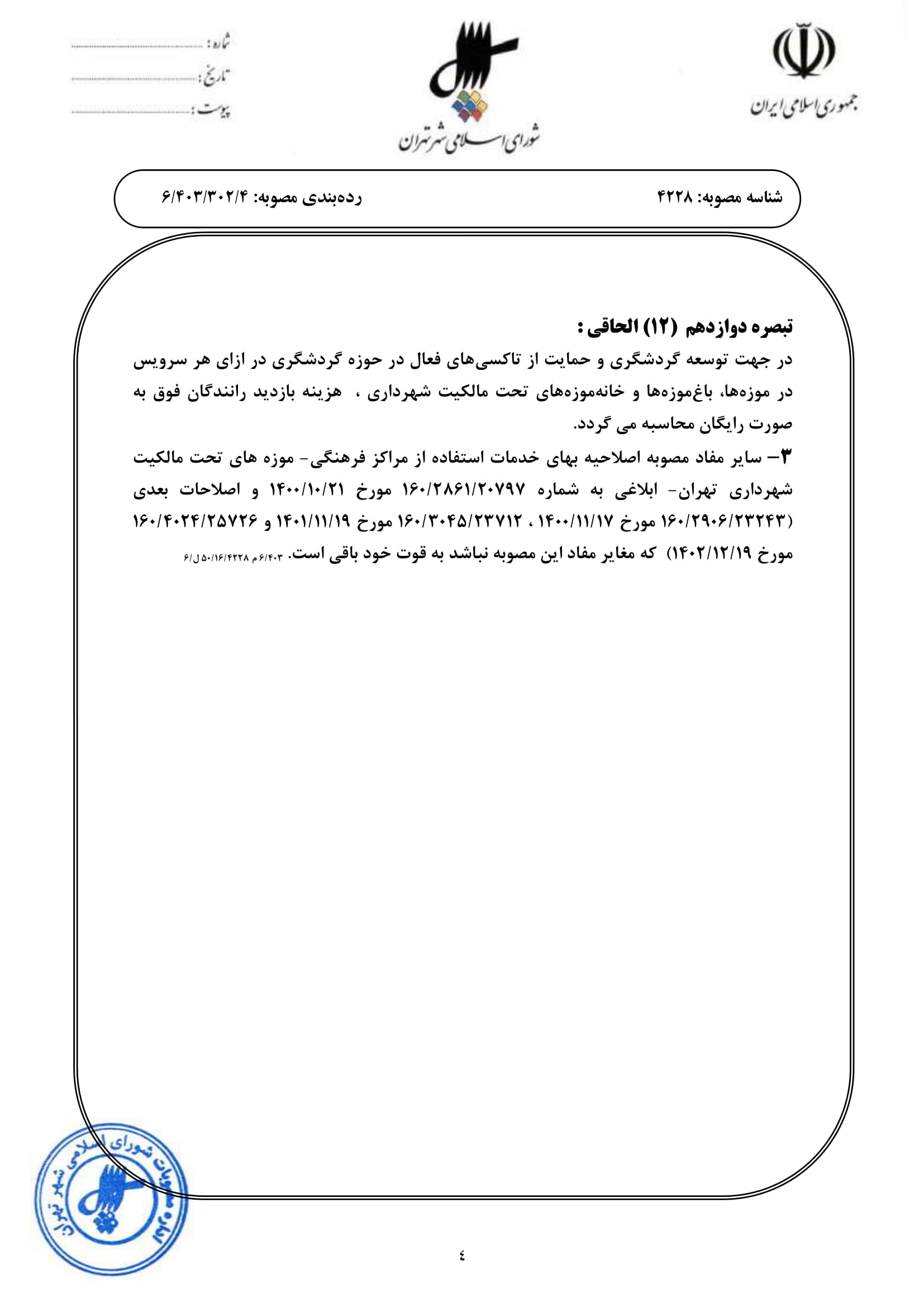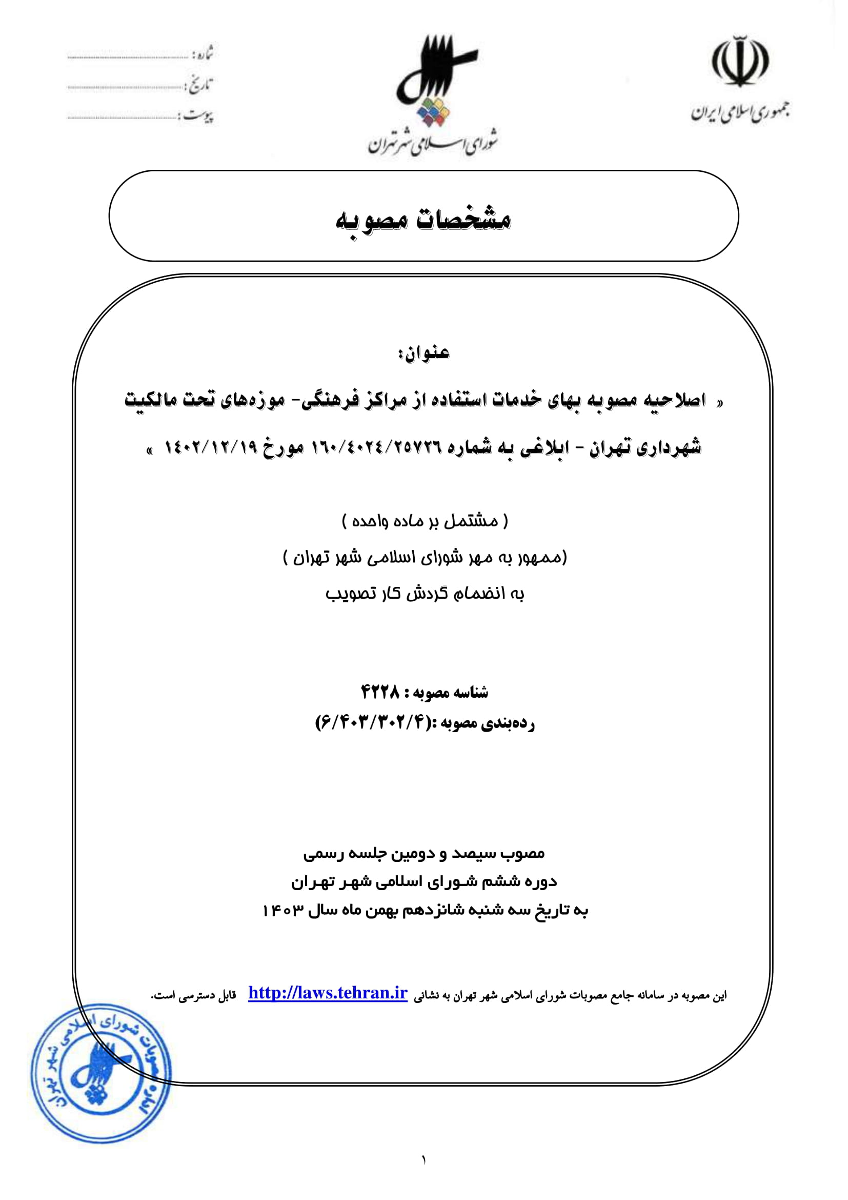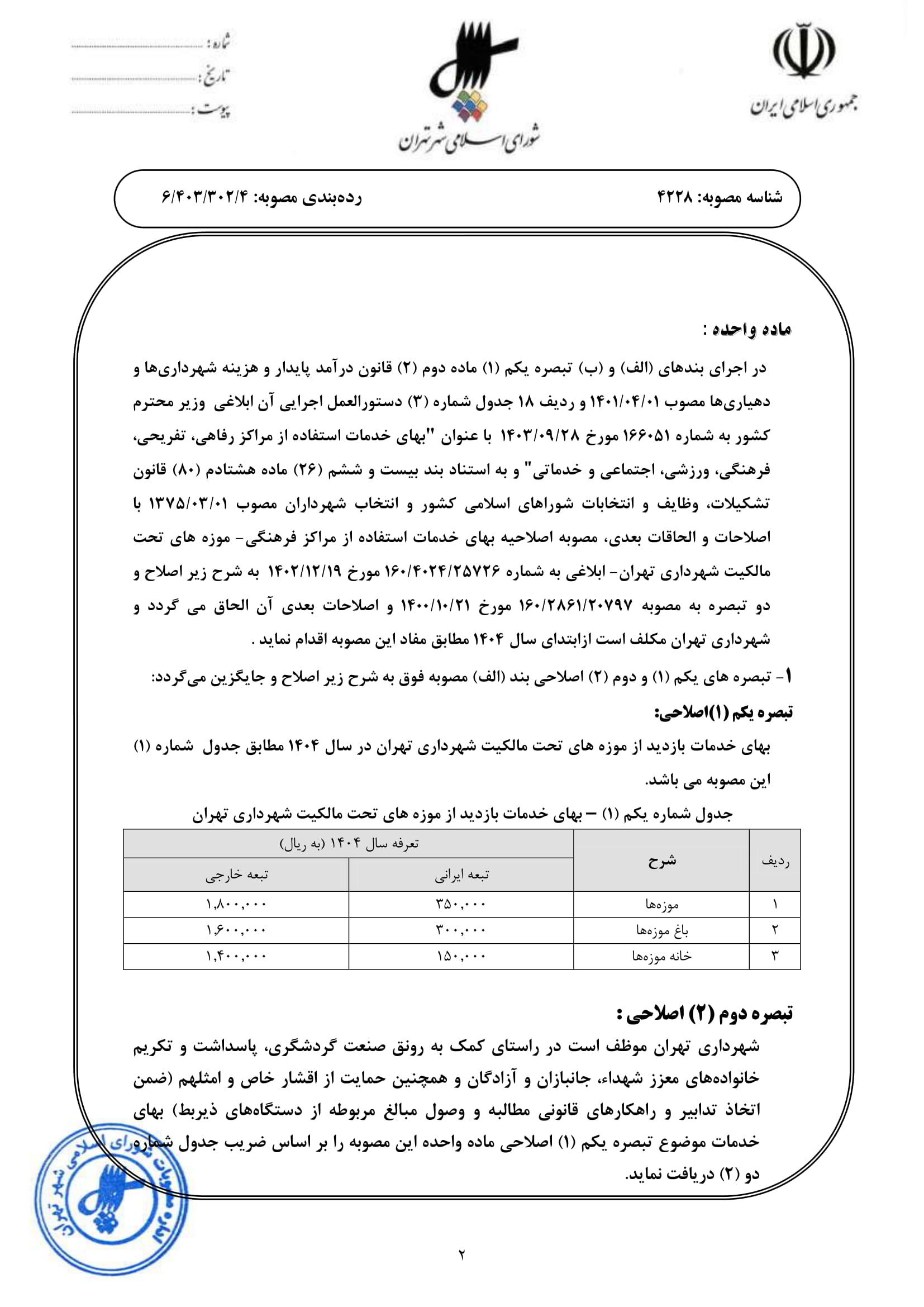 اصلاحيه مصوبه «بهاي خدمات استفاده از مراكز فرهنگي - موزههاي تحت مالكيت شهرداري تهران» - ابلاغي به شماره 160/4024/25726 مورخ 1402/12/19