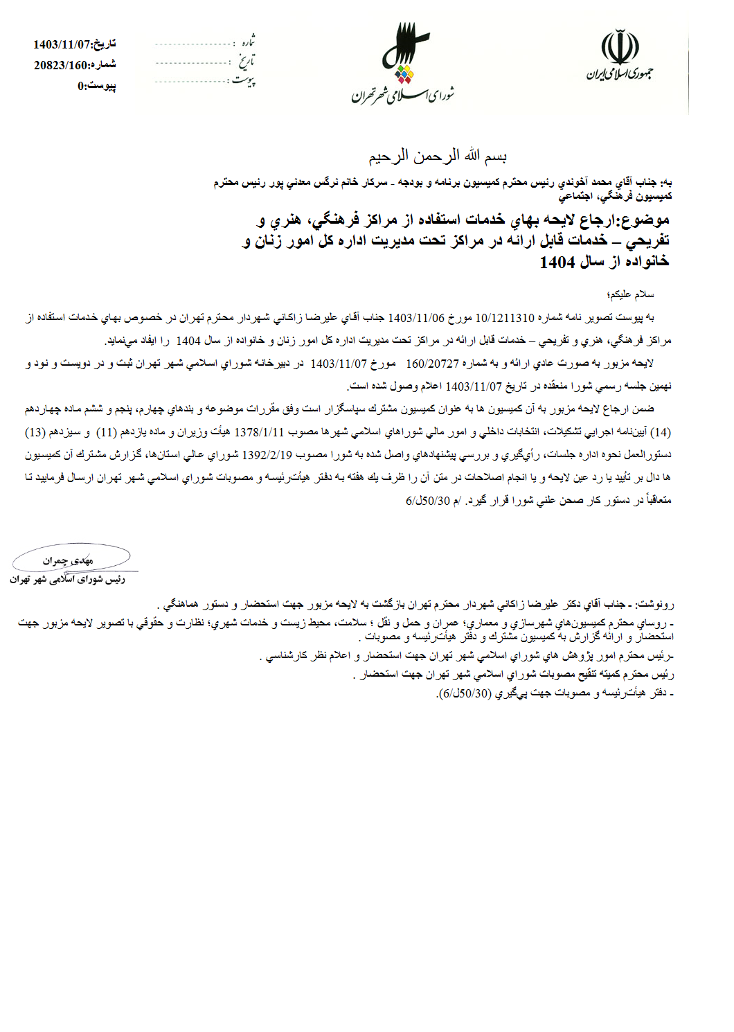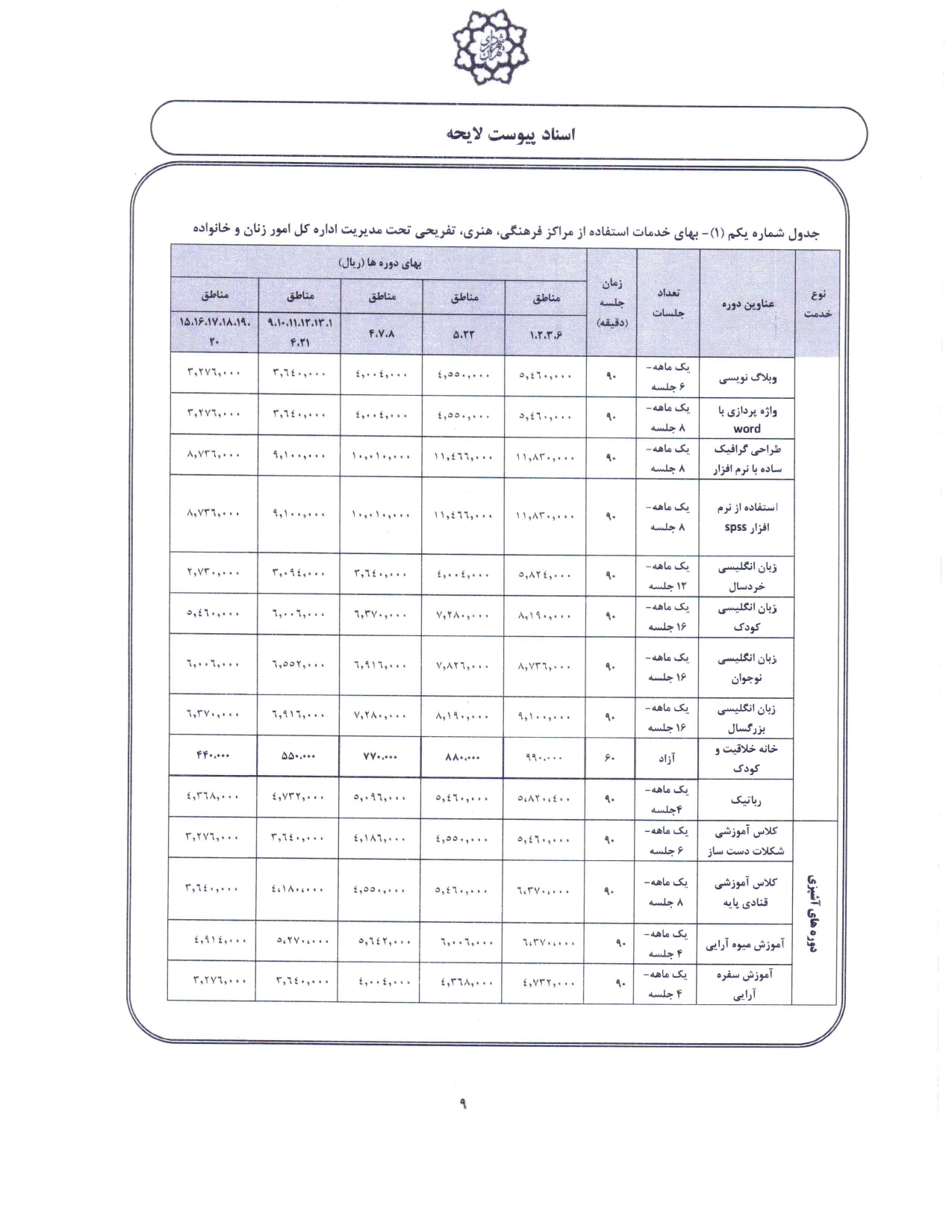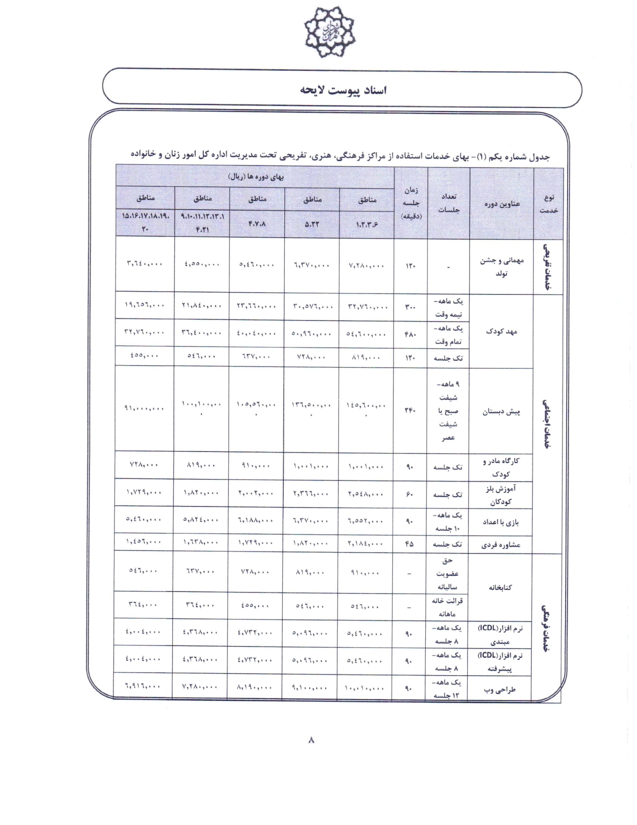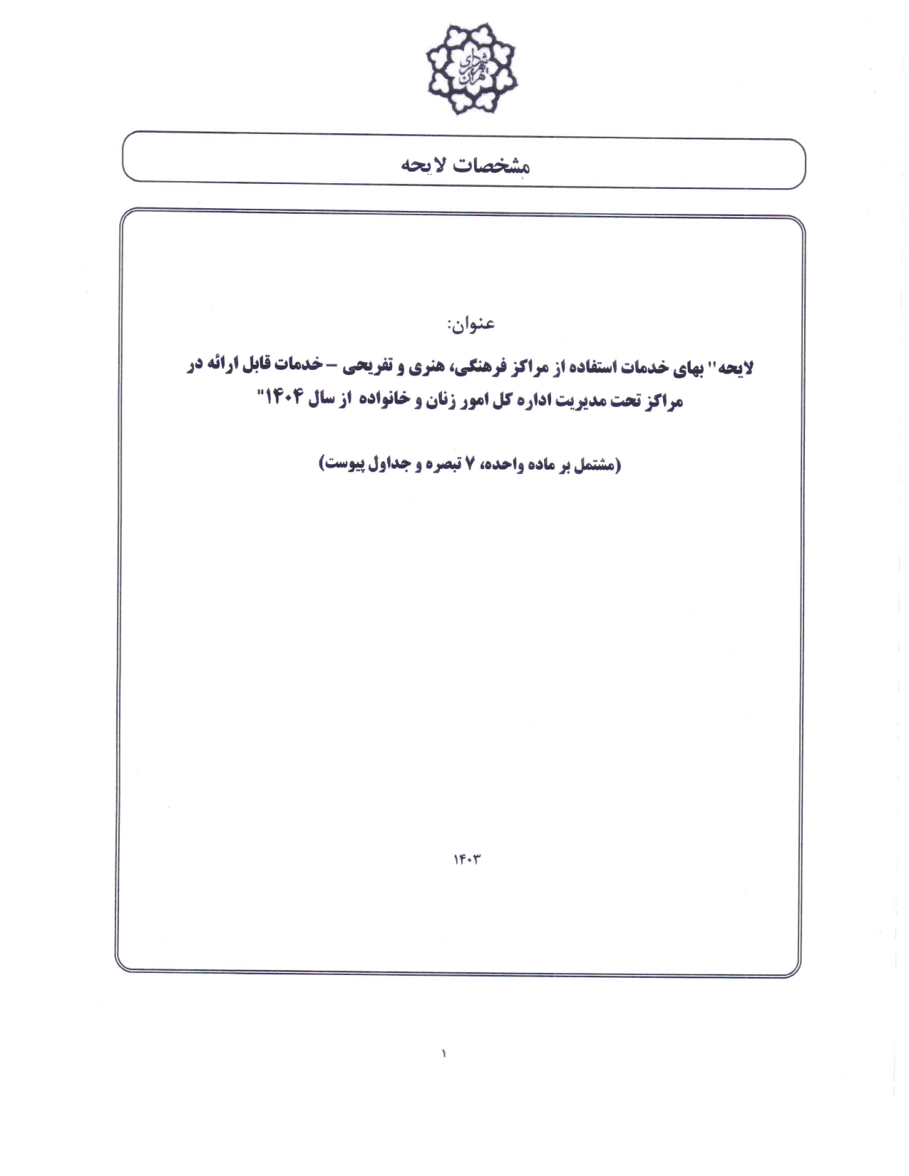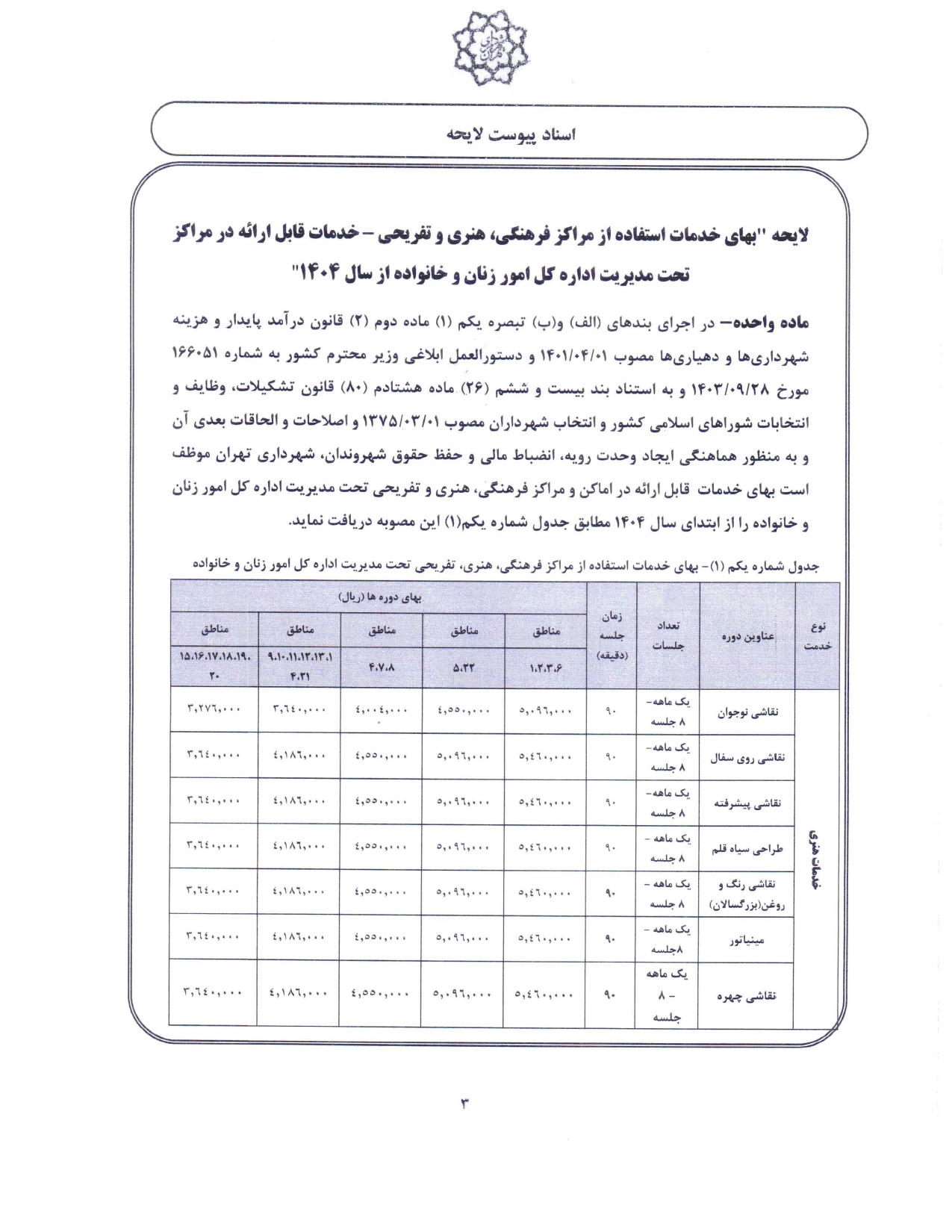 تعيين بهاي خدمات استفاده از مراكز فرهنگي، هنري و تفريحي خدمات قابل ارائه در مراكز تحت مديريت مركز زنان و خانواده شهرداري تهران از سال 1404