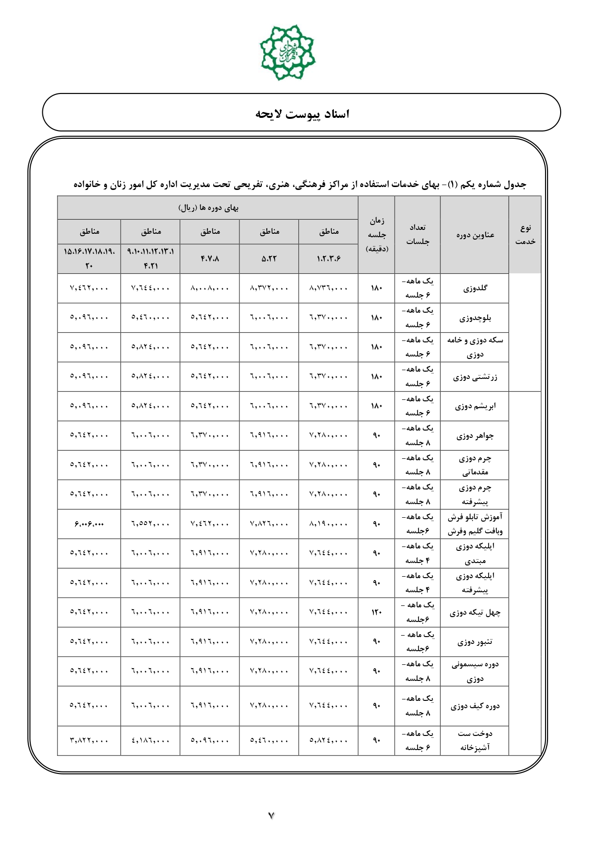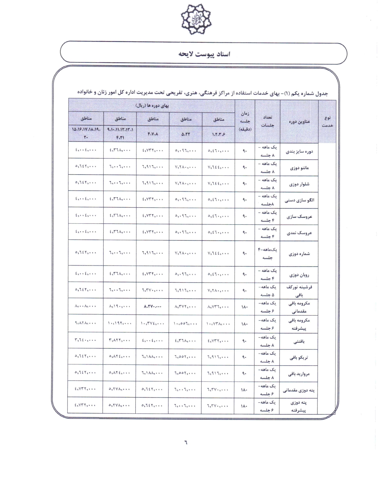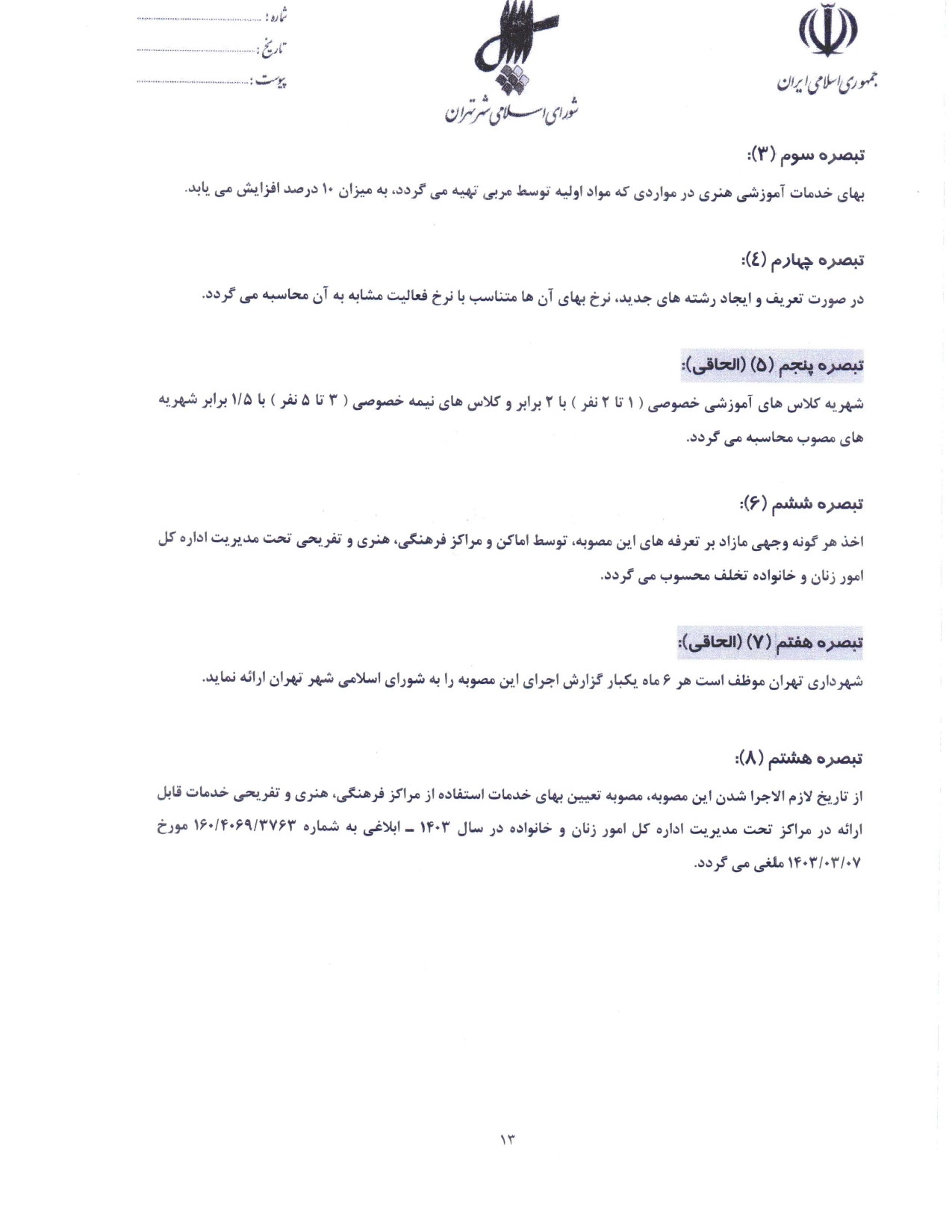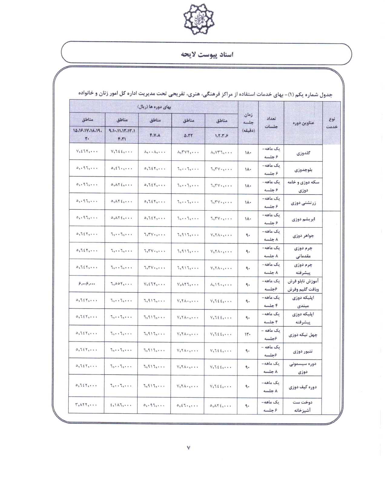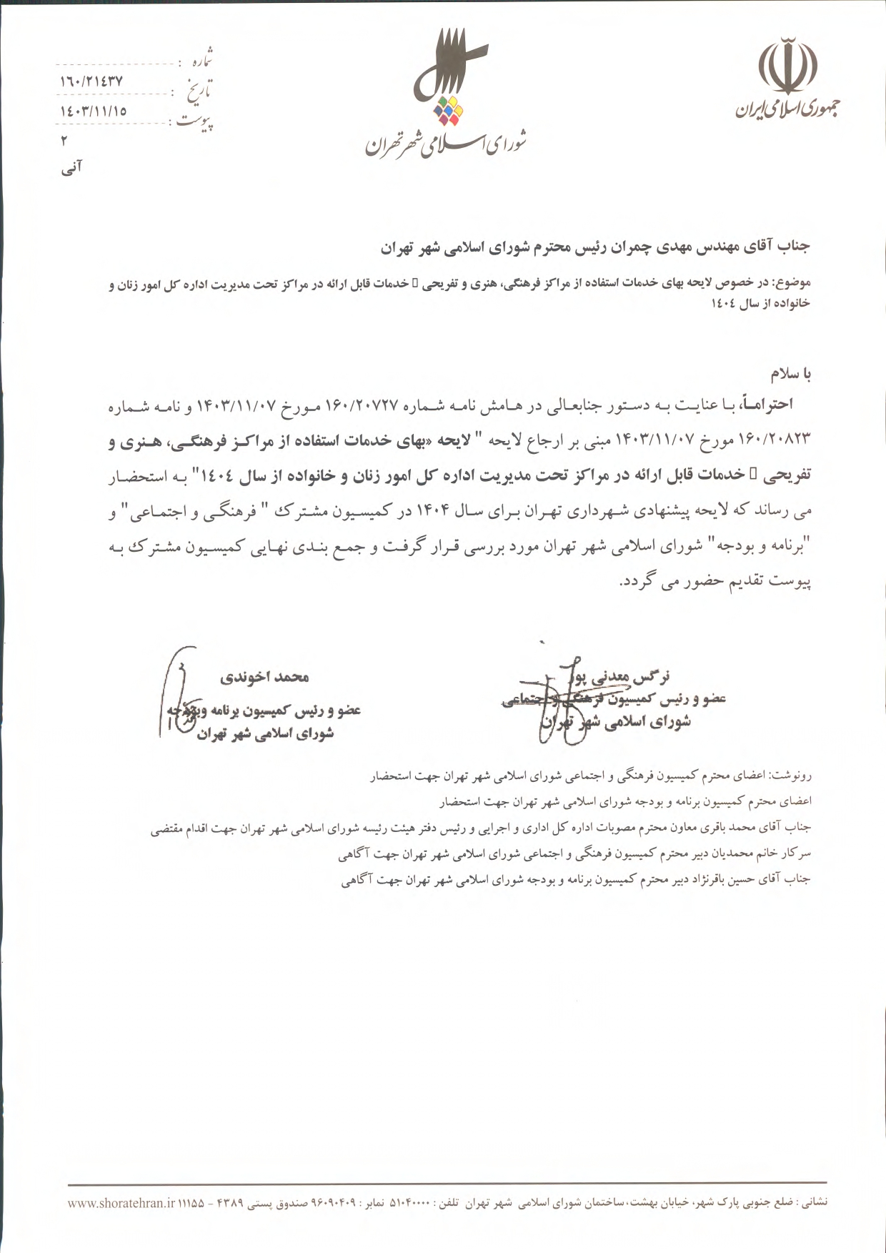 تعيين بهاي خدمات استفاده از مراكز فرهنگي، هنري و تفريحي خدمات قابل ارائه در مراكز تحت مديريت مركز زنان و خانواده شهرداري تهران از سال 1404