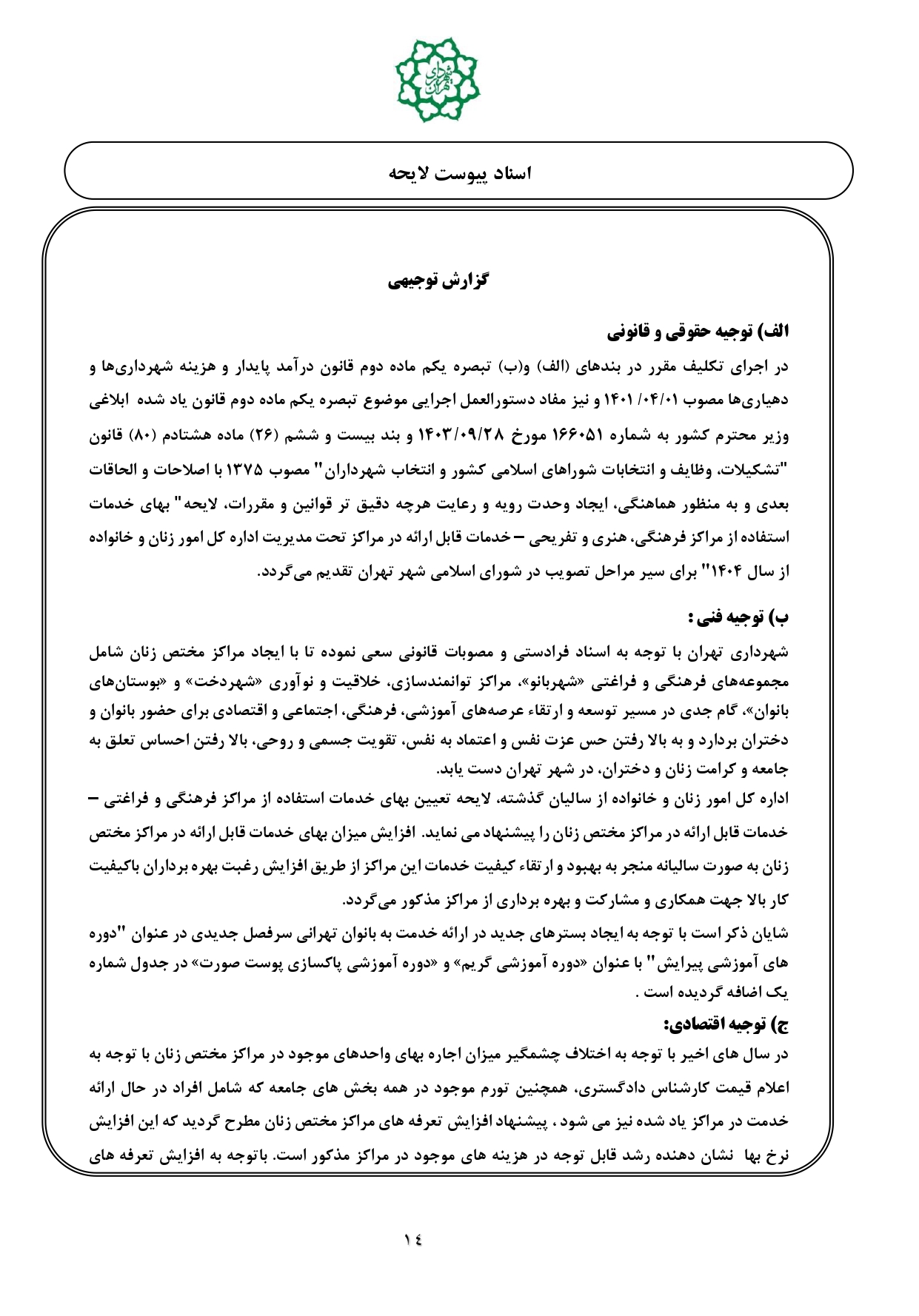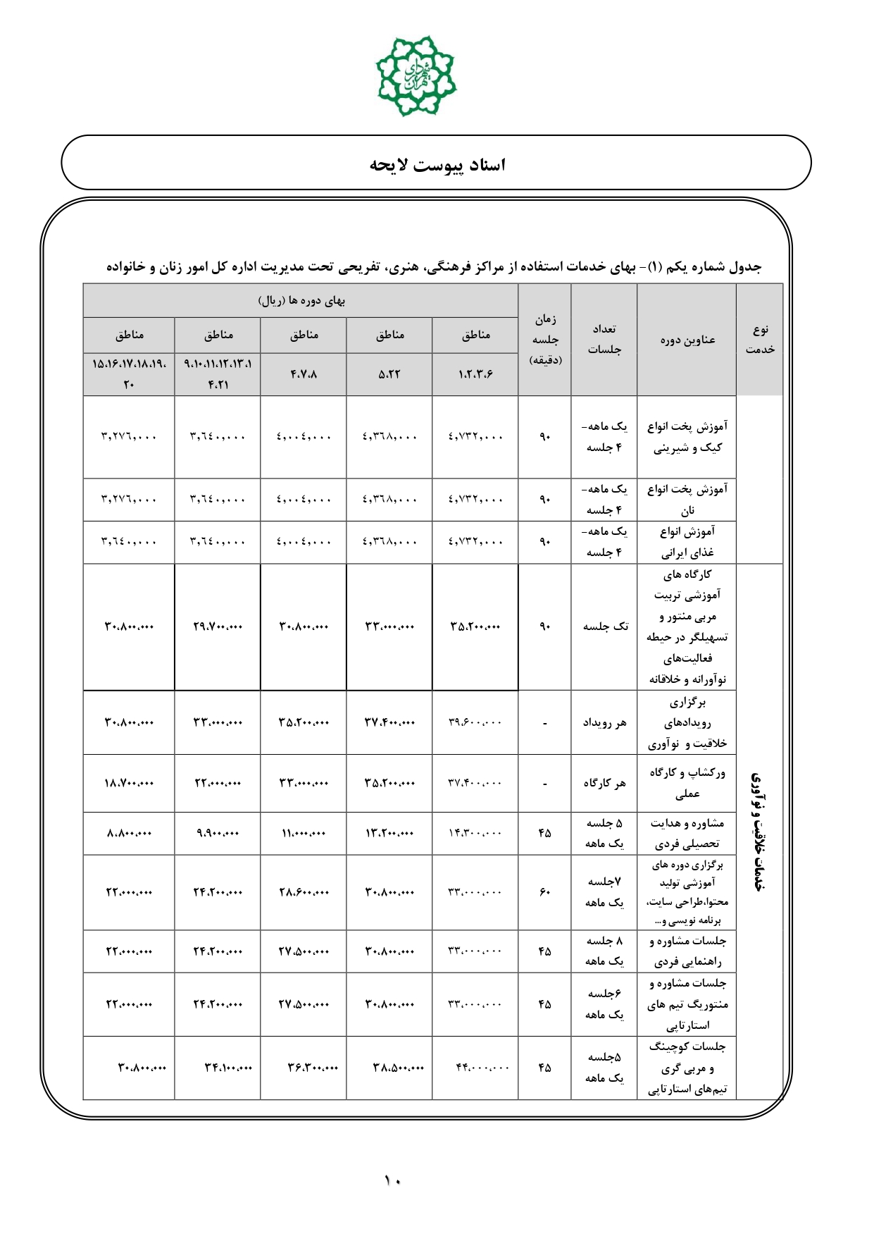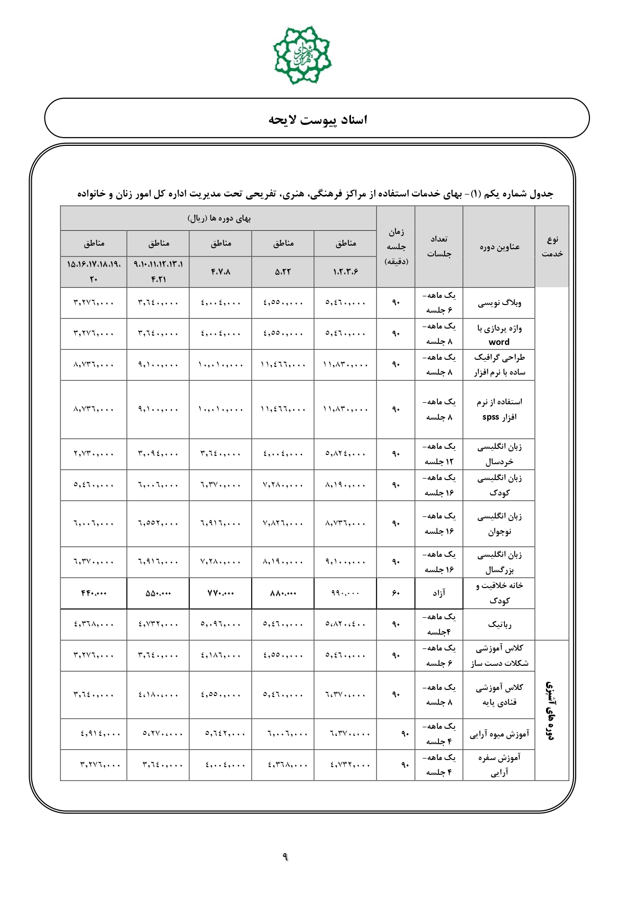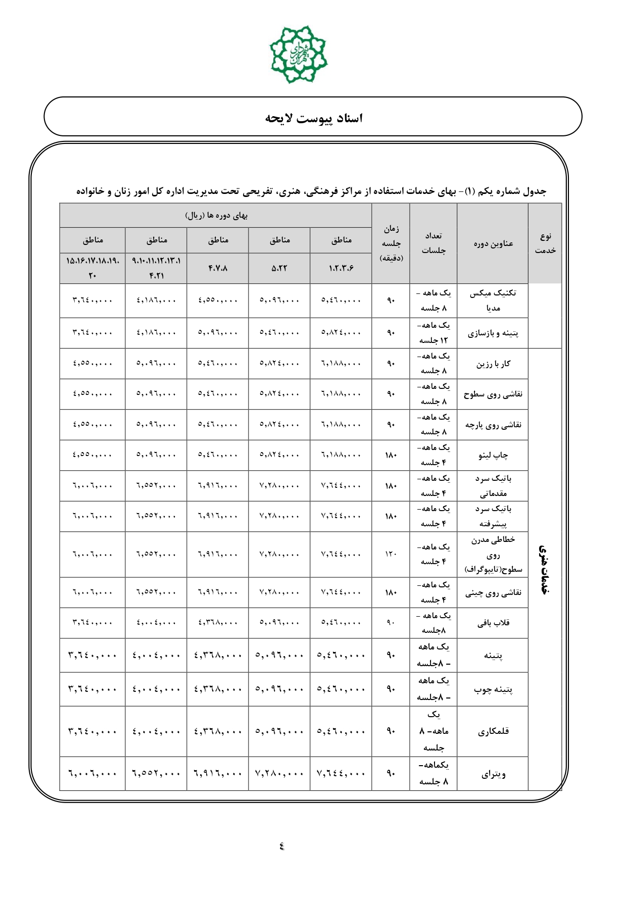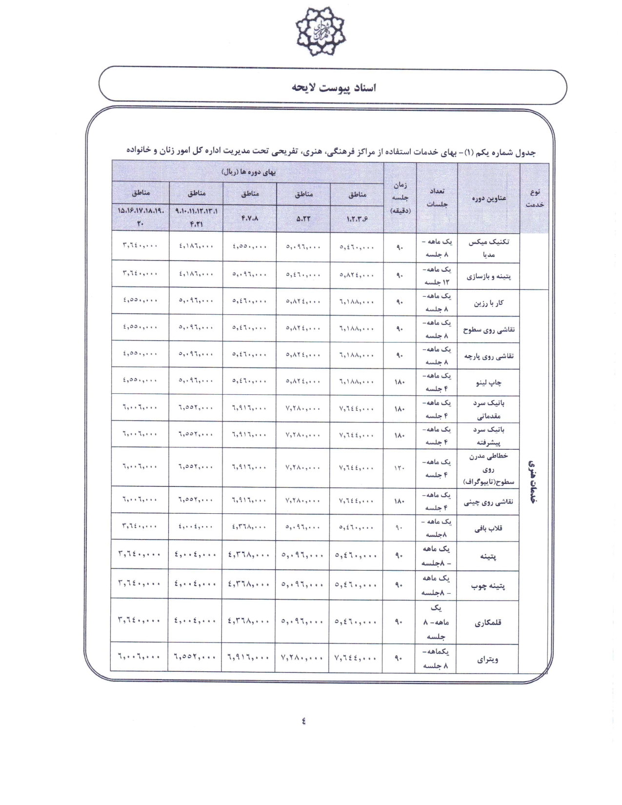 تعيين بهاي خدمات استفاده از مراكز فرهنگي، هنري و تفريحي خدمات قابل ارائه در مراكز تحت مديريت مركز زنان و خانواده شهرداري تهران از سال 1404