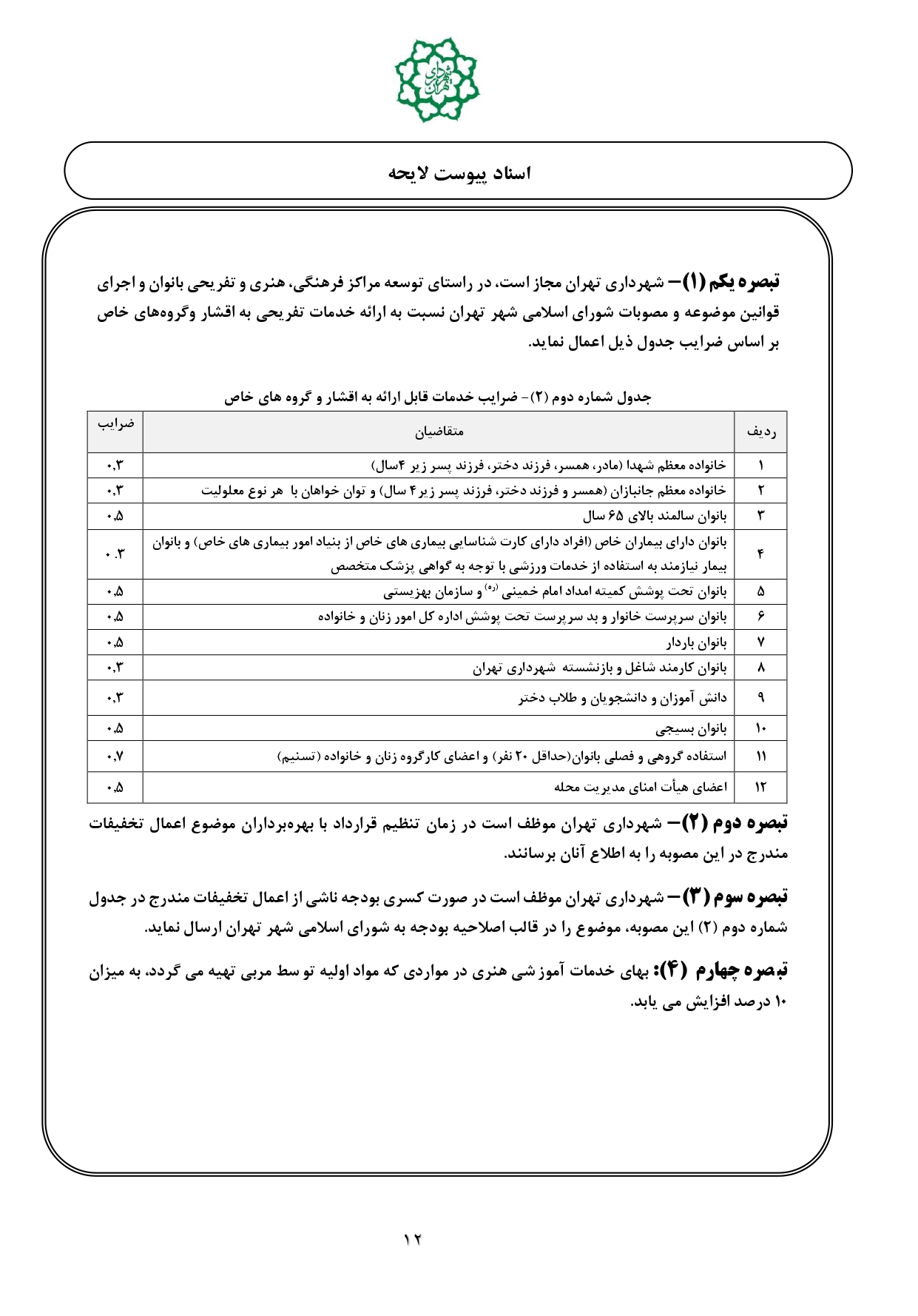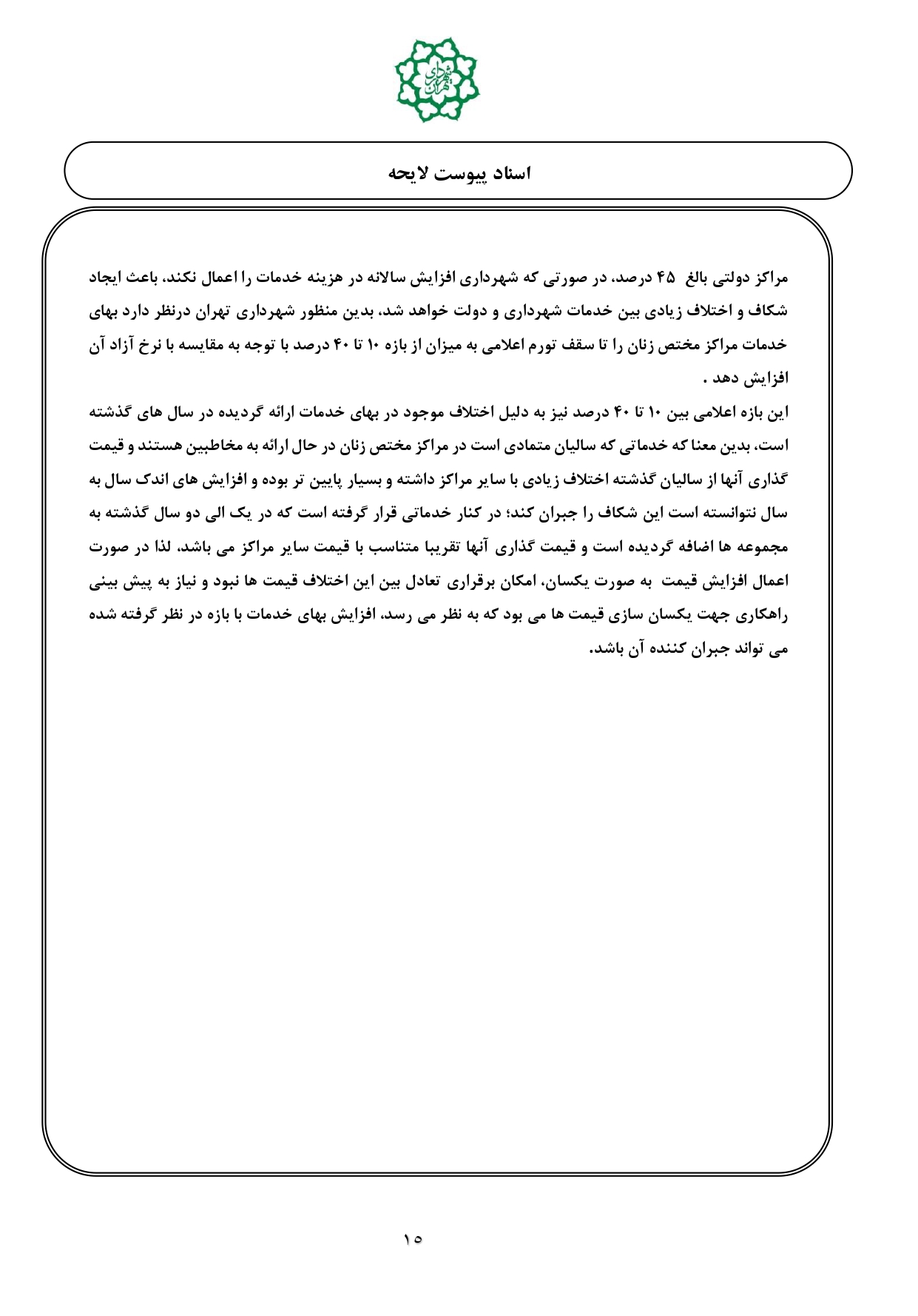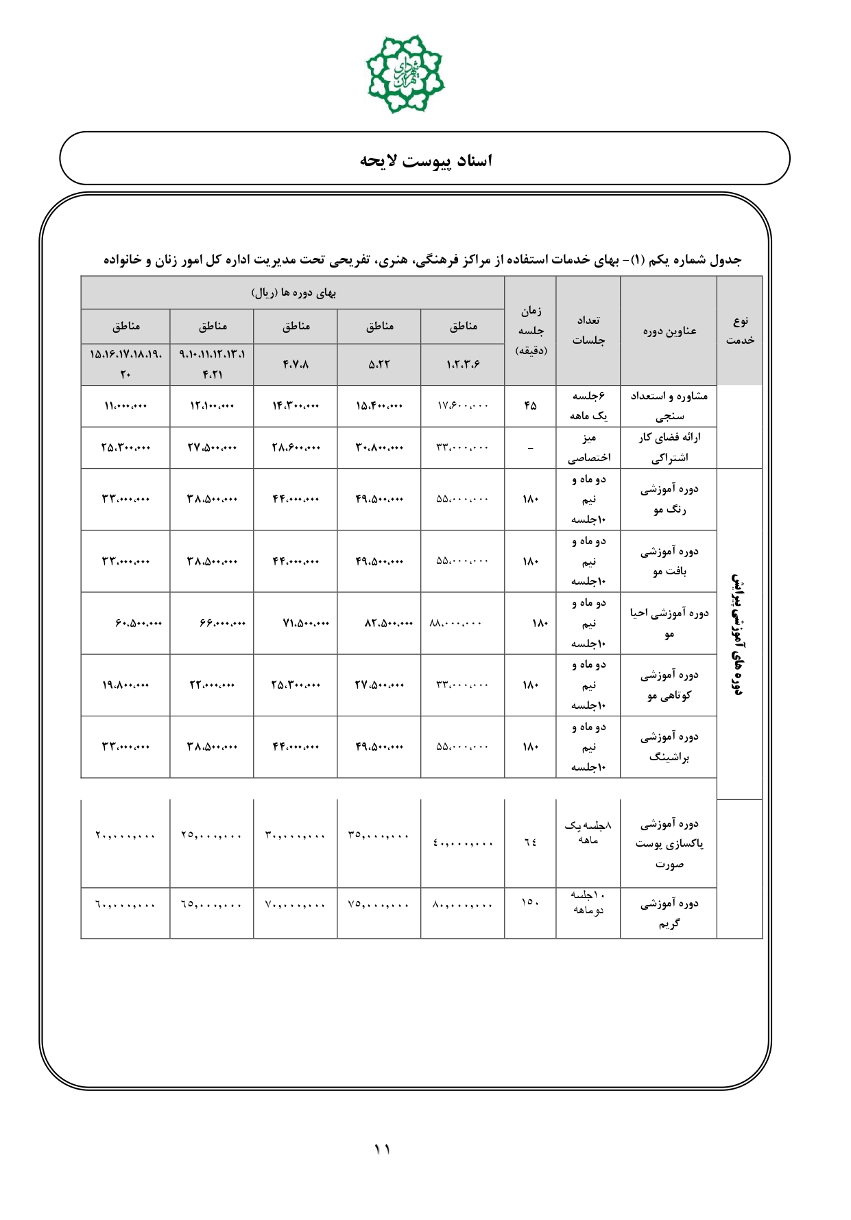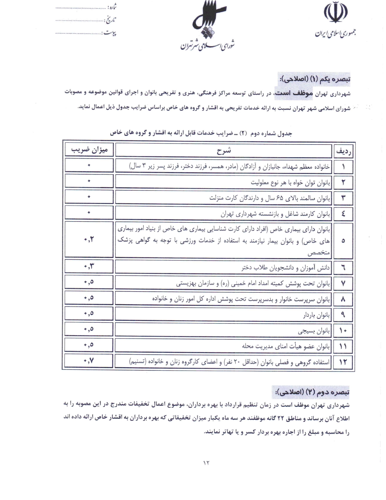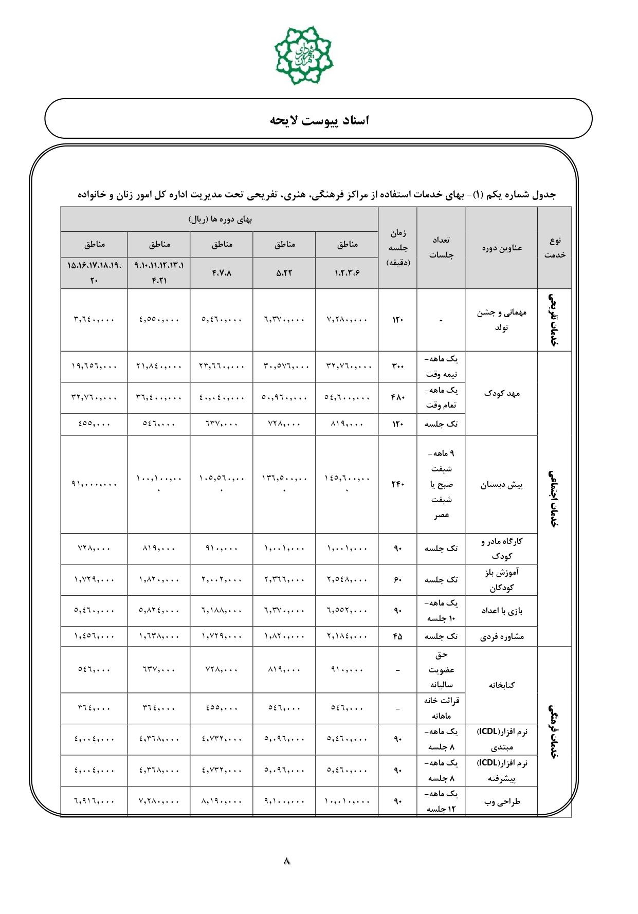 تعيين بهاي خدمات استفاده از مراكز فرهنگي، هنري و تفريحي خدمات قابل ارائه در مراكز تحت مديريت مركز زنان و خانواده شهرداري تهران از سال 1404