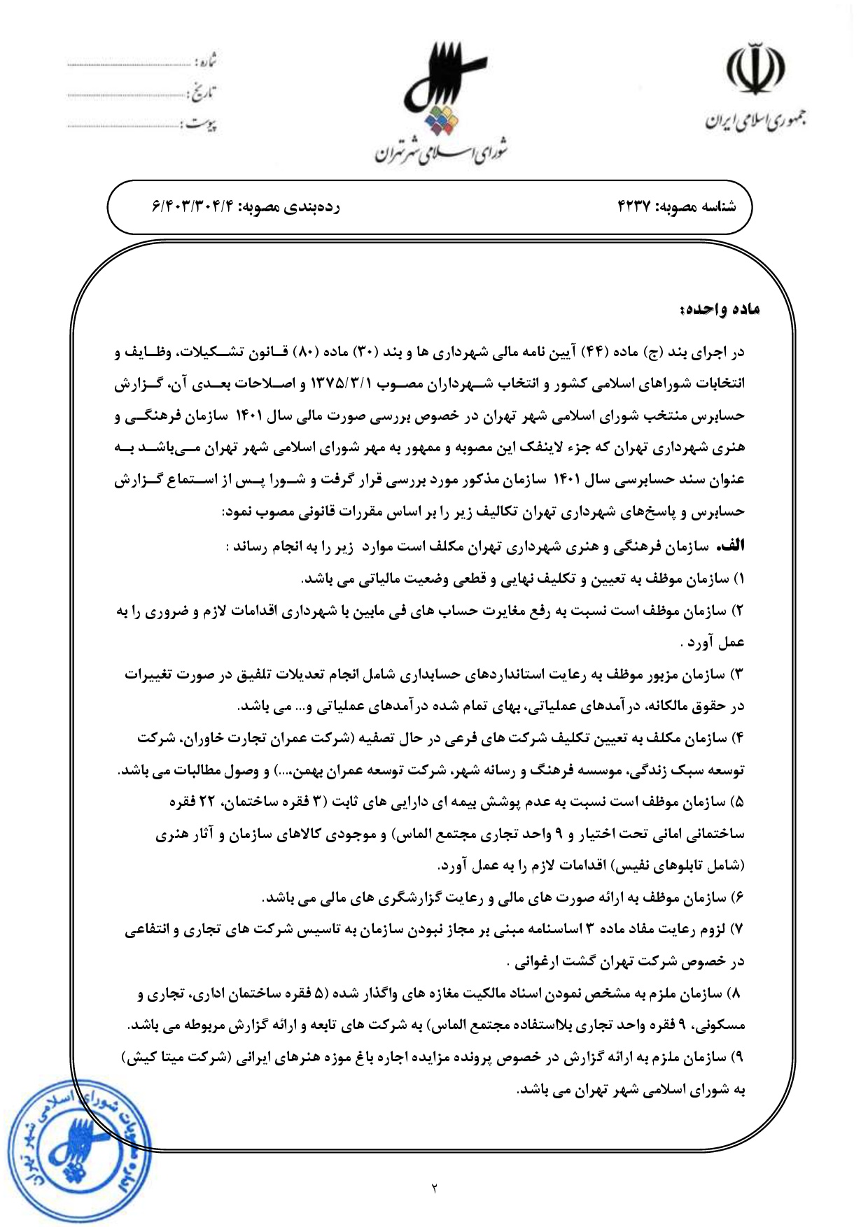 گزارش حسابرسي سال مالي 1401 سازمان فرهنگي و هنري شهرداري تهران