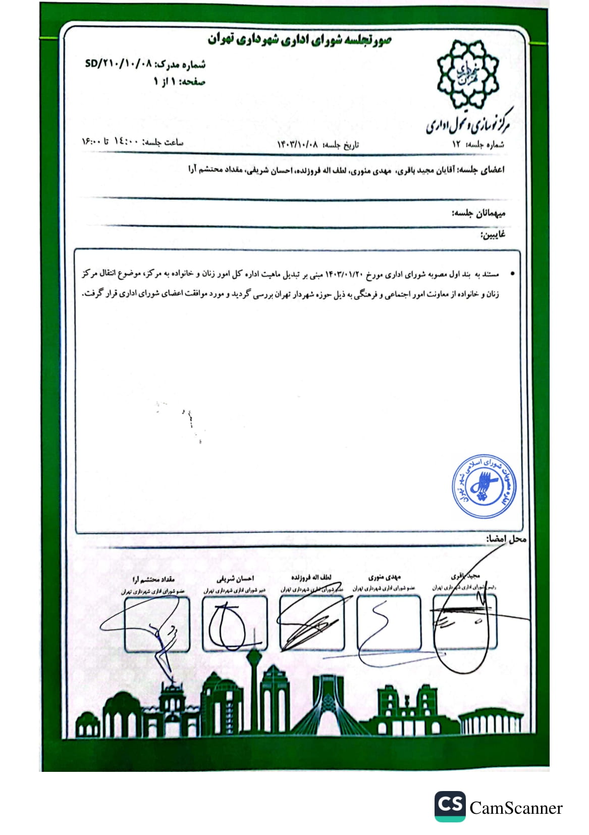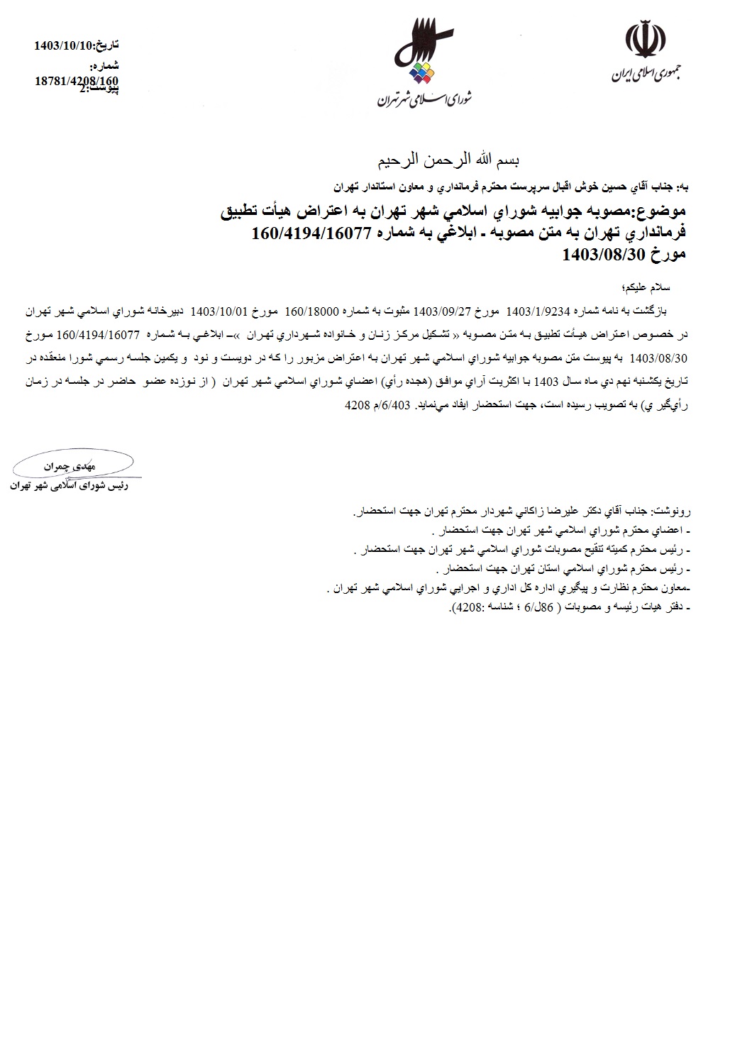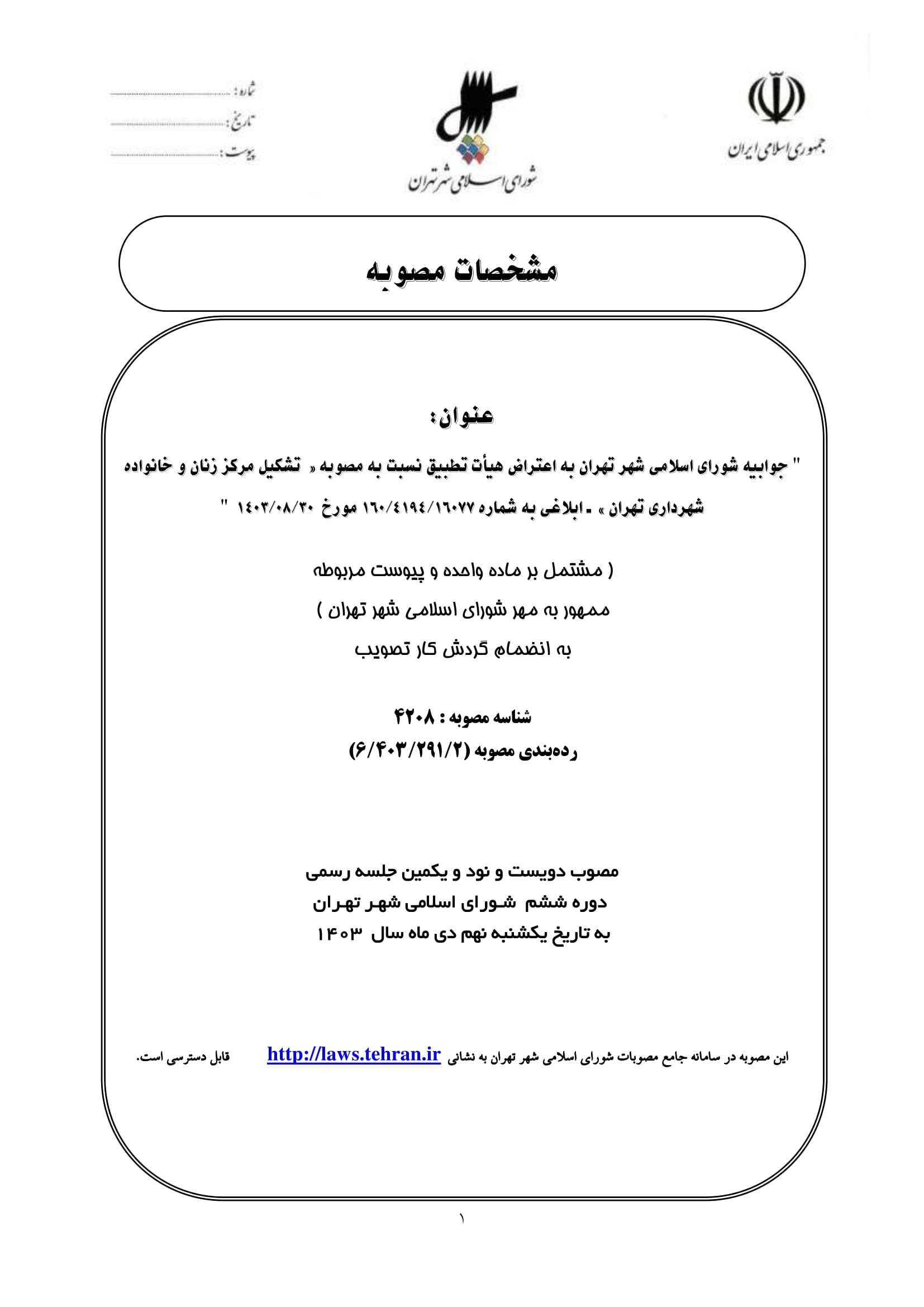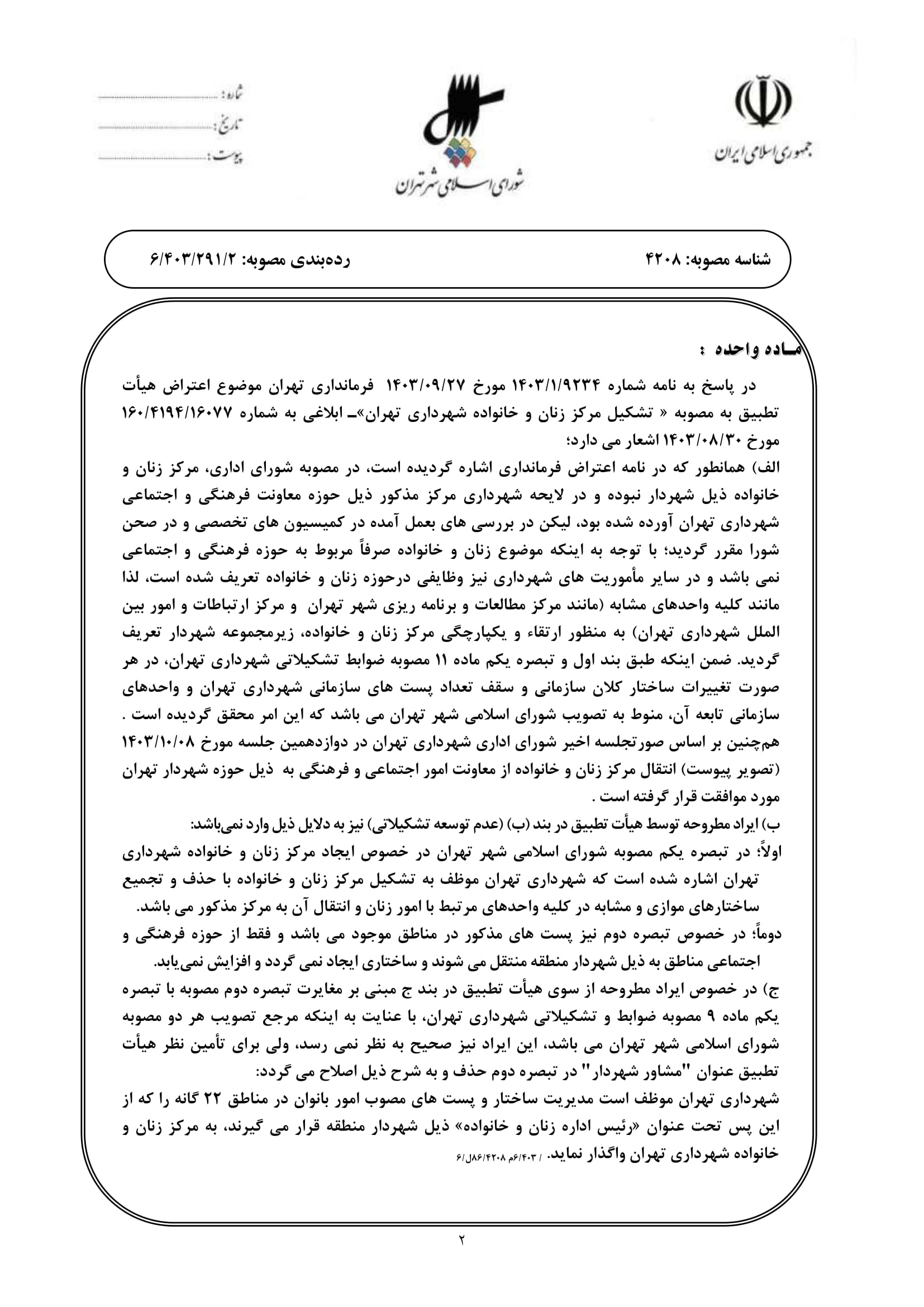 جوابيه شوراي اسلامي شهر تهران به اعتراض هيأت تطبيق نسبت به مصوبه «تشكيل مركز زنان و خانواده شهرداري تهران» - ابلاغي به شماره 160/4194/16077 مورخ 1403/08/30