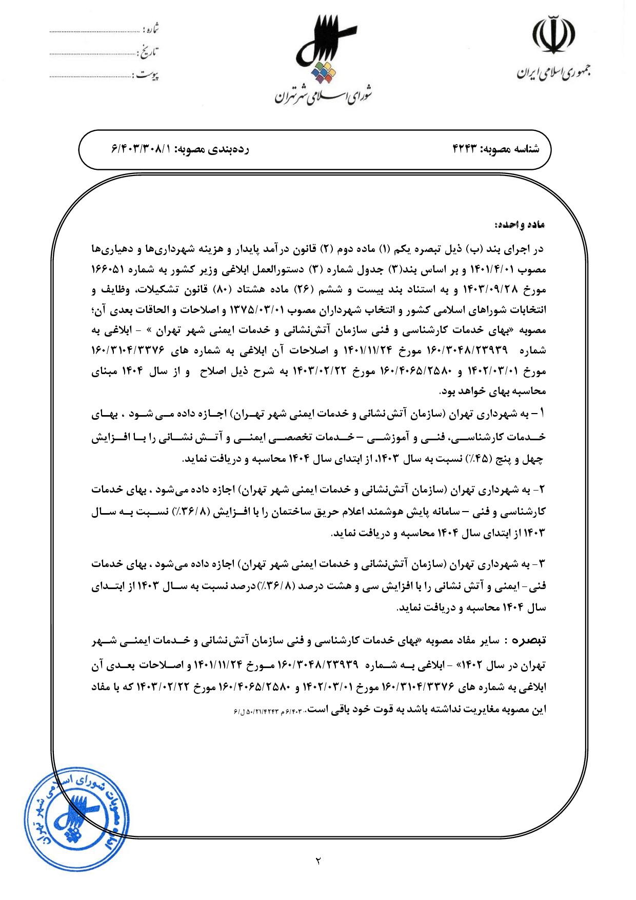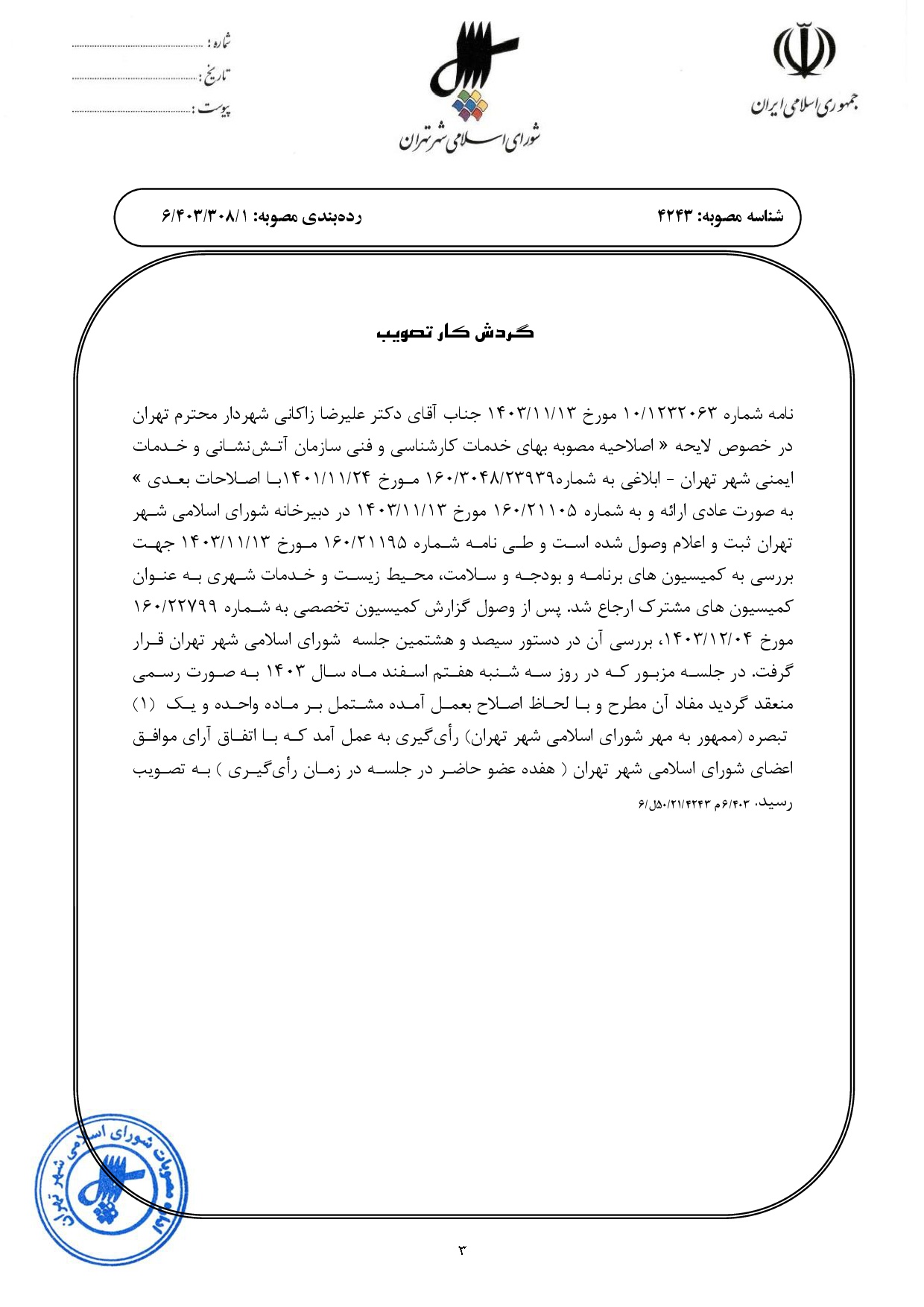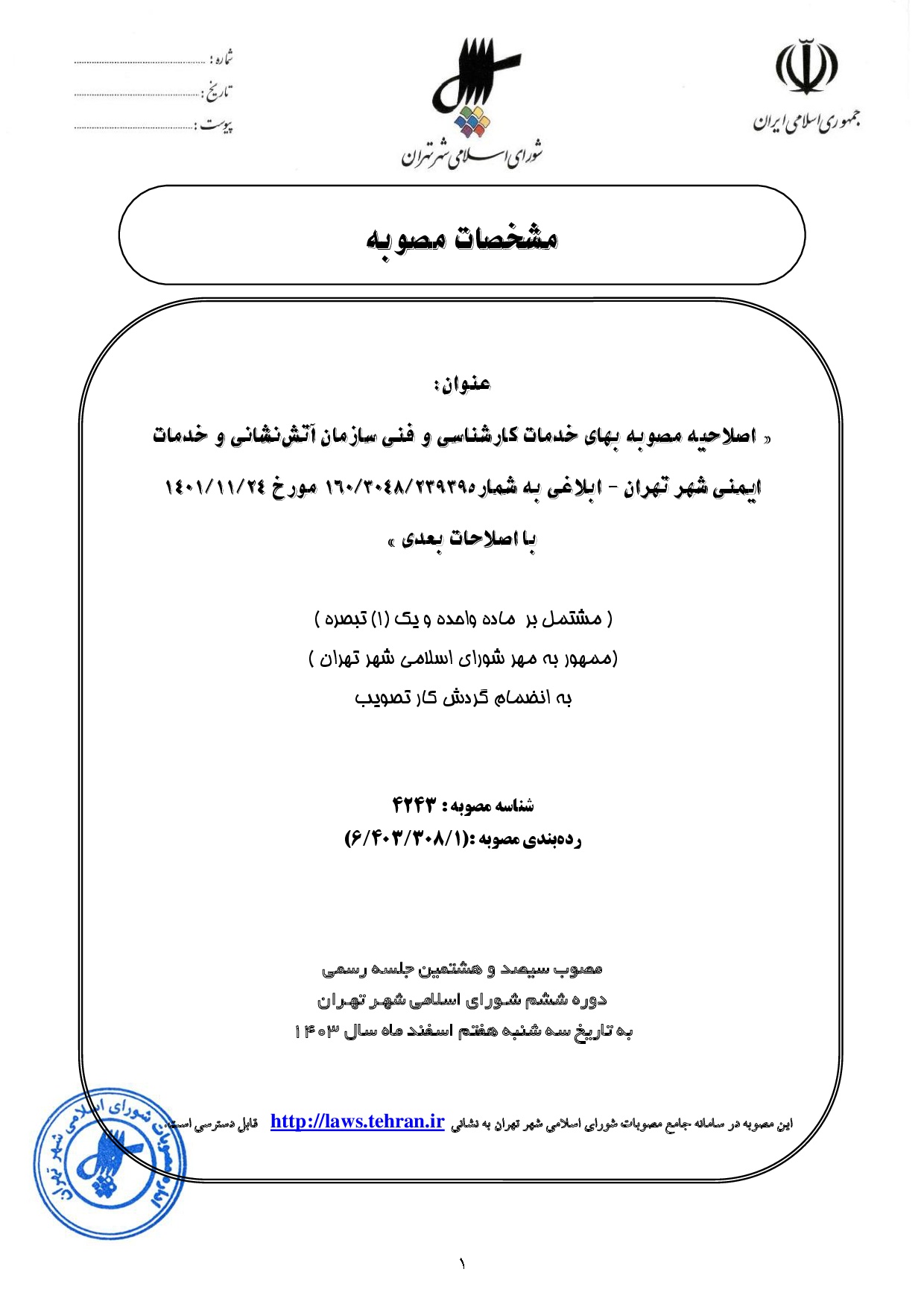 اصلاحيه مصوبه «بهاي خدمات كارشناسي و فني سازمان آتشنشاني و خدمات ايمني شهر تهران» - ابلاغي به شماره 160/3048/23939 مورخ 1401/11/24 با اصلاحات بعدي