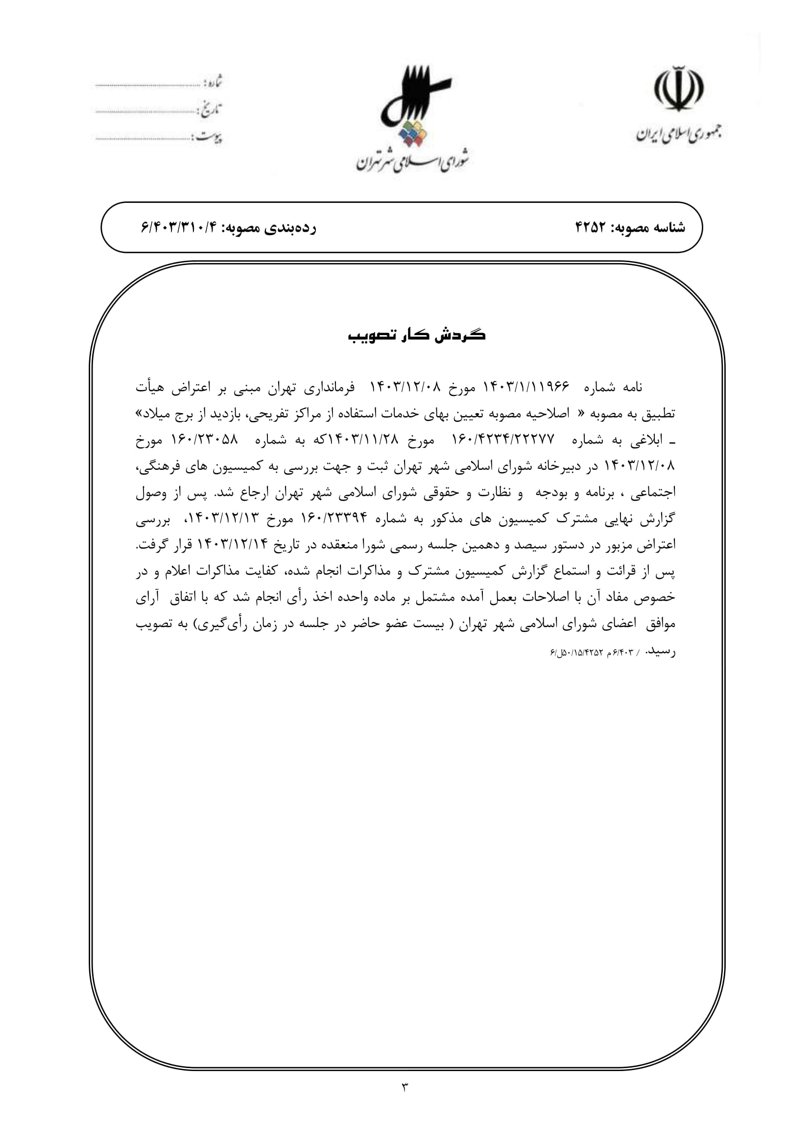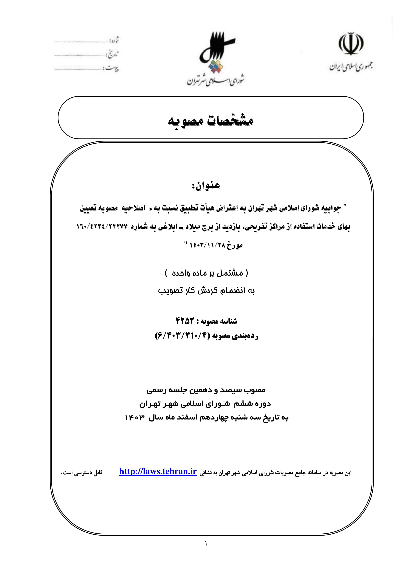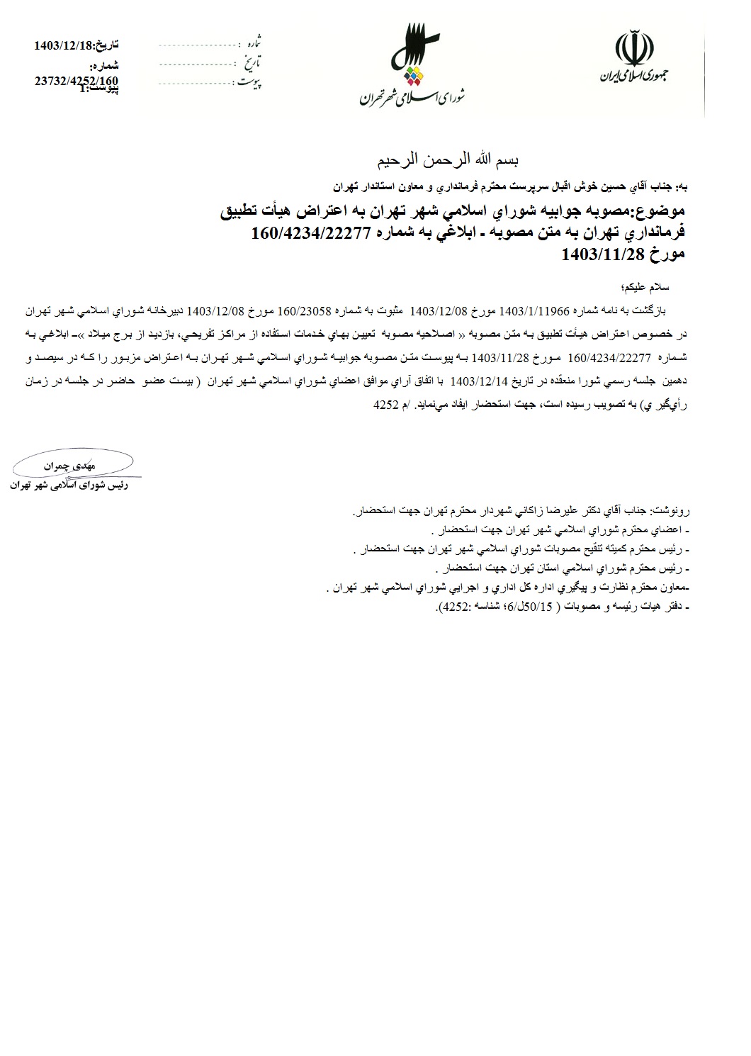 جوابيه شوراي اسلامي شهر تهران به اعتراض هيأت تطبيق نسبت به «اصلاحيه مصوبه تعيين بهاي خدمات استفاده از مراكز تفريحي، بازديد از برج ميلاد» ـ ابلاغي به شماره 160/4234/22277 مورخ 1403/11/28
